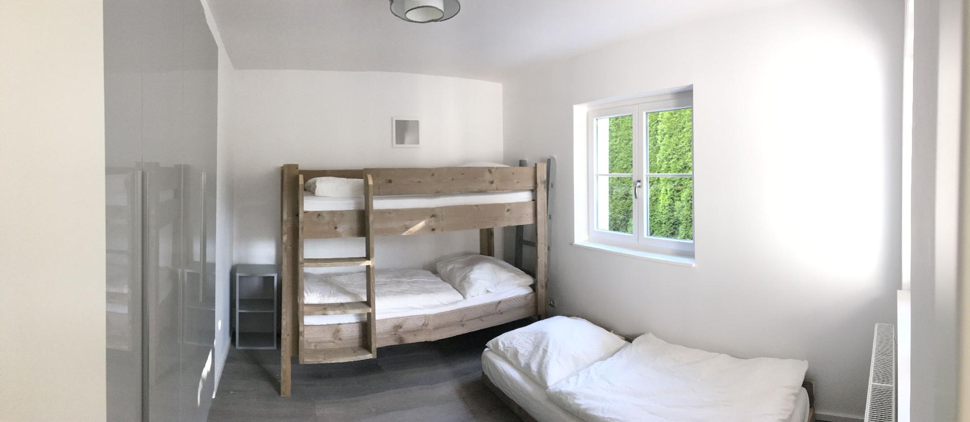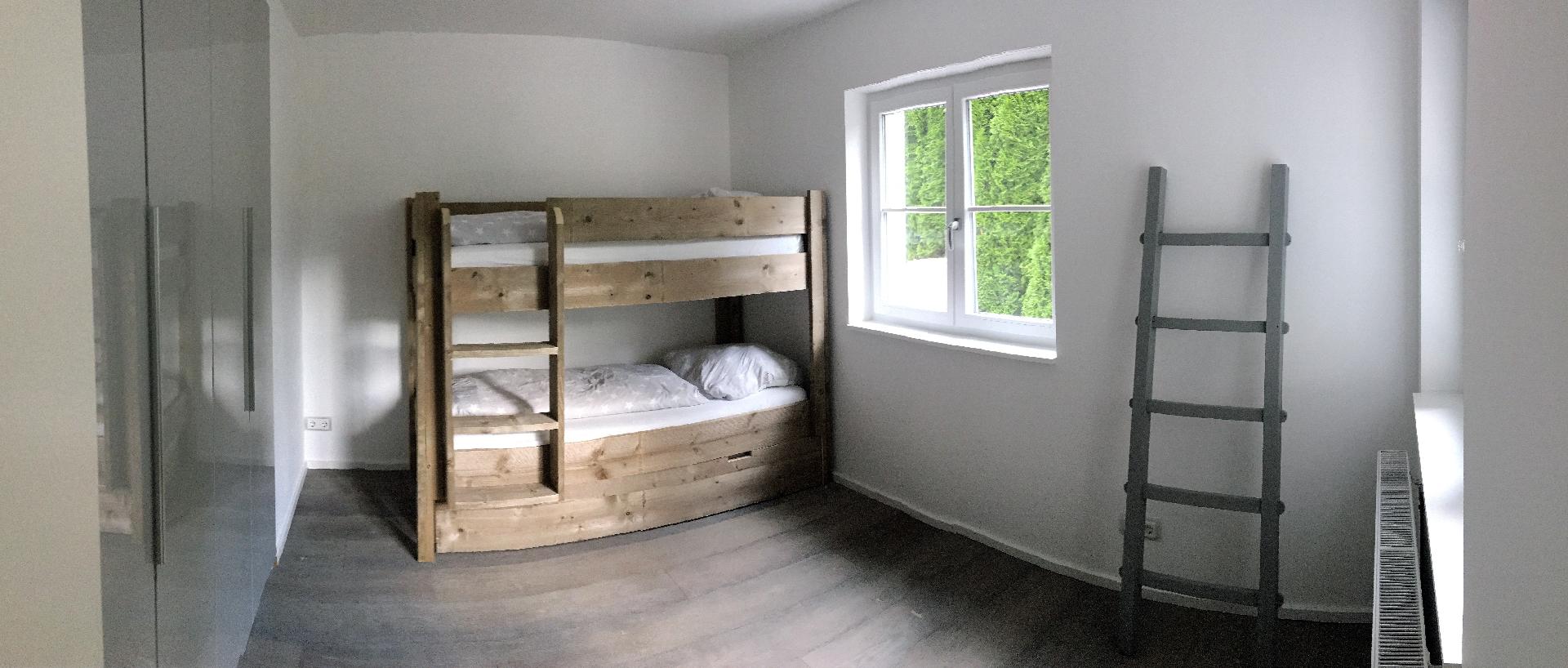 • 2. Schlafzimmer mit alpenländisch designten Hochstockbetten 2x90x200 cm und zusätzlich ausziehbarer Matratze