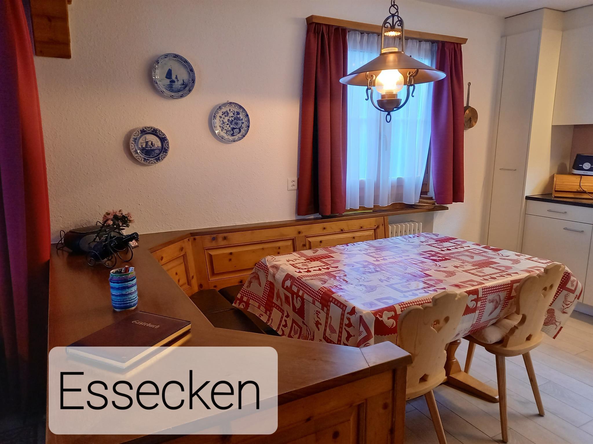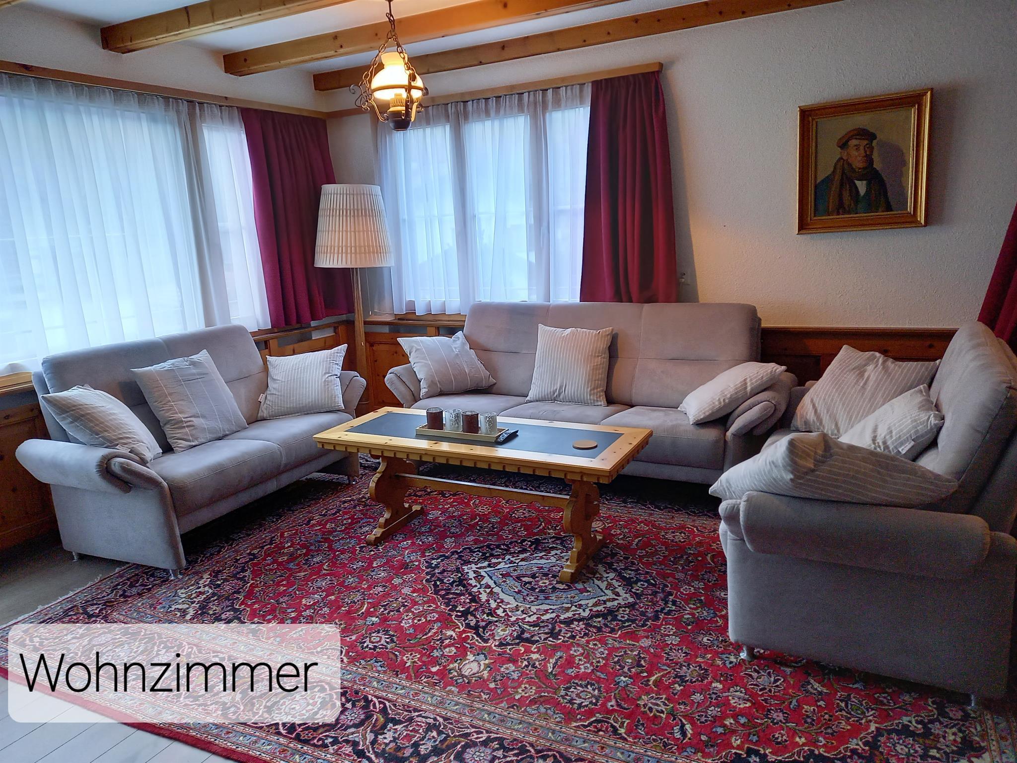 Komfortable 4 1/2 Zimmerwohnung (120m2); Garage + Autoabstellplatz 2-3 PW; gedeckter Sitzplatz mit Gartenmöbeln; beheizbare Ski und Skischuhschran k beim gedeckten Hauseingang; Wohnraum mit ausziehbar Doppelcouch, gemütlich eingerichtete Wohnlandschaft mit Cheminée, Fernseher, WLAN; gut ausgestattet Küche mit Elektro Herd, Backoffen, Mikrowelle, Kaffeemaschine Kühlschrank mit kleinem Gefrierfach, Geschirrwaschmaschine Küchenwäsche, großer Tisch- Eckbank; 6-8 Betten eingeteilt in 3 Doppelschlafzimmer (Bett-Frottewäsche gegen Gebühr); Badewanne mit Duschwand, Waschmaschine, WC: separat WC; Dusche & WC im Untergeschoss; Kinderbett- Kinderstuhl (Trip-Trap) auf Anfrage; ganze Wohnung ist mit Plattenboden und Laminat Belag; Haustiere nach Absprache.