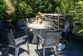 Im Erdgeschoss liegt die rustikale Küche mit Essbereich, die direkt in den Garten unter die Pergola führt. Eine steile Aussentreppe verbindet die oberen Etagen mit je einem Schlafzimmer und Balkon. Ein von Palmen umgebener Sitzplatz lädt zum Verweilen ein.