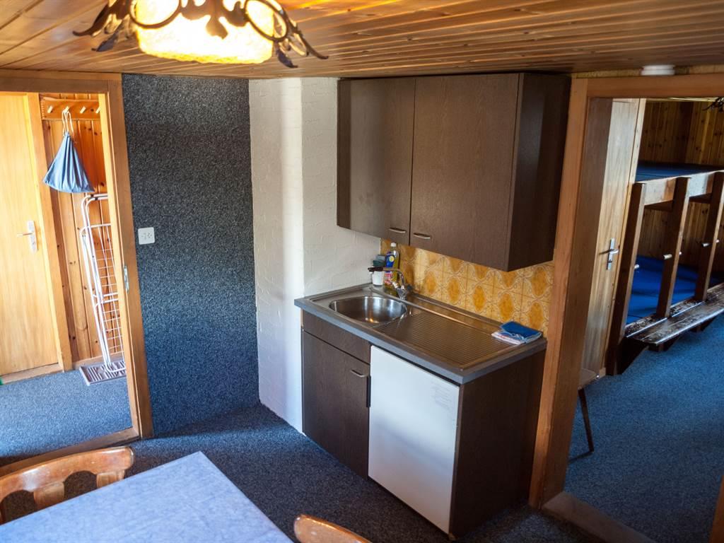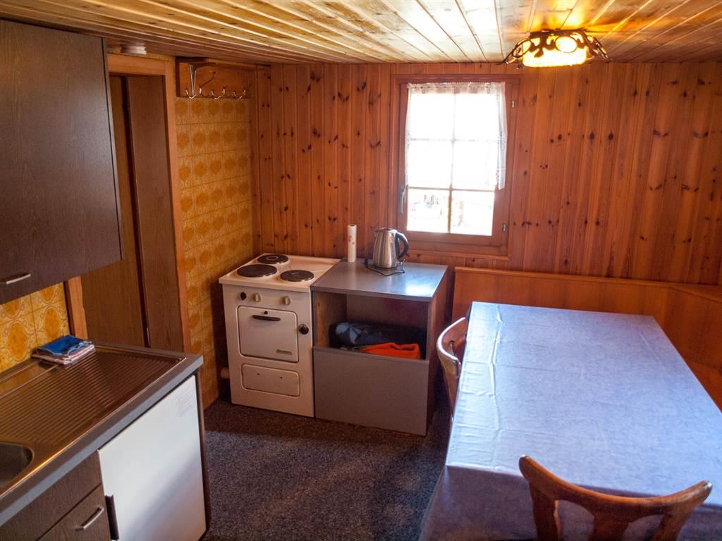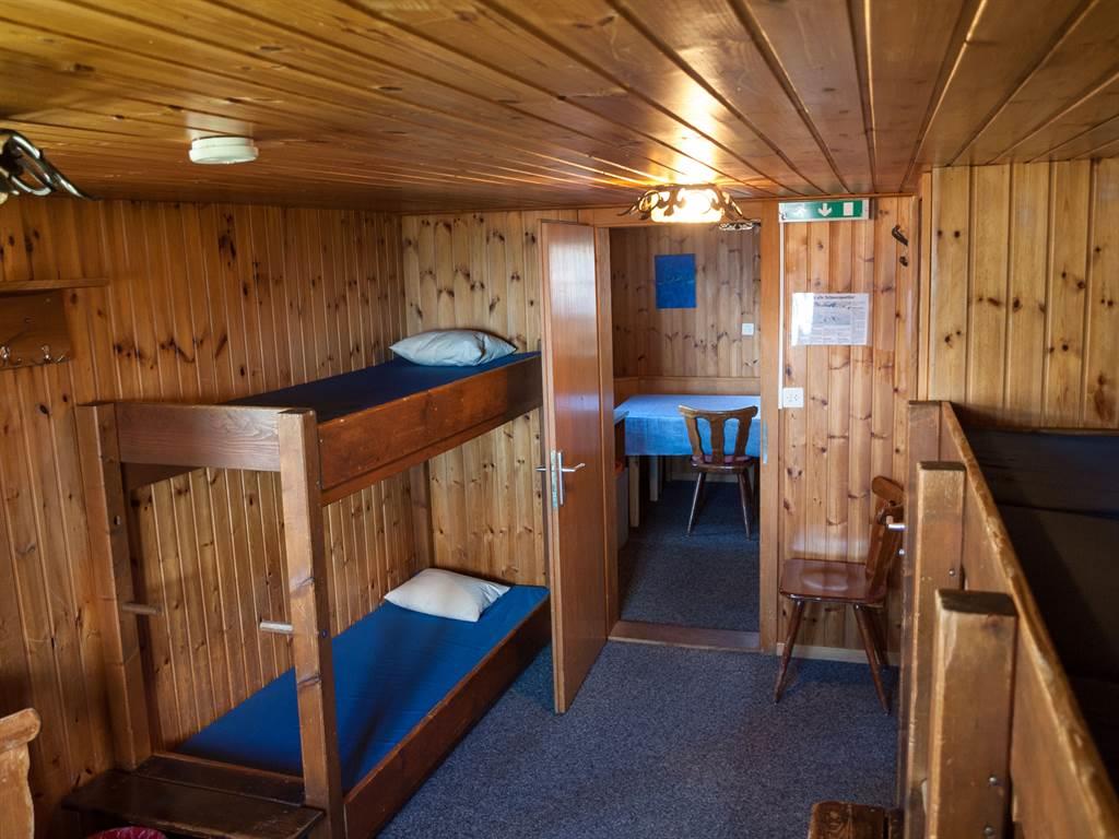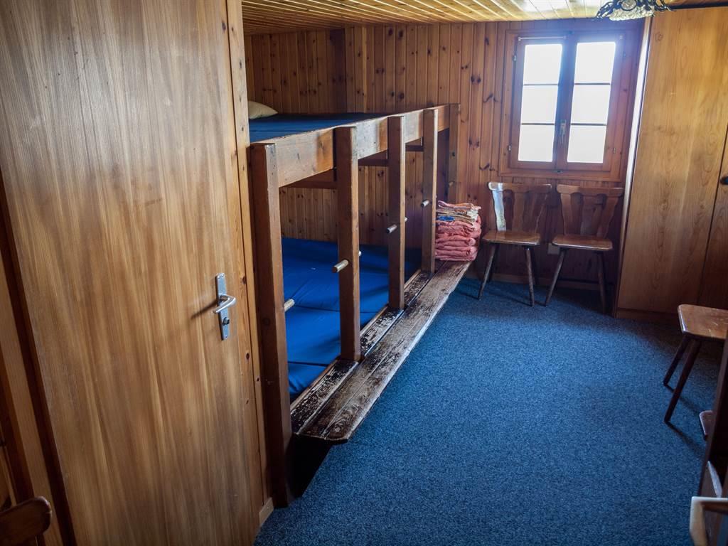 Auf dem 1. Stock ist ein Schlafraum à 10 Betten. Sie übernachten in Etagenbetten. Zudem ist ein WC mit Dusche vorhanden. Eine kleine Küche mit Essraum bietet Platz für 10 Personen. In der Regel verbringen Sie die Nacht im mitgebrachten Schlafsack. Auf Anfrage können wir Ihnen Bettwäsche offerieren.