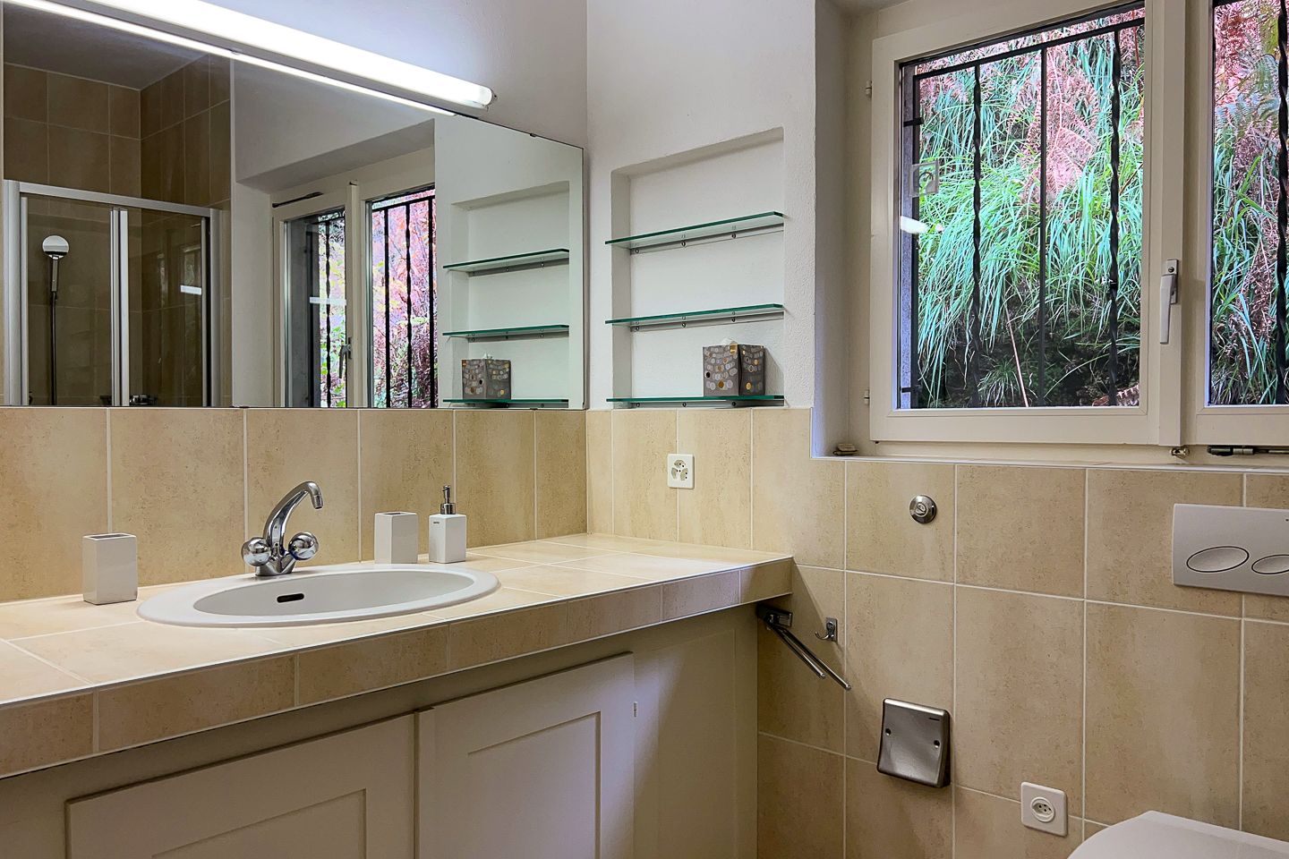 Nach dem Aufstieg zur Wohnung öffnet sich der Blick auf die Riviera del Gambarogno – ein Panorama, das man nicht so schnell vergisst. Dank der sonnigen Südlage scheint die Sonne von morgens bis abends in den Garten und auf die Terrasse. Gleichzeitig bleibt das Haus angenehm kühl, da es direkt in den Bergfelsen am Waldrand hineingebaut ist. Wer hier ankommt, spürt sofort Ruhe und Weite.