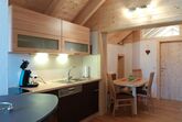 FeWo HÜTTENZAUBER, 45m2, Vorraum, 1 Schlafzimmer, Wohnraum mit Essbereich, Küchenbereich (Ceranfeld, Backrohr, Geschirrspüler, Kaffeemaschine, Toaster, Eierkocher), Dusche mit WC, Kaminofen als Raumteiler für den gemütlichen Wohnbereich mit Gartnerkofelblick, Couch, SAT TV, und kleinem Balkon