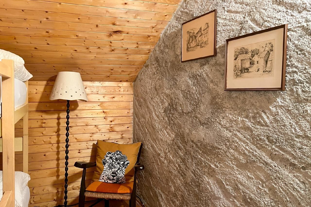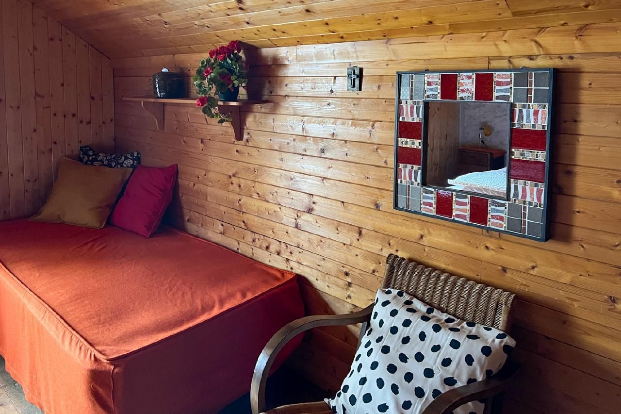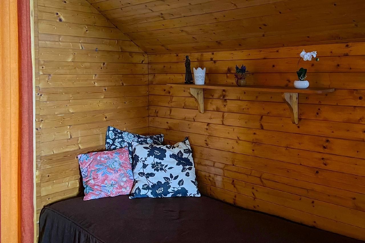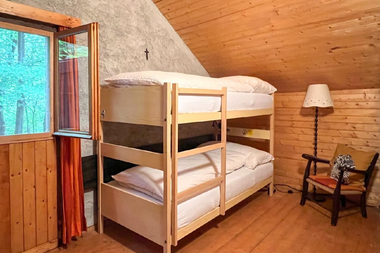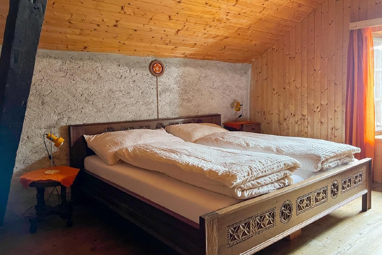 Im Erdgeschoss befinden sich die offene Küche mit Feuerstelle und ein grosser Essbereich. Im Obergeschoss liegt ein Schlafzimmer mit Doppelbett sowie ein kleineres Zimmer mit Etagenbett – ideal für Paare, Familien oder kleine Gruppen.