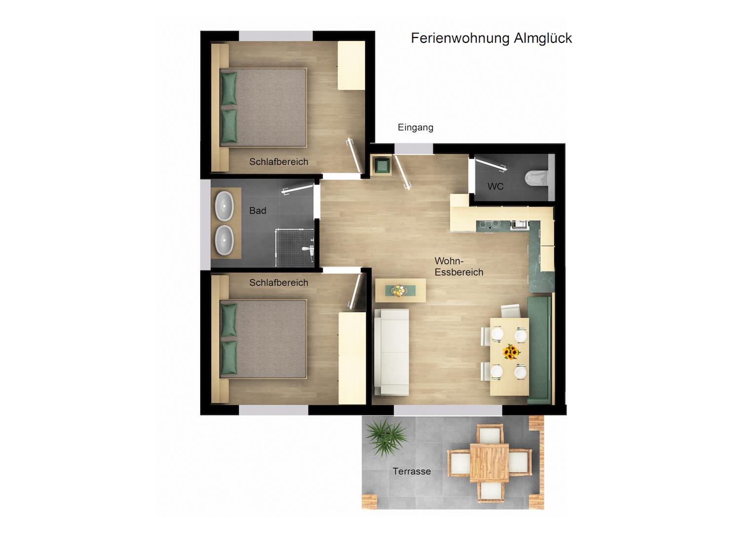 Ferienwohnung ALMGLÜCK im Erdgeschoss für 4 Personen und überdachter Terrasse Richtung Süden