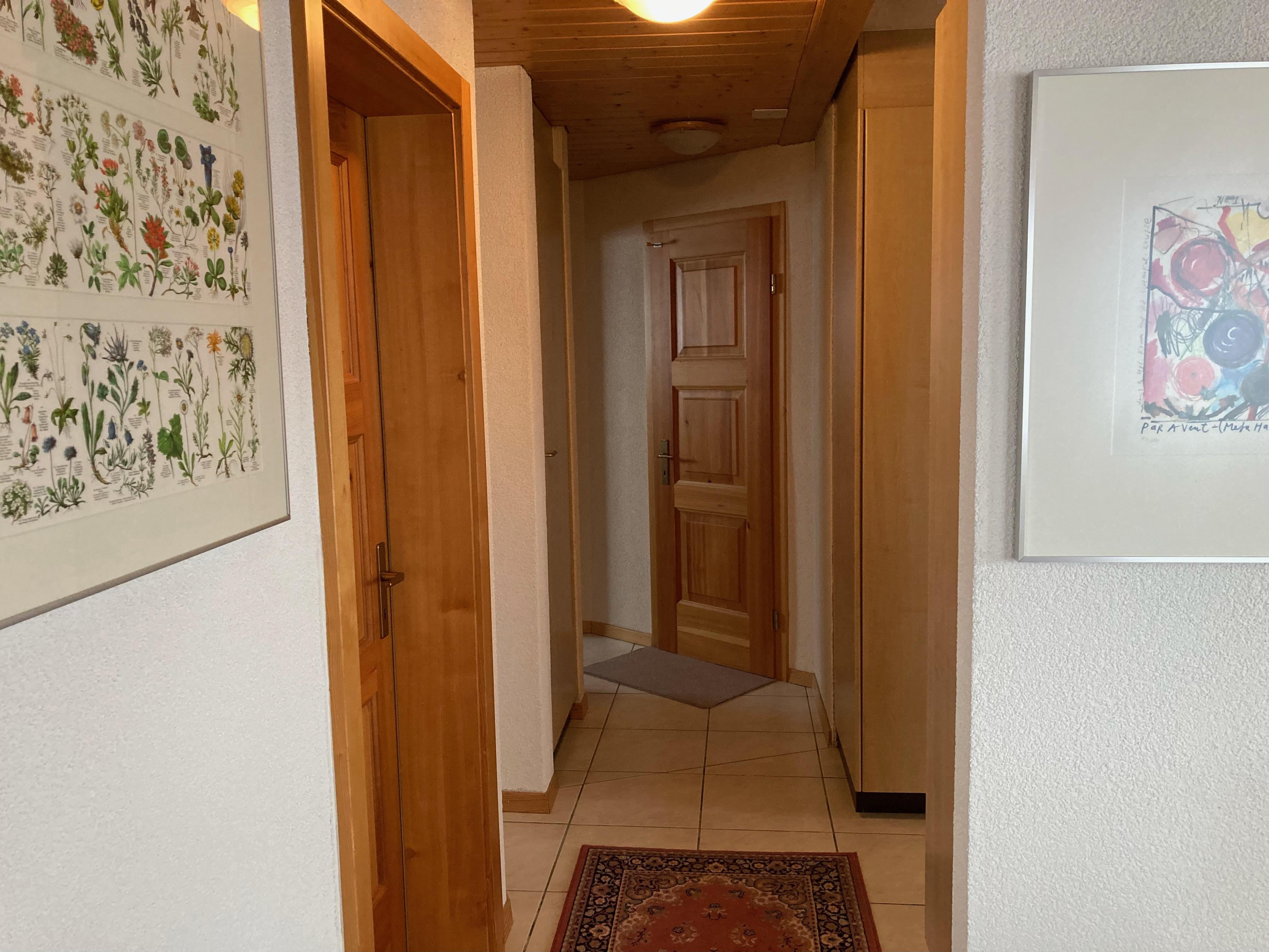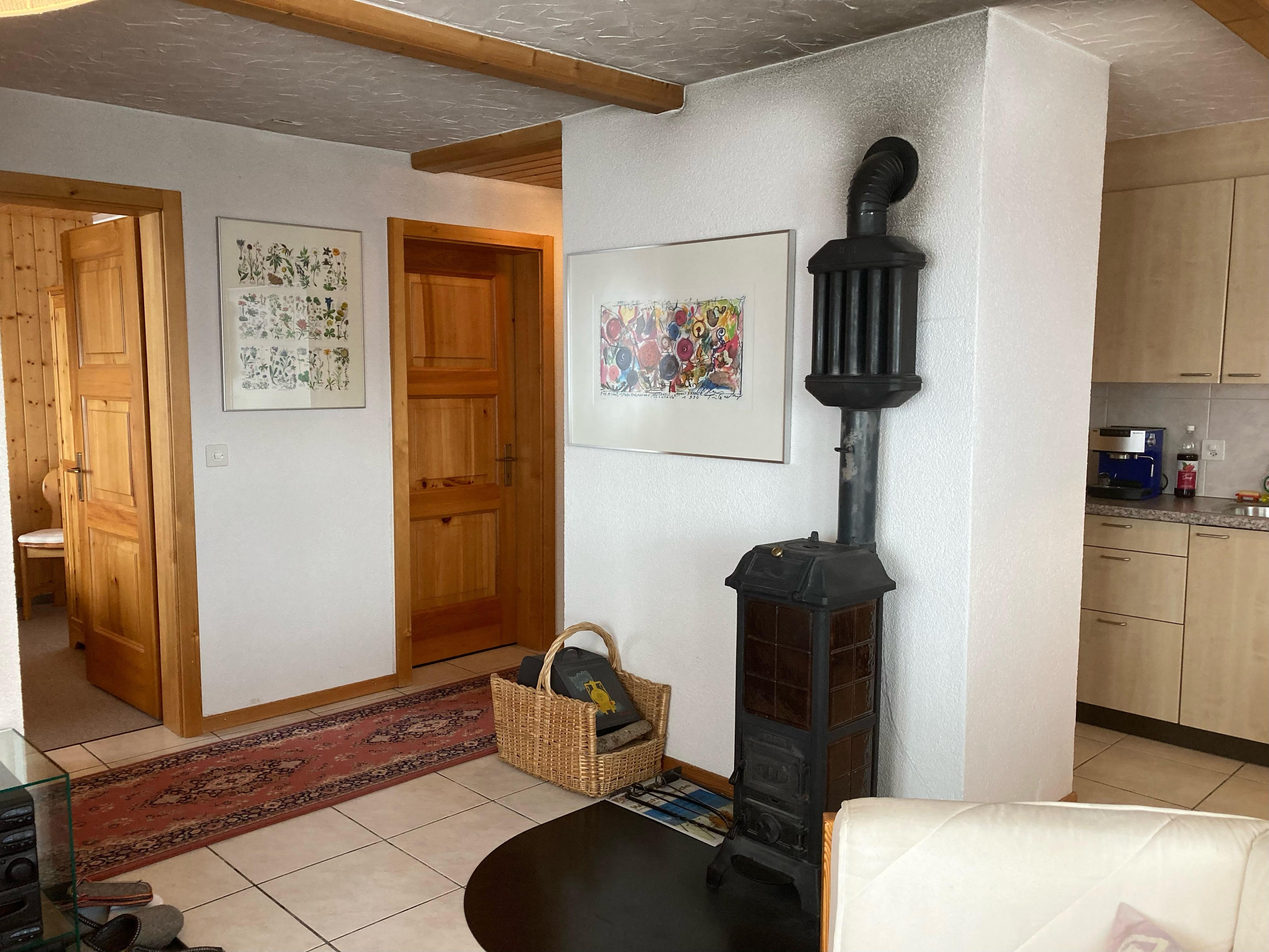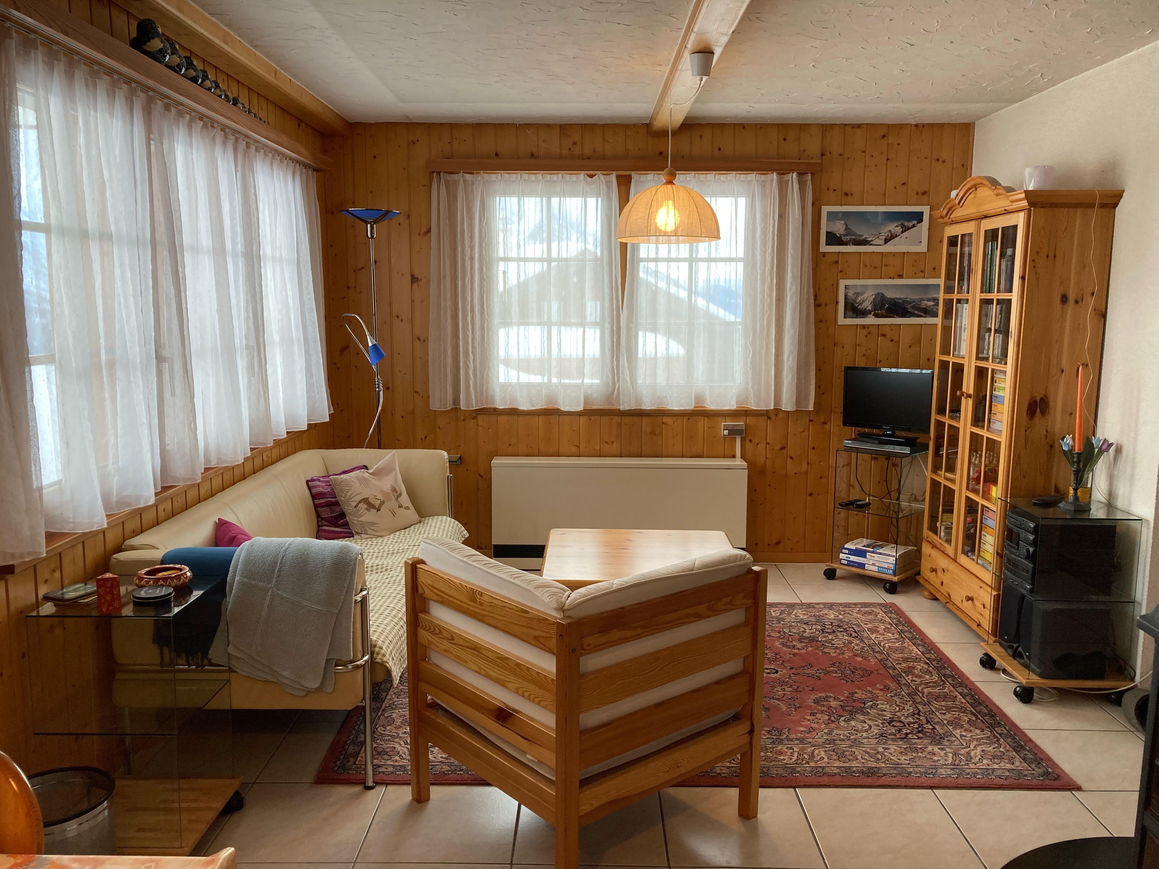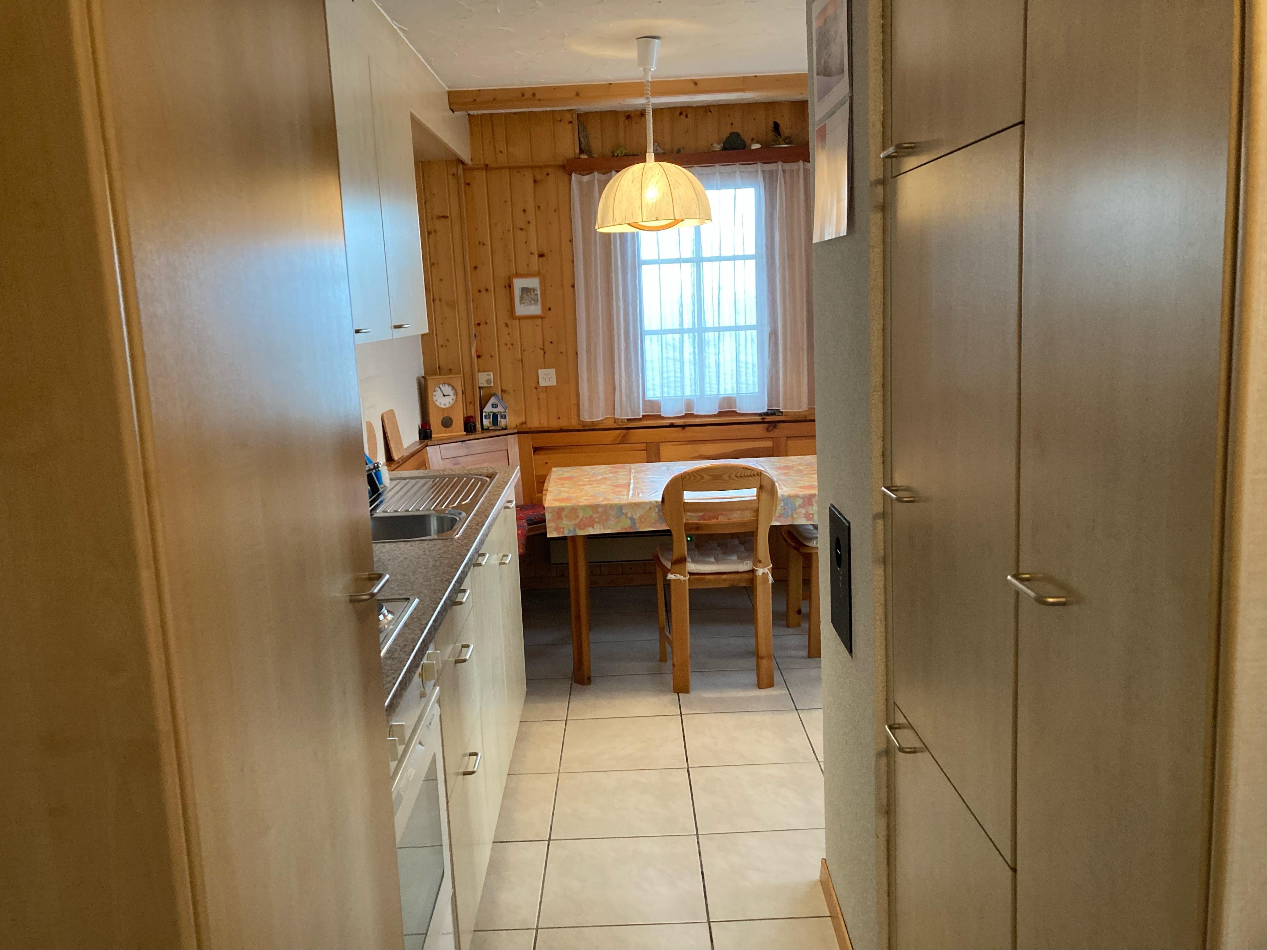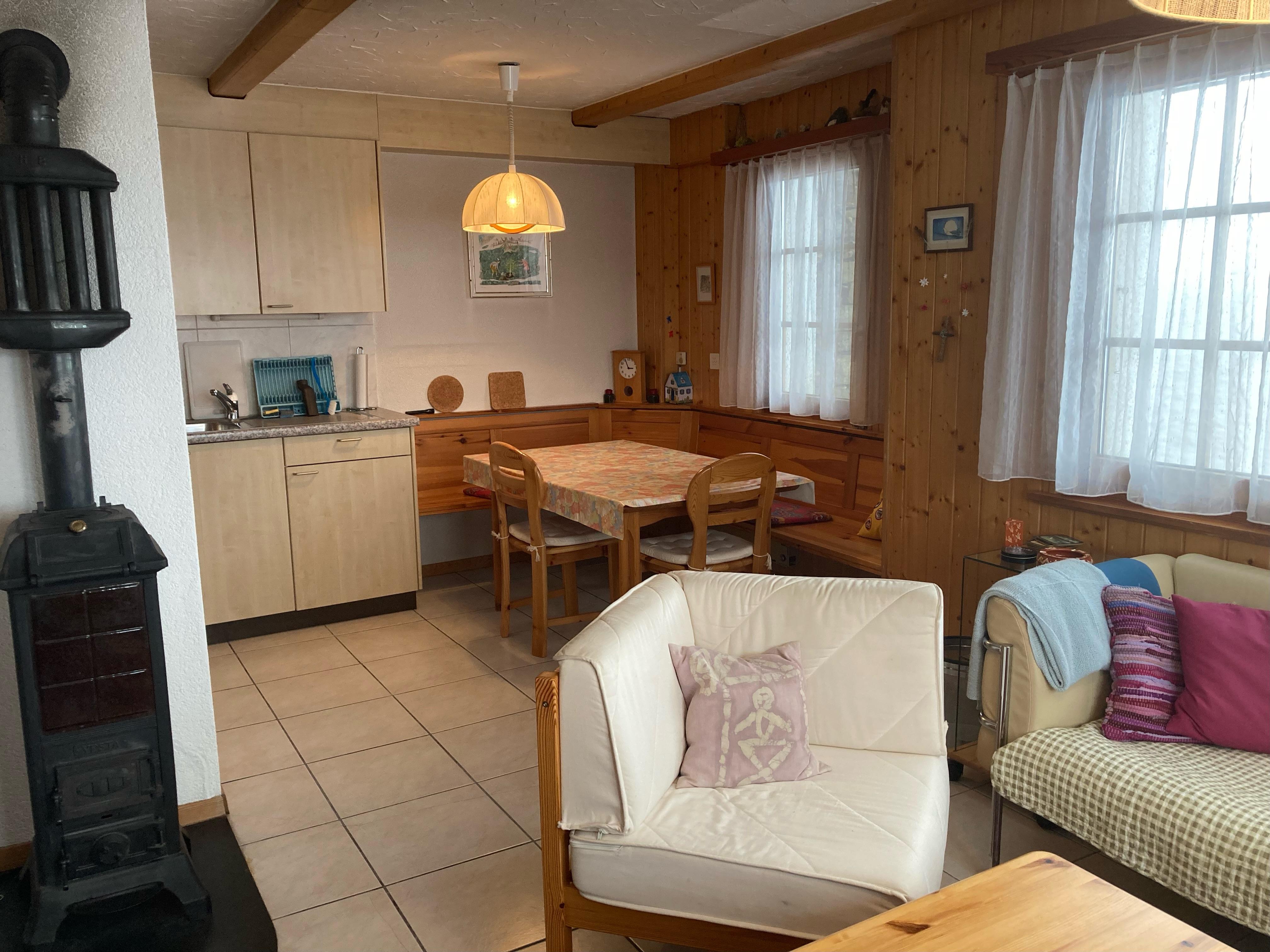 3.5-Zimmerwohnung befindet sich im Parterre eines Mehrfamilienhaus. Ruhige, idyllische Lage mit schöner Aussicht. Vorplatz mit Esstisch. Die Wohnung verfügt über 2 Schlafzimmer mit je 2 Schlafplätzen, Dusche und WC, gut ausgestattete Küche mit Fondueset. Holzofen darf benutzt werden.