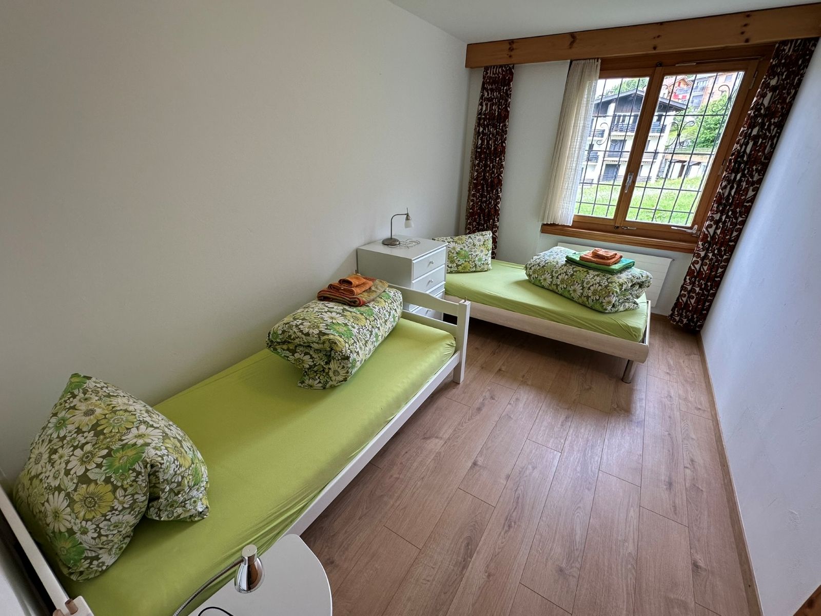Ein Schlafzimmer mit Doppelbett und ein Schlafzimmer mit zwei Einzelbetten. Babybett auf Anfrage. Bettwäsche vorhanden.Wohnzimmer: