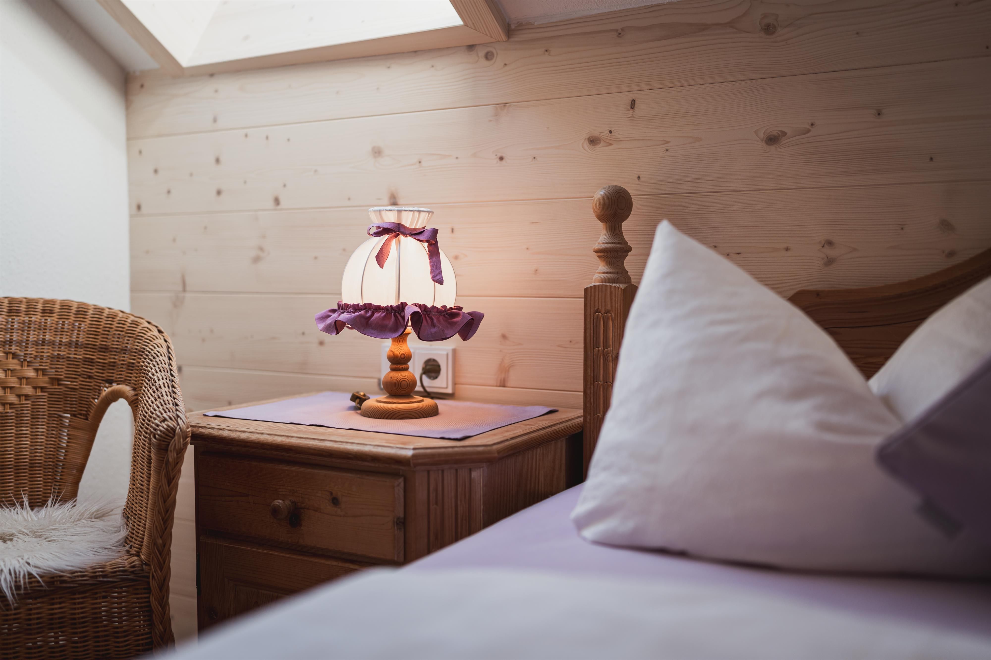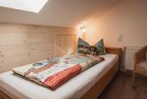 Im Schlafzimmer im Landhausstil lässt es sich herrlich schlummern. Mit seinen warmen Holzpaneelen strahlt es Gemütlichkeit aus und lädt zum Entspannen ein. Ein gemütliches Doppelbett, ein geräumiger Schrank und ein Sessel vervollständigen die Einrichtung. Die Dachflächenfenster lassen das Tageslicht großzügig hereinströmen und verleihen dem Raum eine angenehme Helligkeit.