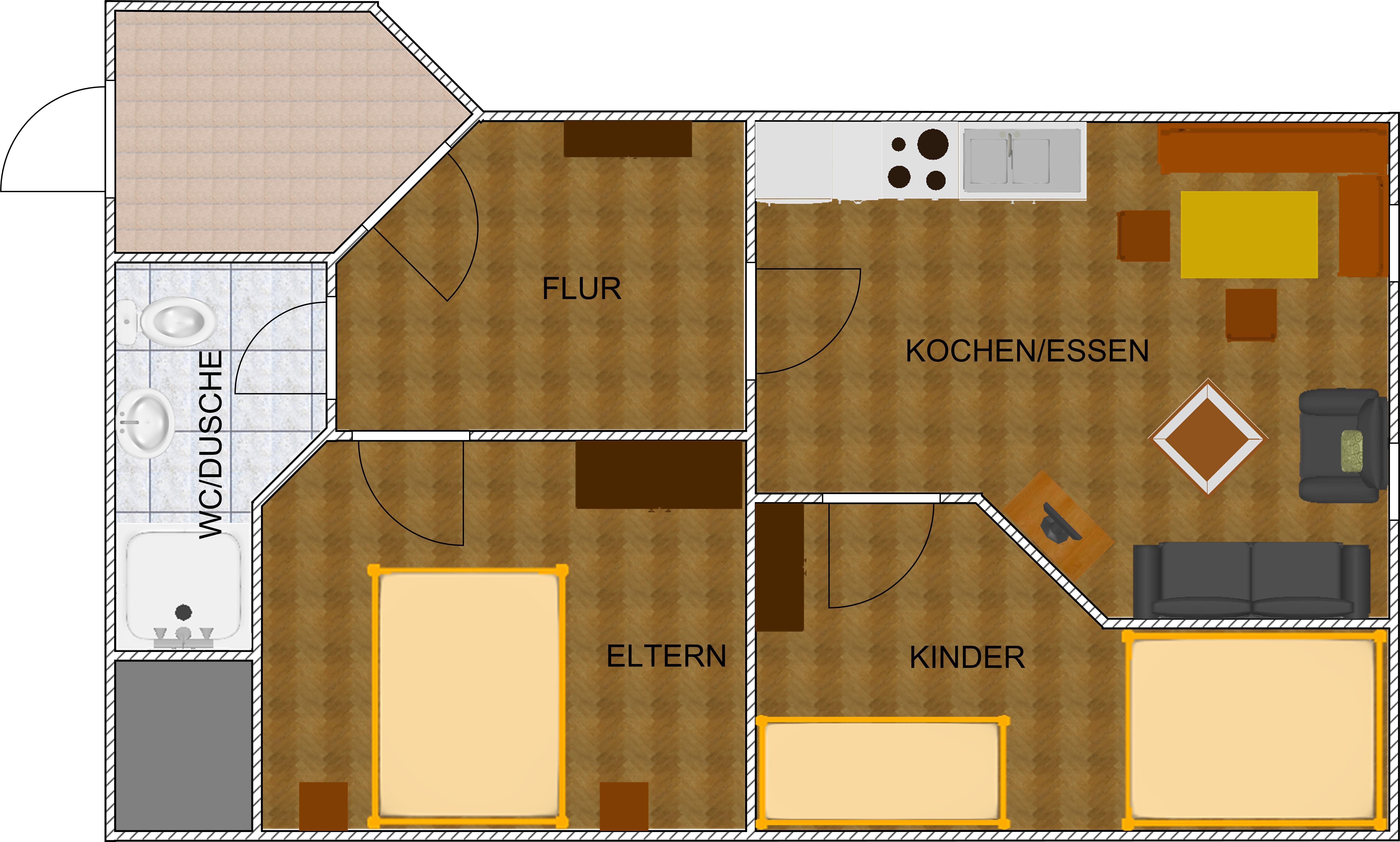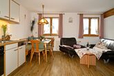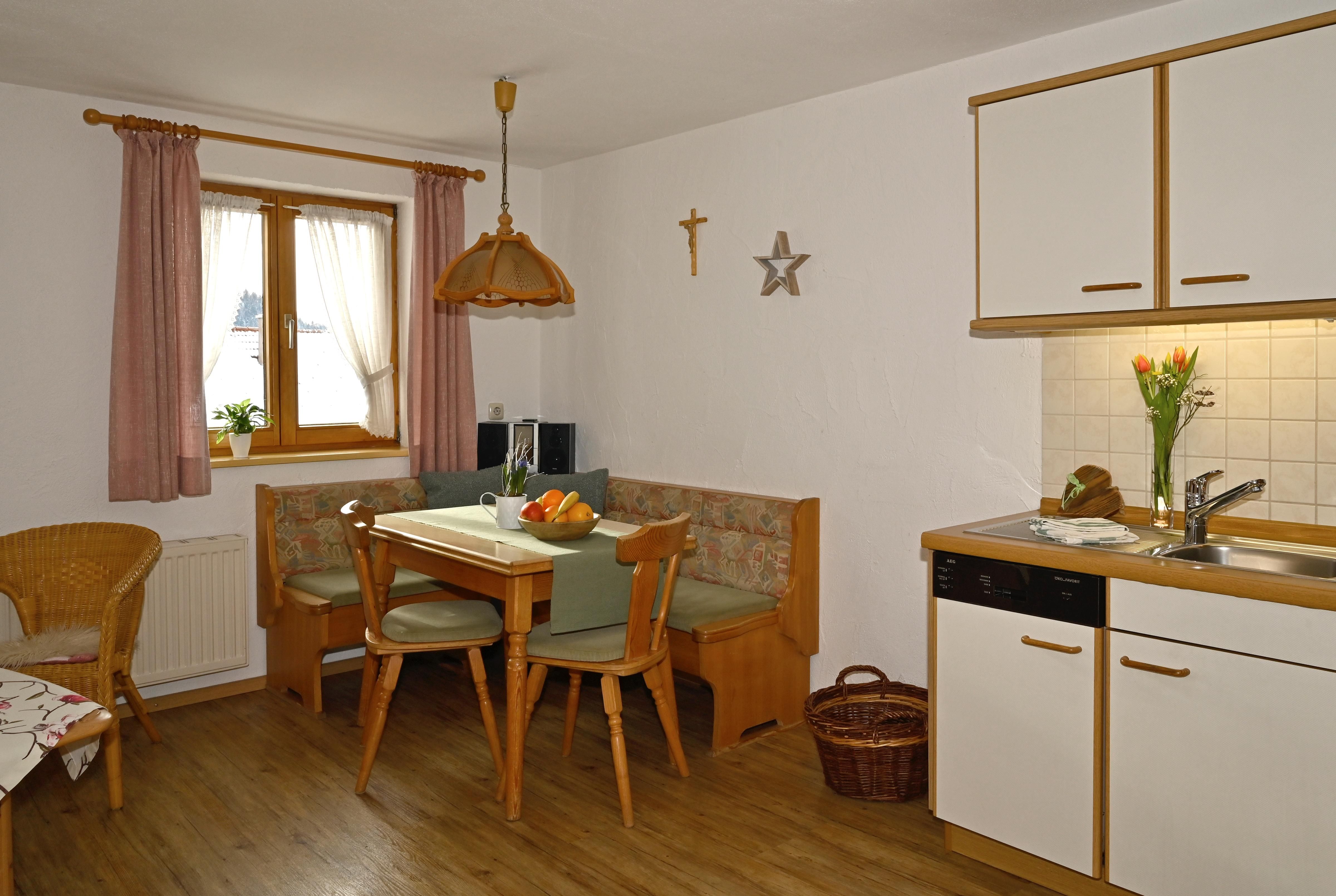 Die großräumige Wohnküche lädt zum Verweilen ein und verfügt über eine gemütliche Essecke, ein komfortables Sofa und einen Sessel, wo Sie nach einem ereignisreichen Tag entspannen können. Die voll ausgestattete Küchenzeile mit Spülmaschine und Backofen bietet alles, was Sie für die Zubereitung Ihrer Lieblingsgerichte benötigen.