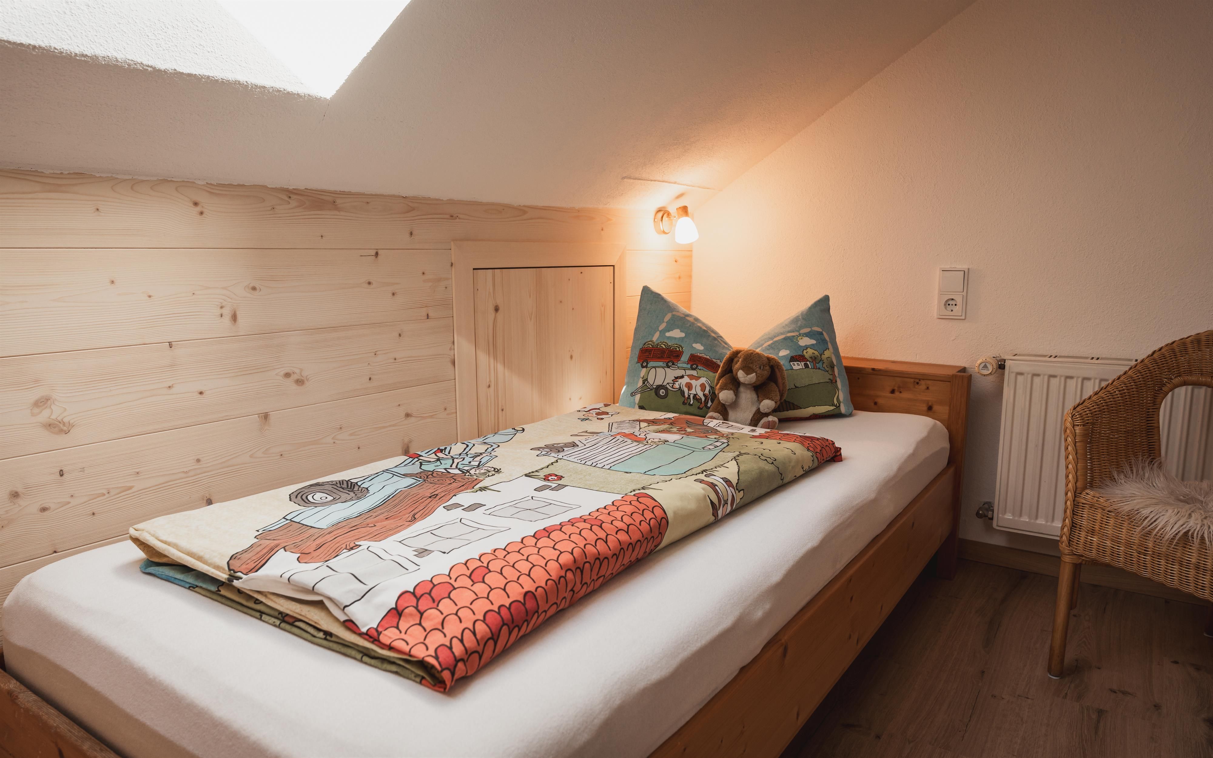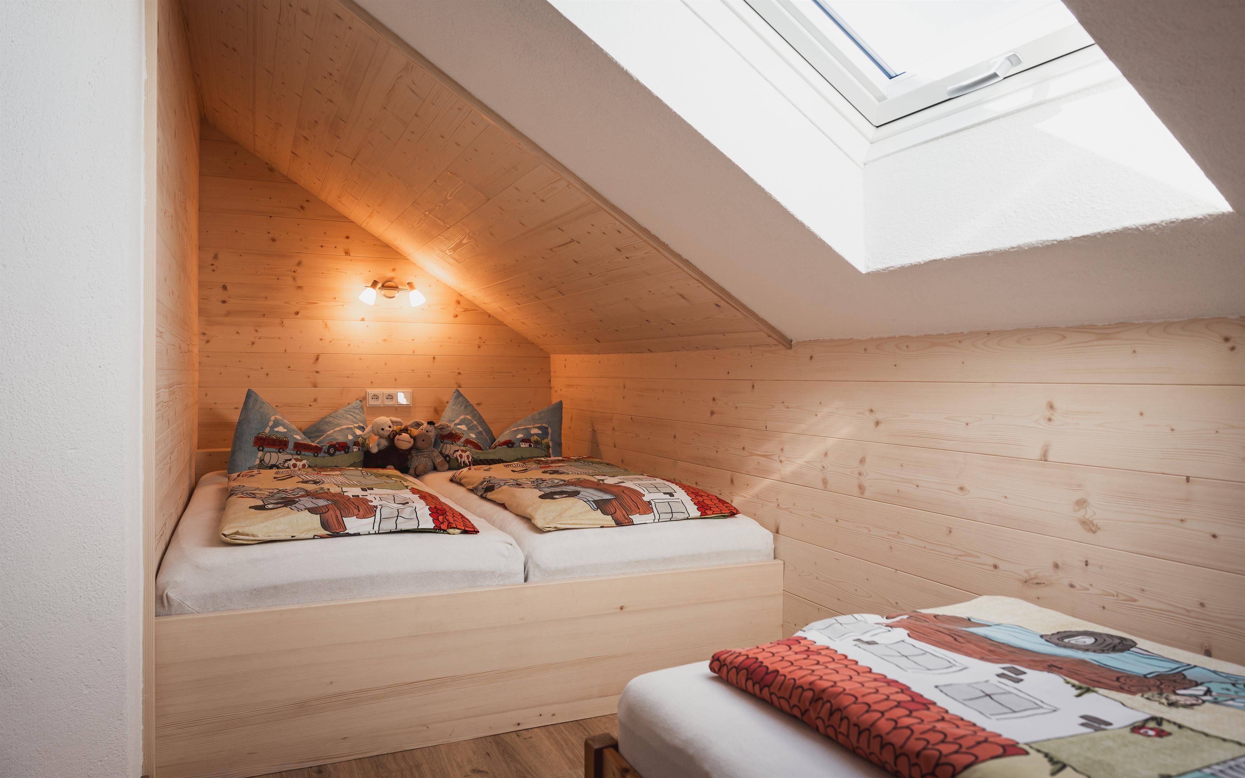 Das zweite Schlafzimmer ist ein Paradies für Kinder. Mit seinem hellen Ambiente und der gemütlichen Schlafkoje bietet es den idealen Rückzugsort für kleine Abenteurer. Ein zusätzliches drittes Bett ist perfekt für etwas ältere Kinder geeignet. Wie im ersten Schlafzimmer sorgt auch hier ein Dachflächenfenster für eine freundliche, sonnenverwöhnte Atmosphäre.