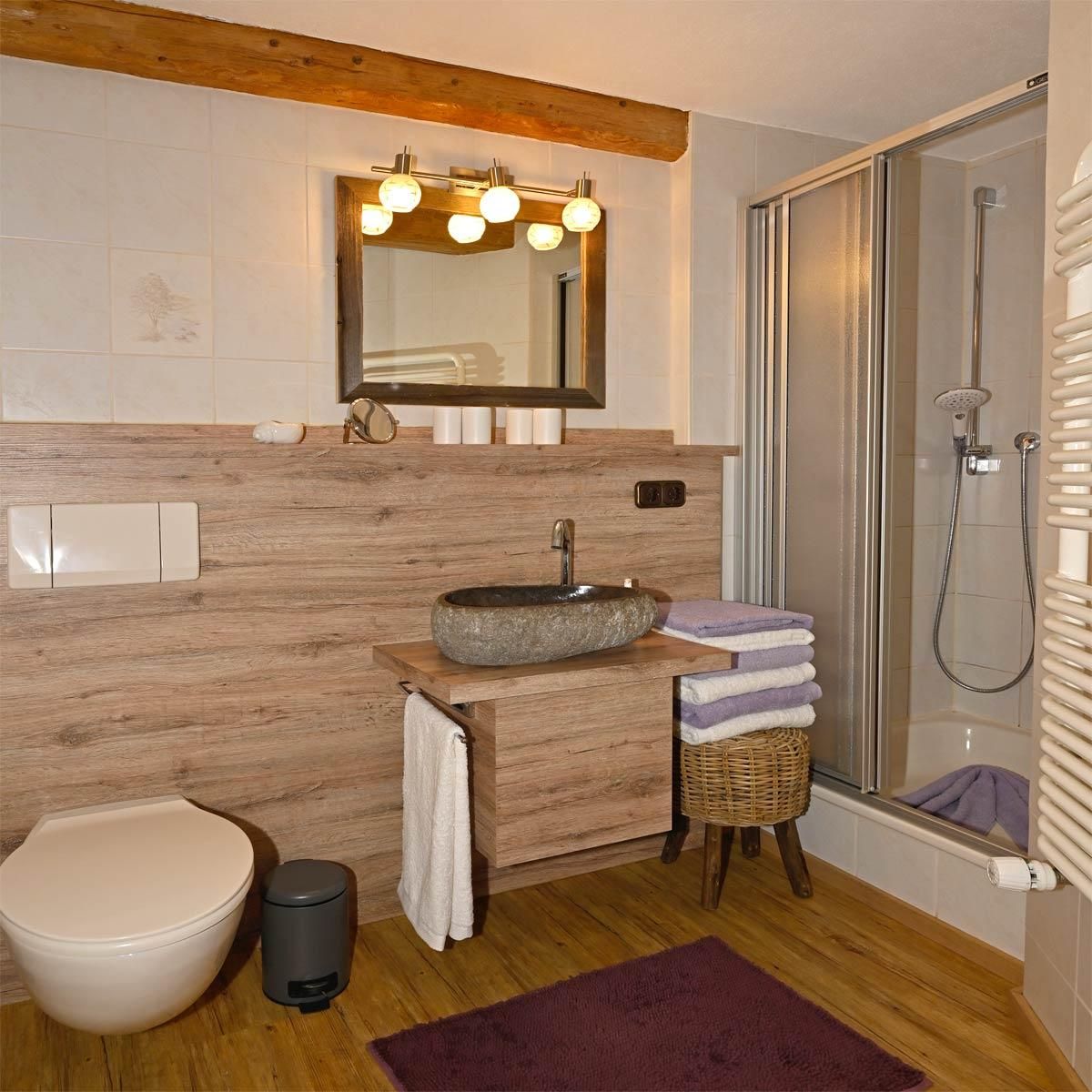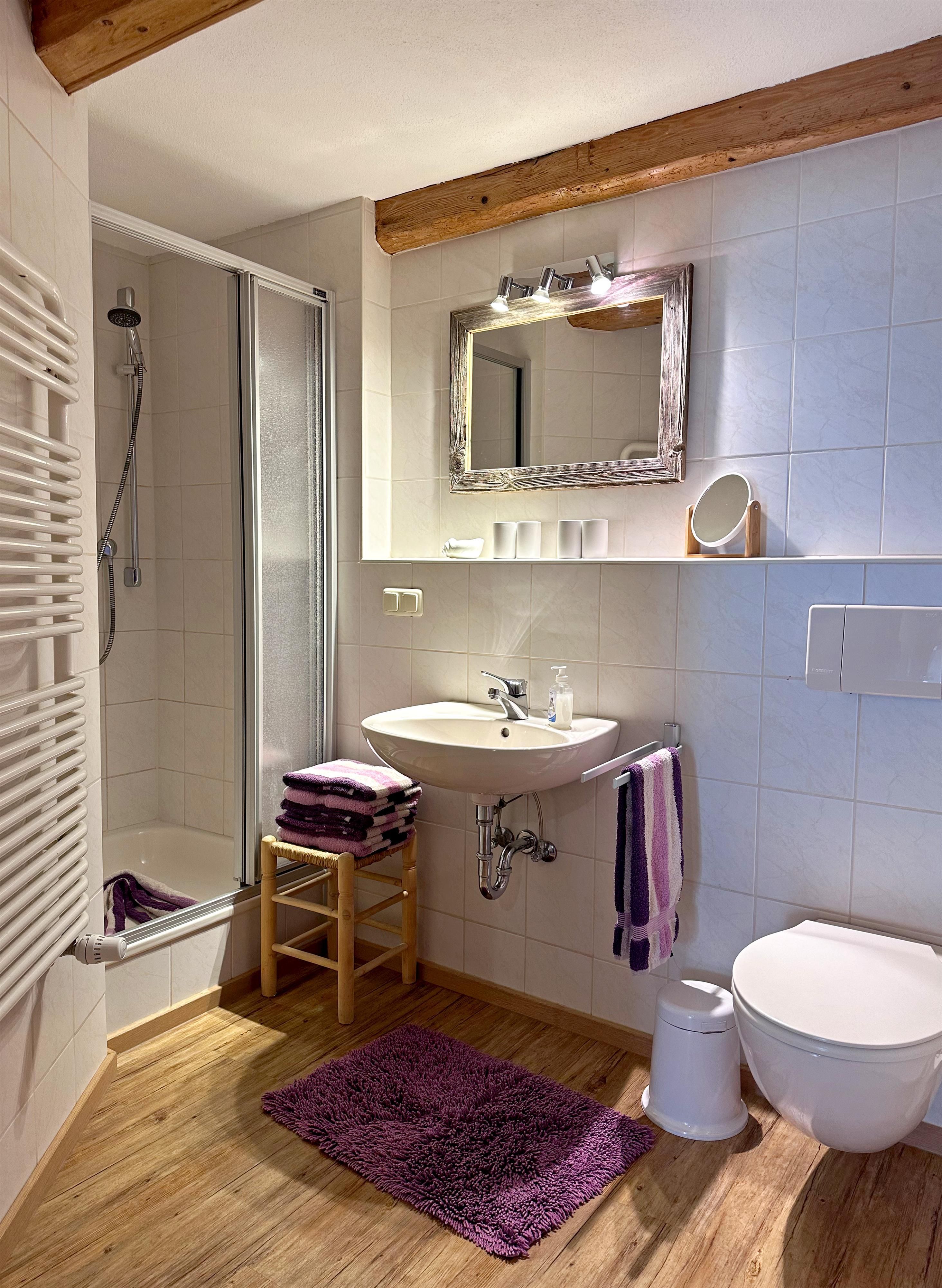 Das ansprechende Bad mit Echtholzbalken bietet neben einem Waschbecken und einem Handtuchwärmer auch eine Dusche/WC und einen Fön, damit Sie sich rundum wohlfühlen können.