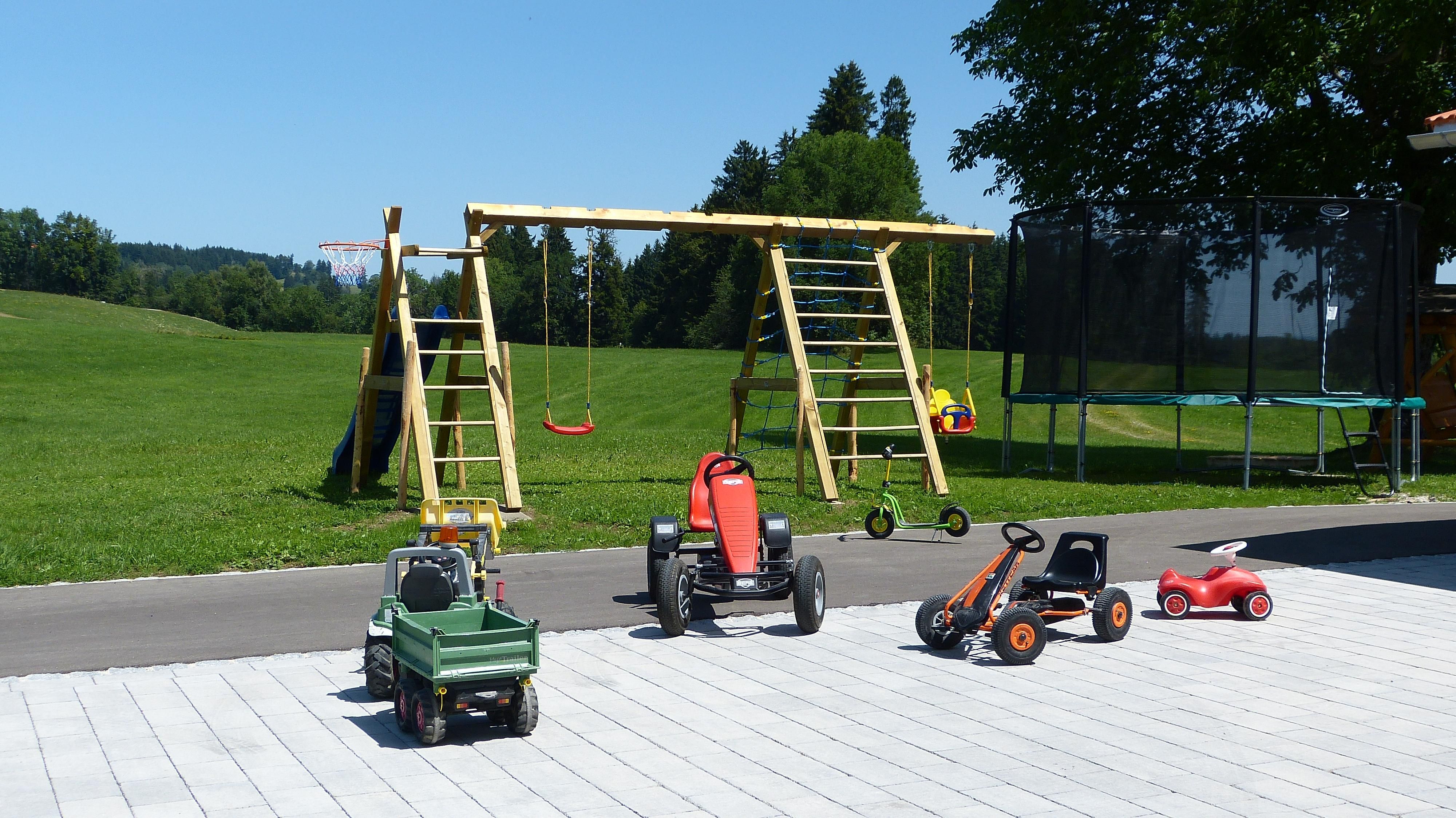 Für die Kinder gibt es am Landhaus und beim Bauernhof einen eigenen kleinen Spielplatz mit Schaukel, Sandkasten und Trampolin, auch unser Fuhrpark mit Bobbycar, Laufrad, Roller und Kettcar steht zu eurer Verfügung. Eine Tischtennisplatte ist auf unserem Bauernhof vorhanden. Wenn du einen großen Spielplatz mit diversen Spielgeräten und Sitzplätzen besuchen möchtest: Die gibt es in den Ortsmitten von Akams und Bräunlings.
