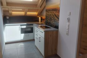 • kleine Küchenzeile mit Herd und Backofen, Geschirrspüler, Kühlschrank mit Gefrierfach, Kaffeemaschine, Toaster, Wasserkocher und Eierkocher usw.