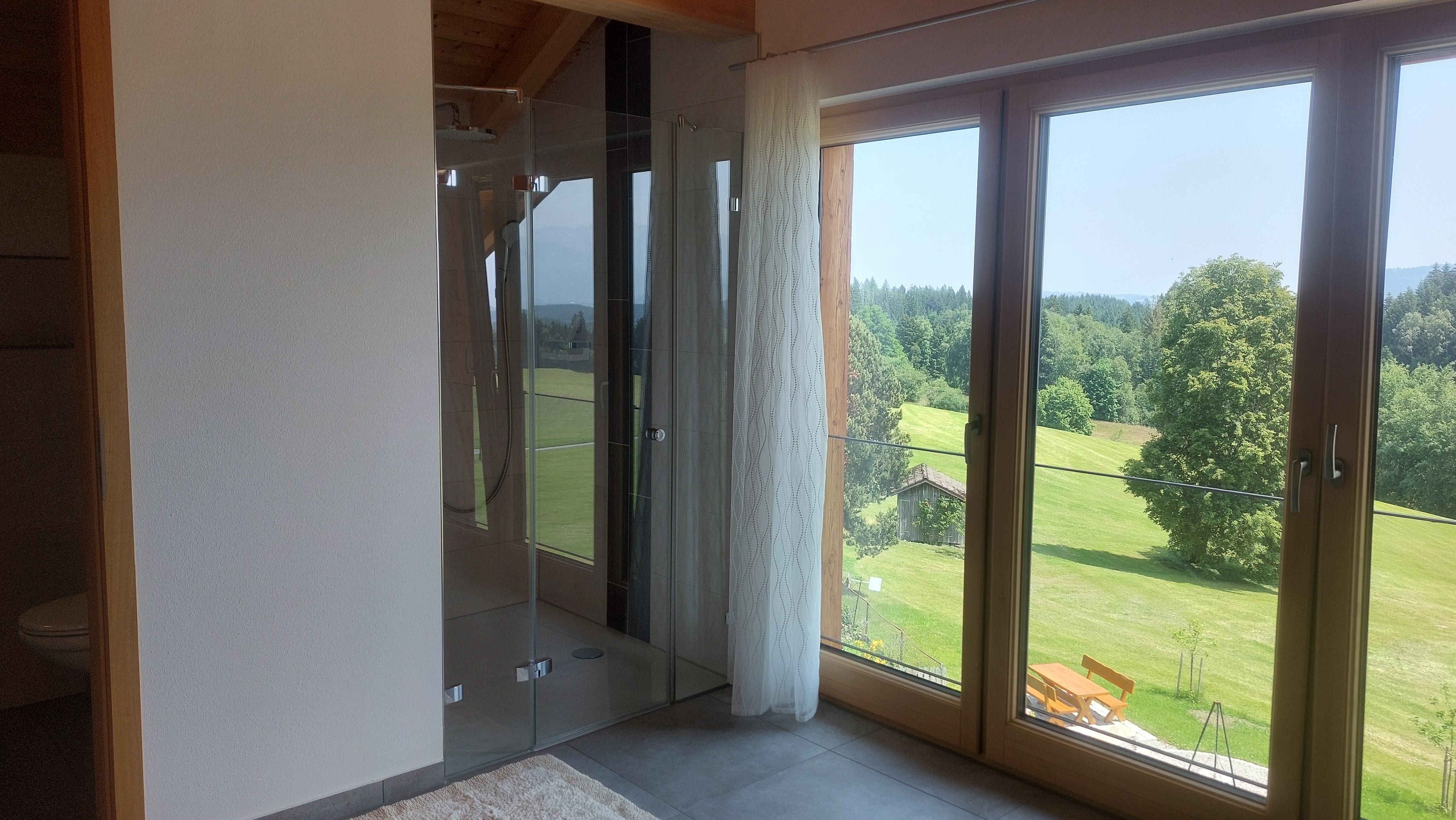 • großes bodenhohes Panorama-Fenster mit Blick auf weite Wiesen, Wälder und Berge