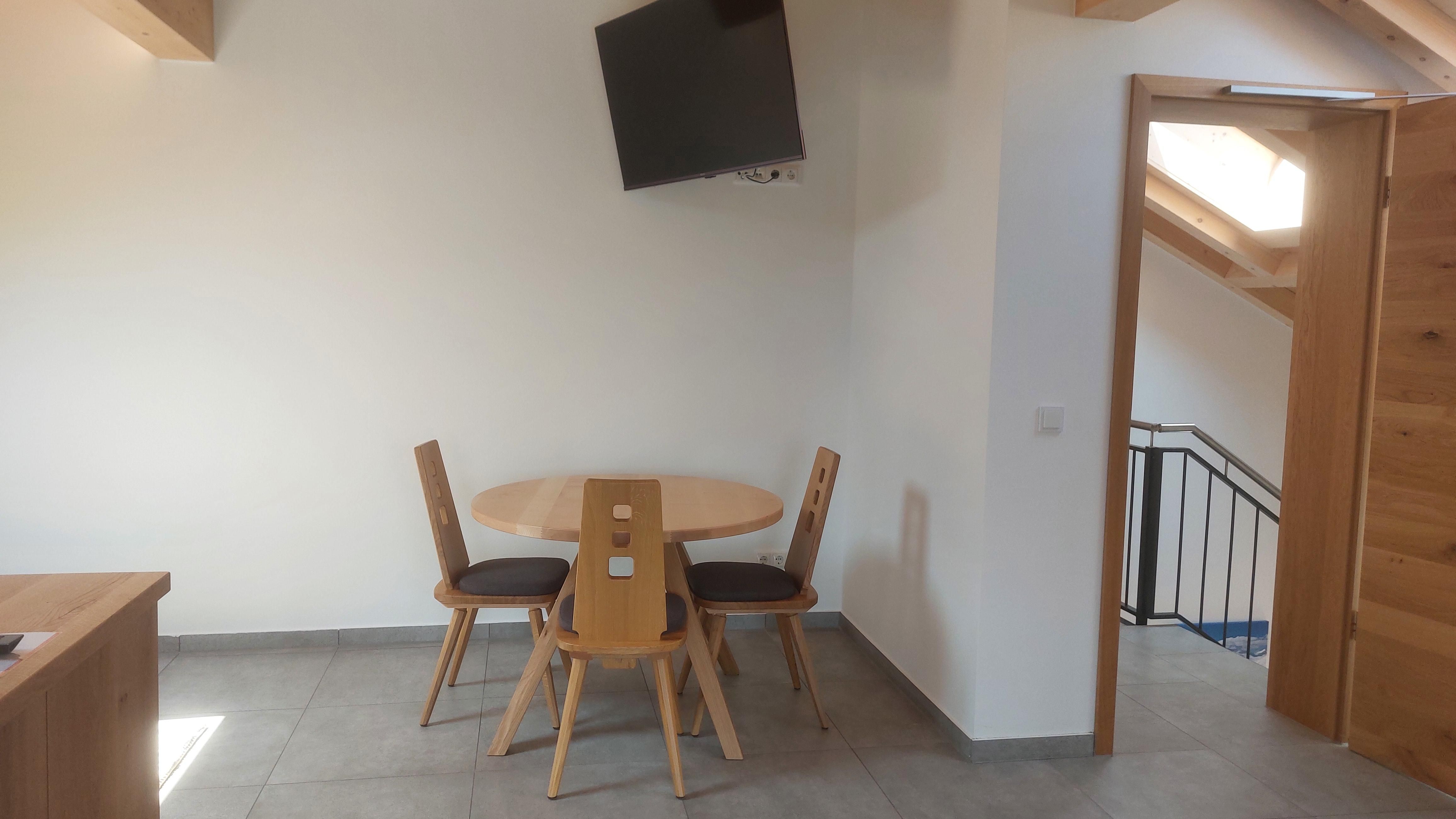 • großer Wohn-Schlafraum mit Tisch/Stuhl-Kombination, gemütlicher Couch-Ecke mit Sat-TV und Doppelbett in rustikaler Eiche (getrennte Matratzen und Fußende offen, 180x200), Zustellbett 80x170