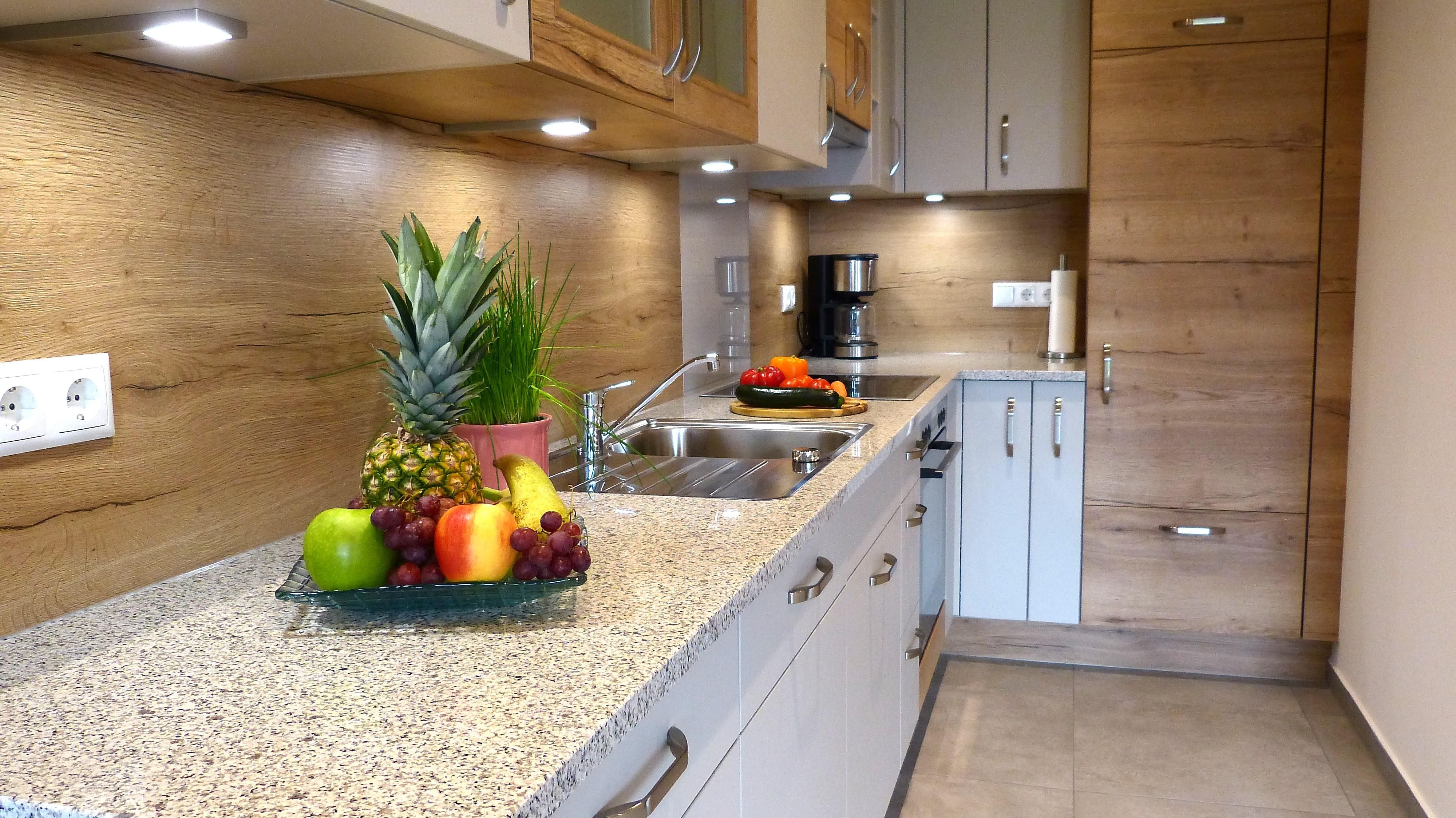 • voll ausgestattete Küche mit Herd und Backofen, Geschirrspüler, Kühlschrank,