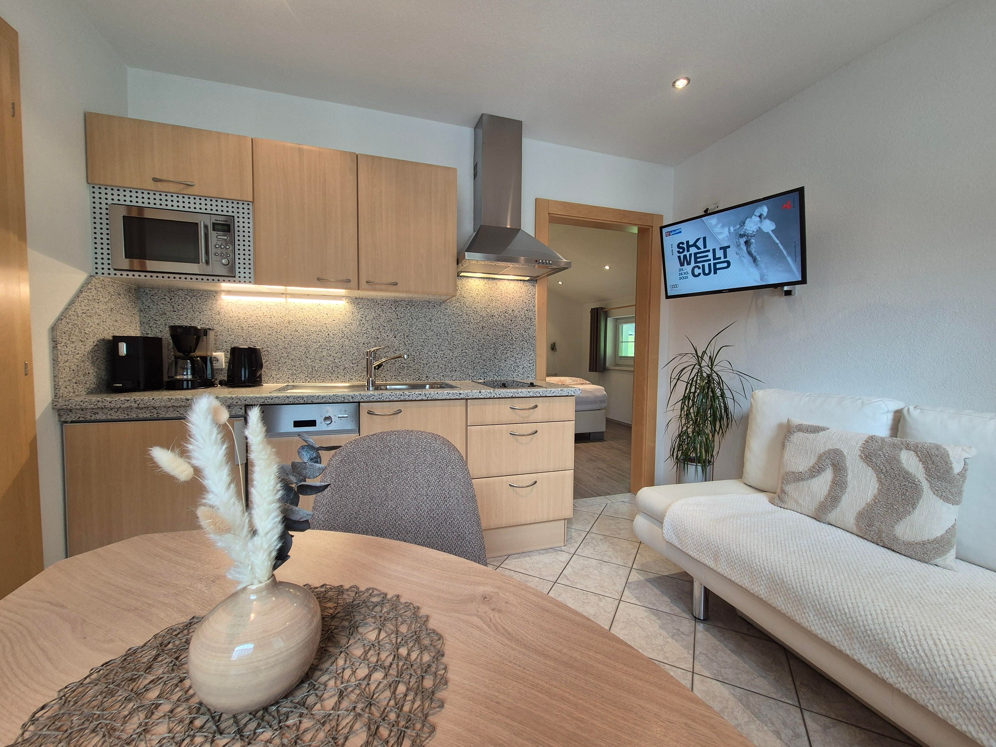 Geräumiges Appartement ca. 30 - 35 m² mit 1 Doppelzimmer mit Dusche/WC, Föhn, voll ausgestattete Wohnküche mit Sitzecke und Schlafsofa, Kabel-Flat-TV in Zimmer und Küche, teilweise Balkon oder Terrasse.