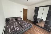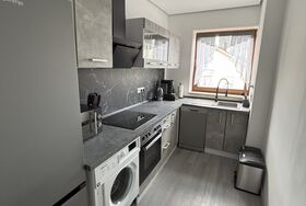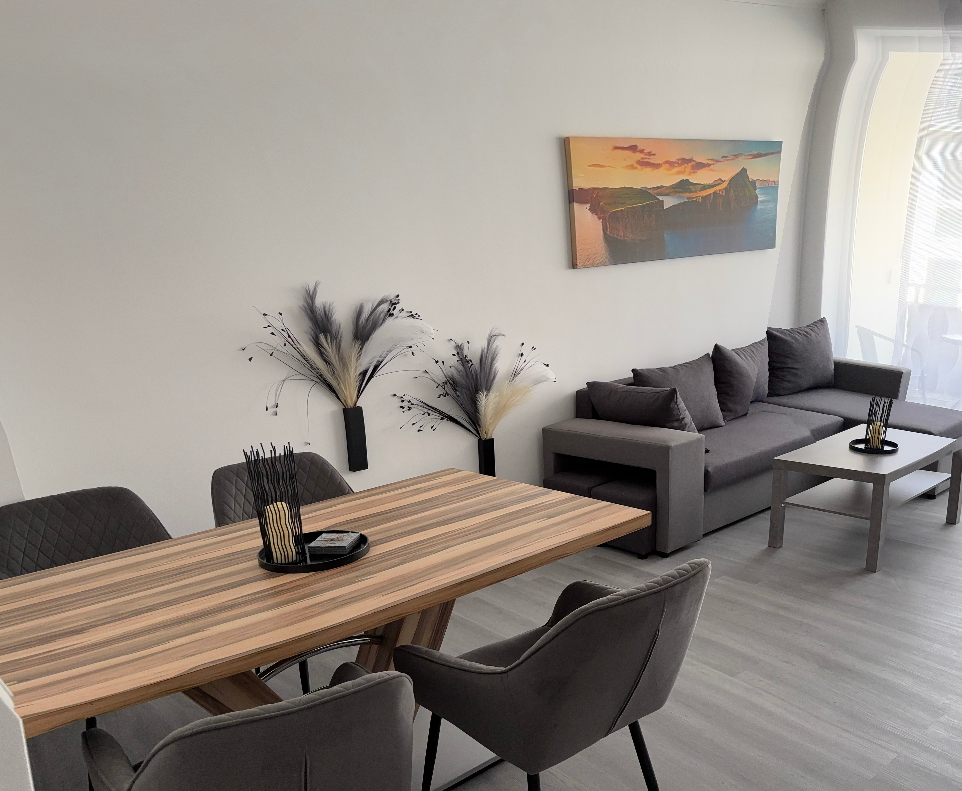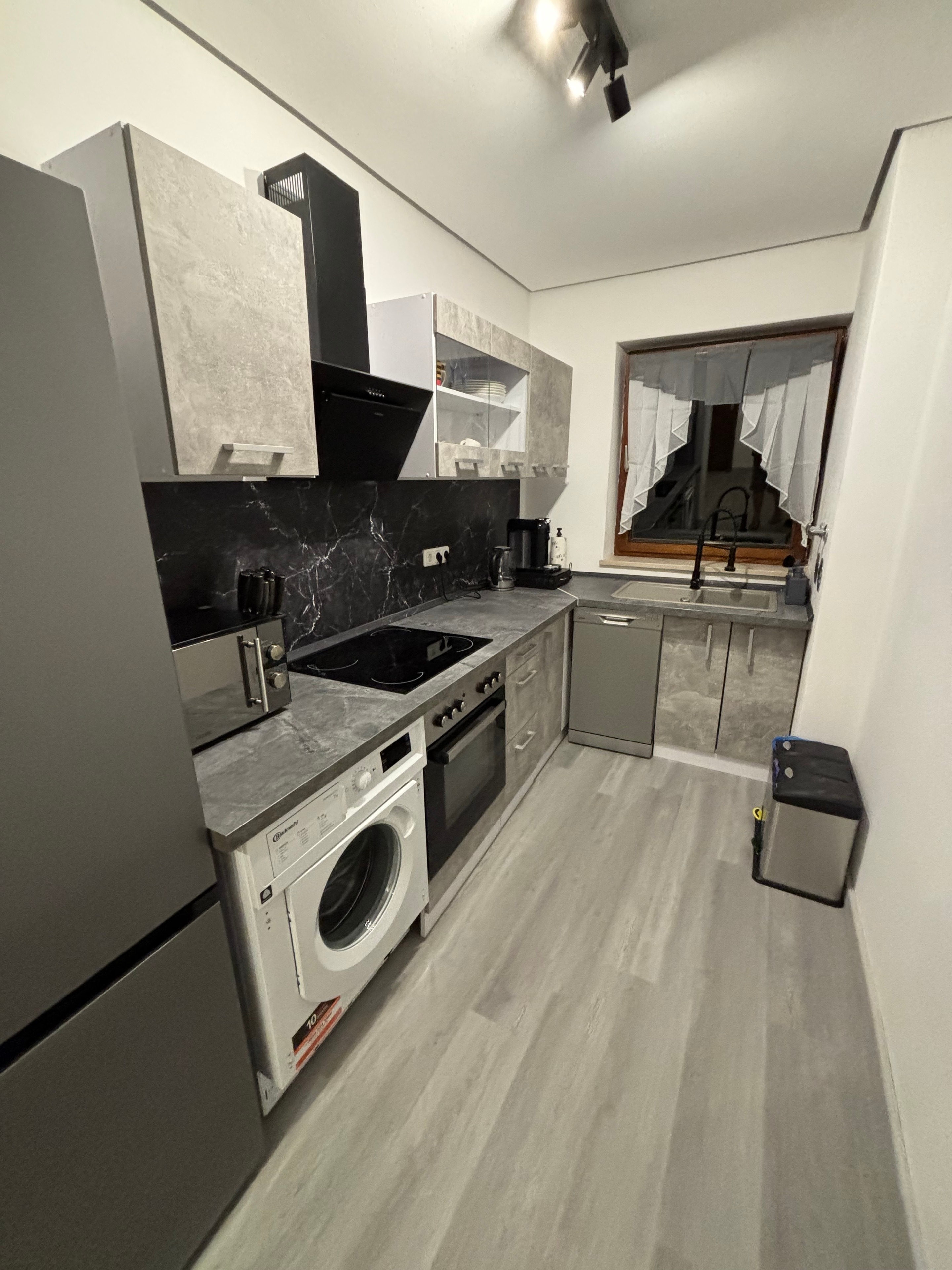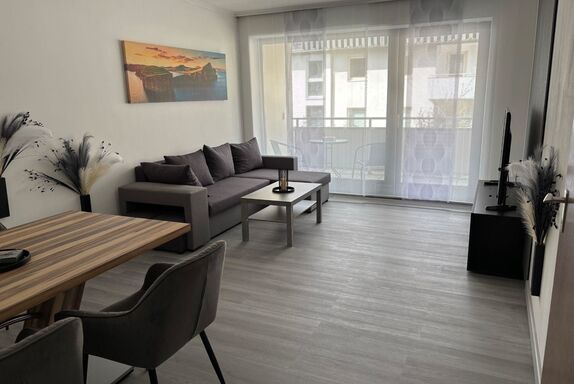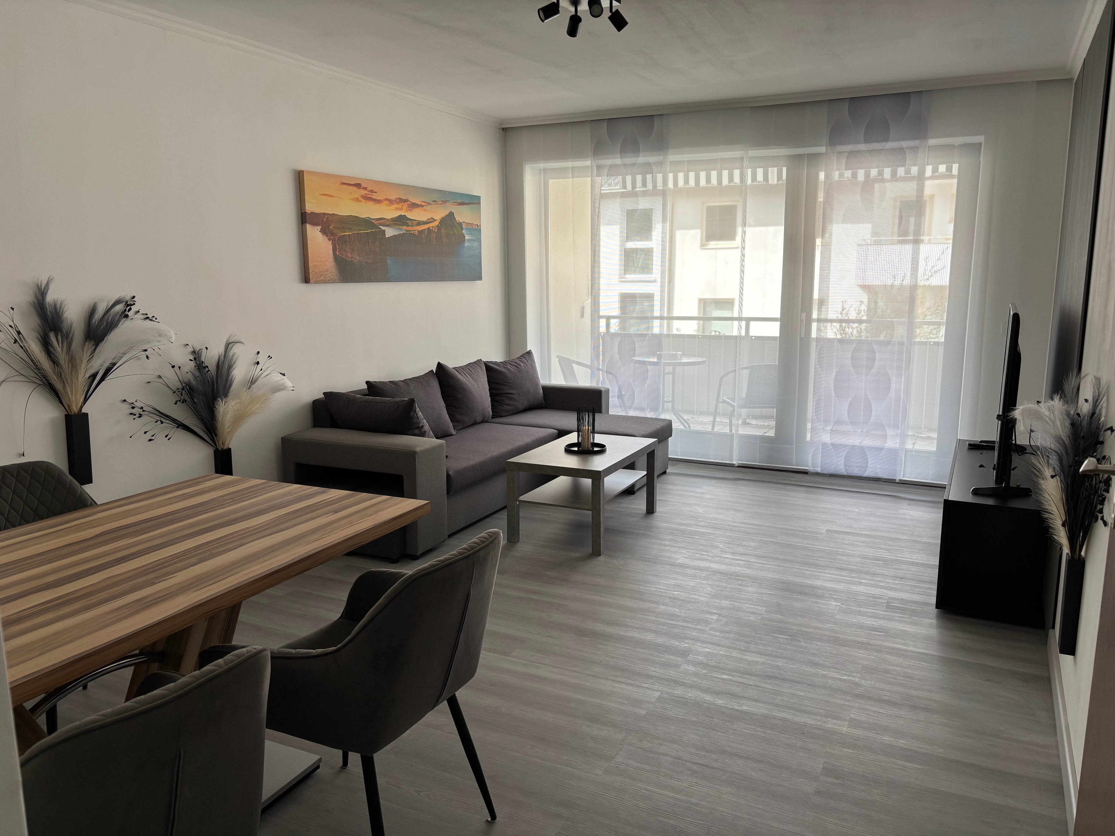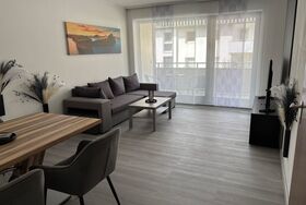 Geeignet für zwei bis drei Personen, 2. OG, Aufzug vorhanden, abgeschlossene Wohnung, WLAN, Wohn- / Esszimmer mit großer Schlafcouch (1,40 m breit), TV, Schlafzimmer mit Doppelbett (1,80 m breit), TV, Küche komplett ausgestattet (Herd mit 4 Cerankochfeldern, Backofen, Geschirrspüler, Kühlschrank- und Gefrierkombi, Kaffeemaschine, Toaster, Wasserkocher, Waschmaschine, Bügeleisen, Kinderbett und -stuhl auf Anfrage, Bad mit Dusche/WC (Fön vorhanden),