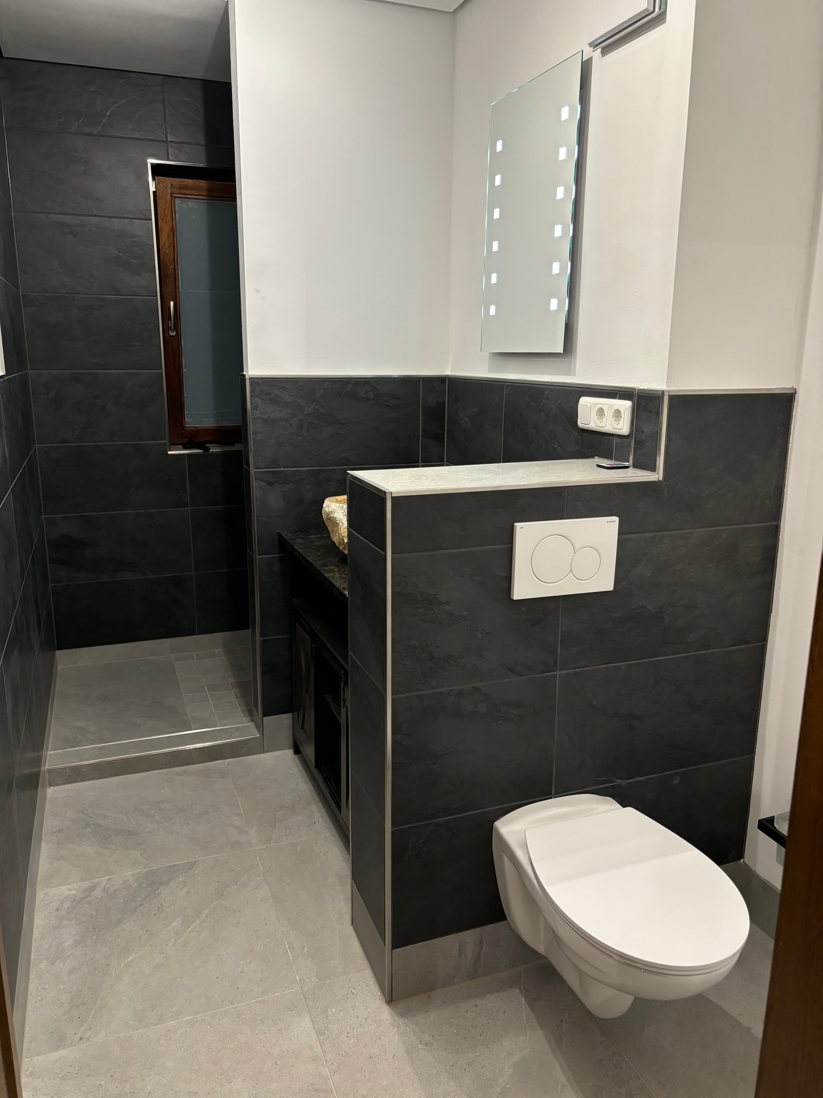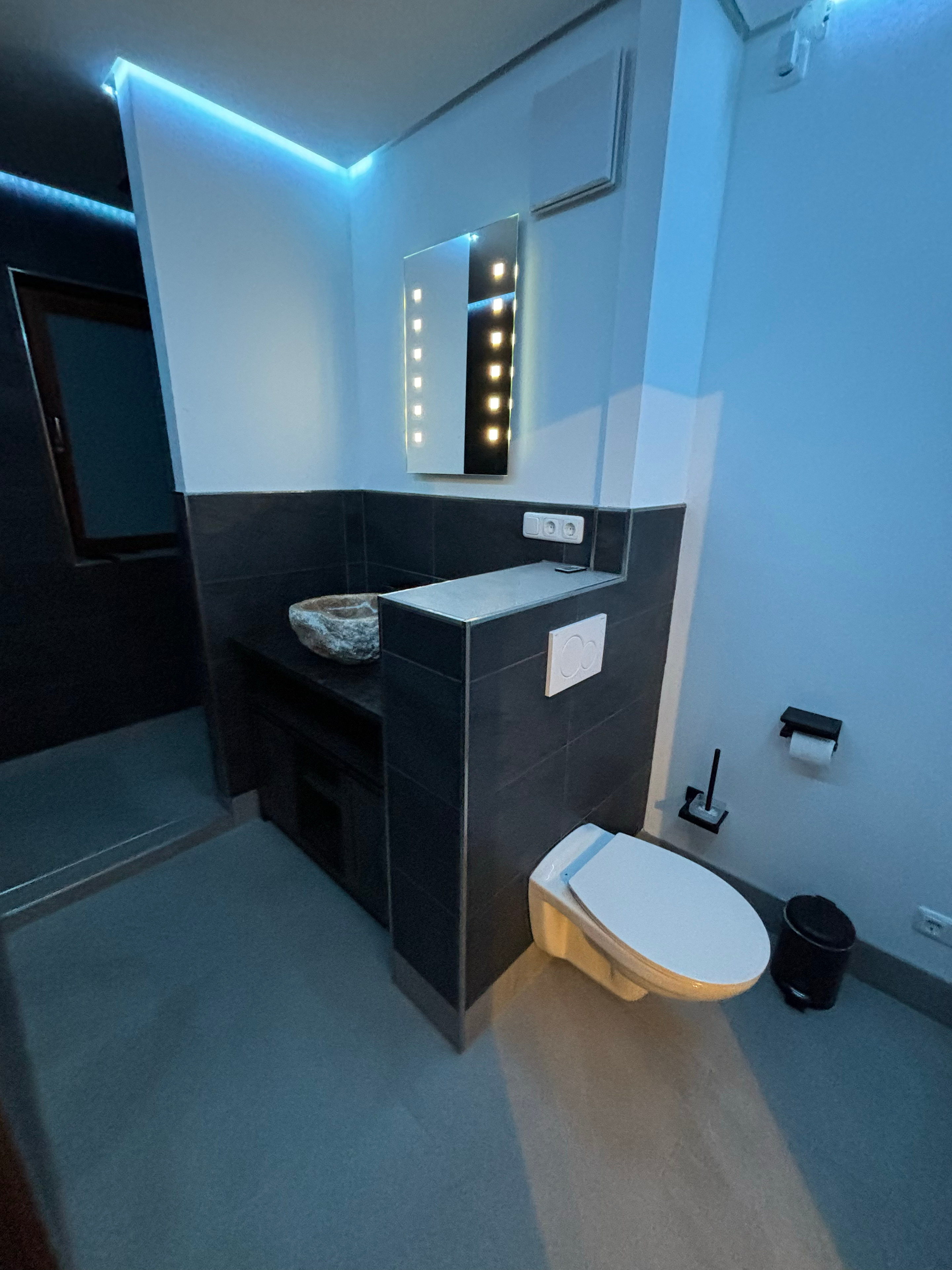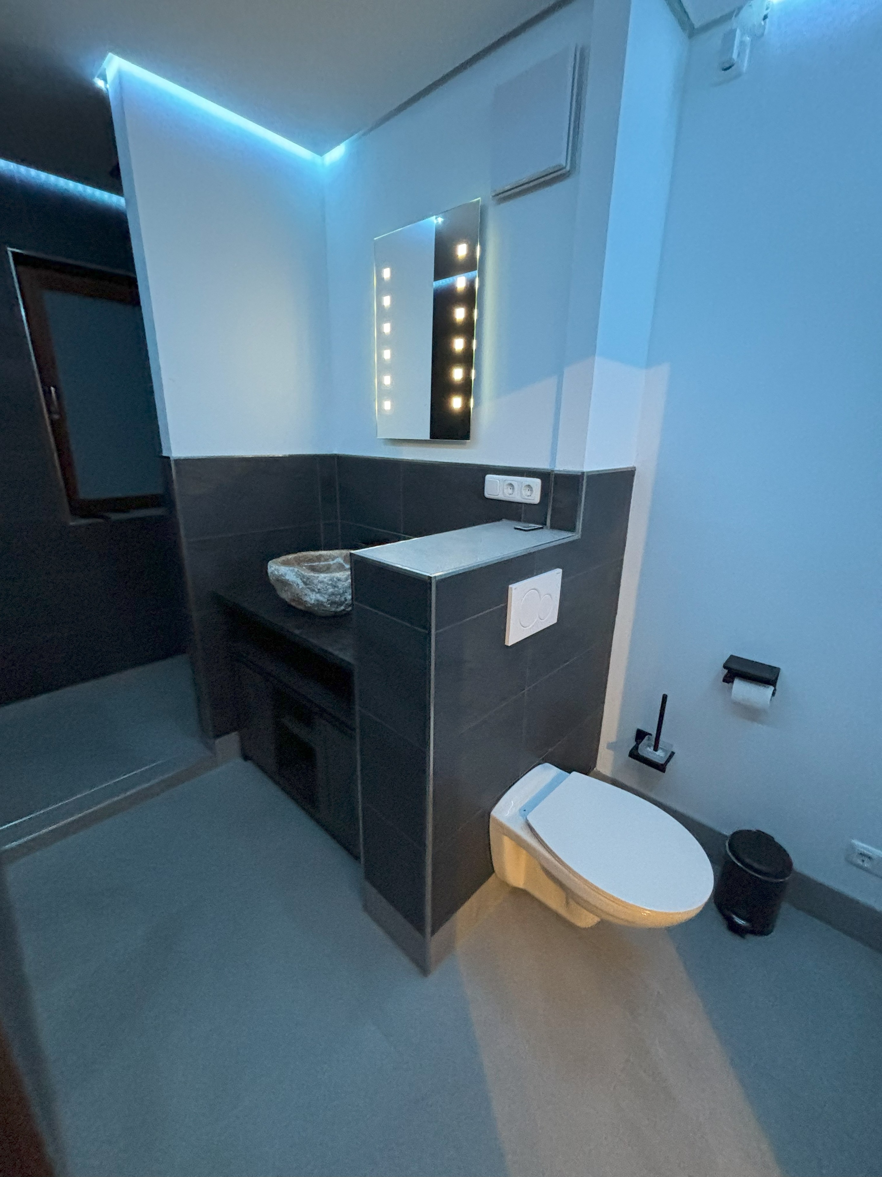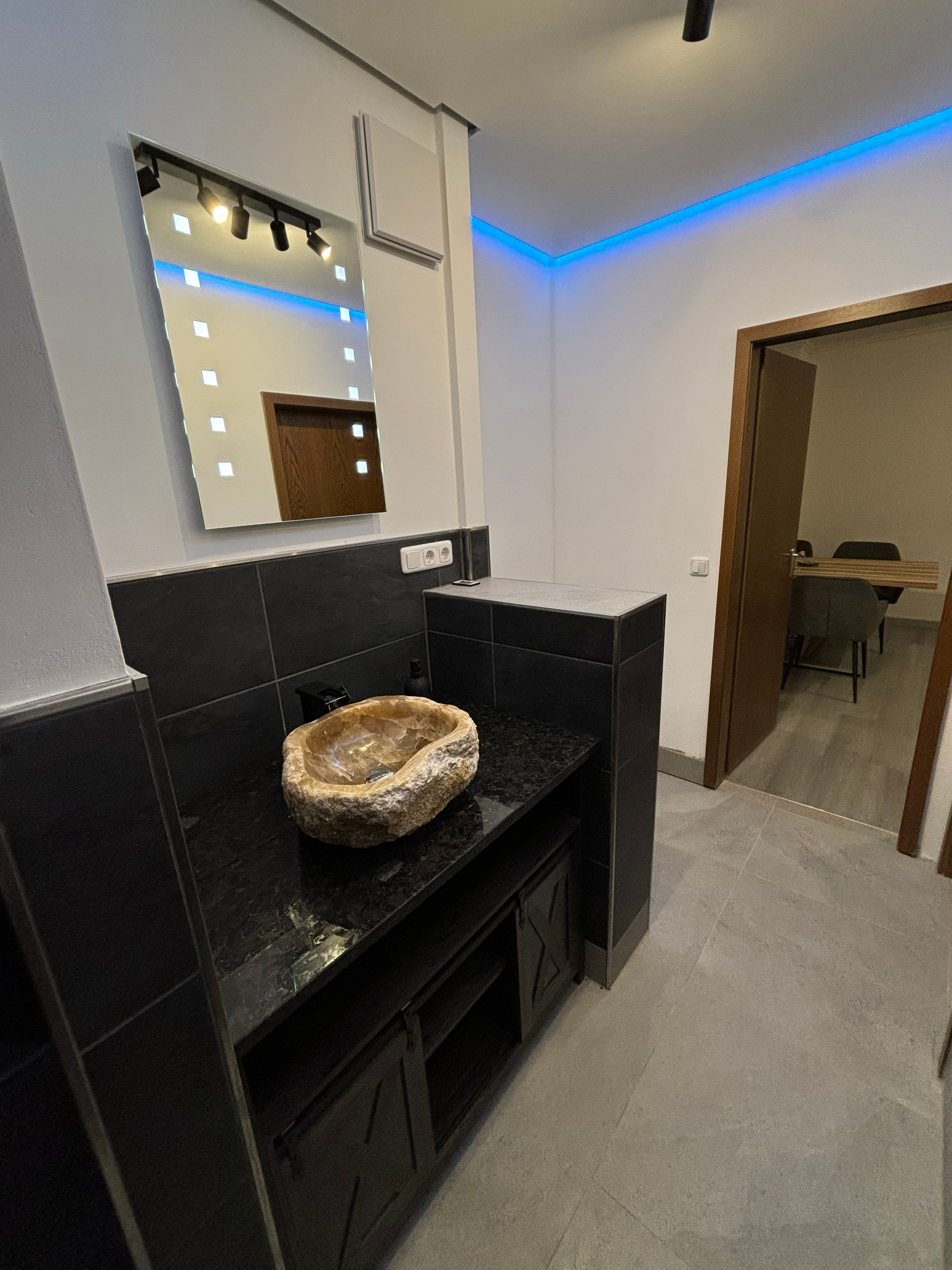 Geeignet für zwei bis drei Personen, 2. OG, Aufzug vorhanden, abgeschlossene Wohnung, WLAN, Wohn- / Esszimmer mit großer Schlafcouch (1,40 m breit), TV, Schlafzimmer mit Doppelbett (1,80 m breit), TV, Küche komplett ausgestattet (Herd mit 4 Cerankochfeldern, Backofen, Geschirrspüler, Kühlschrank- und Gefrierkombi, Kaffeemaschine, Toaster, Wasserkocher, Waschmaschine, Bügeleisen, Kinderbett und -stuhl auf Anfrage, Bad mit Dusche/WC (Fön vorhanden),