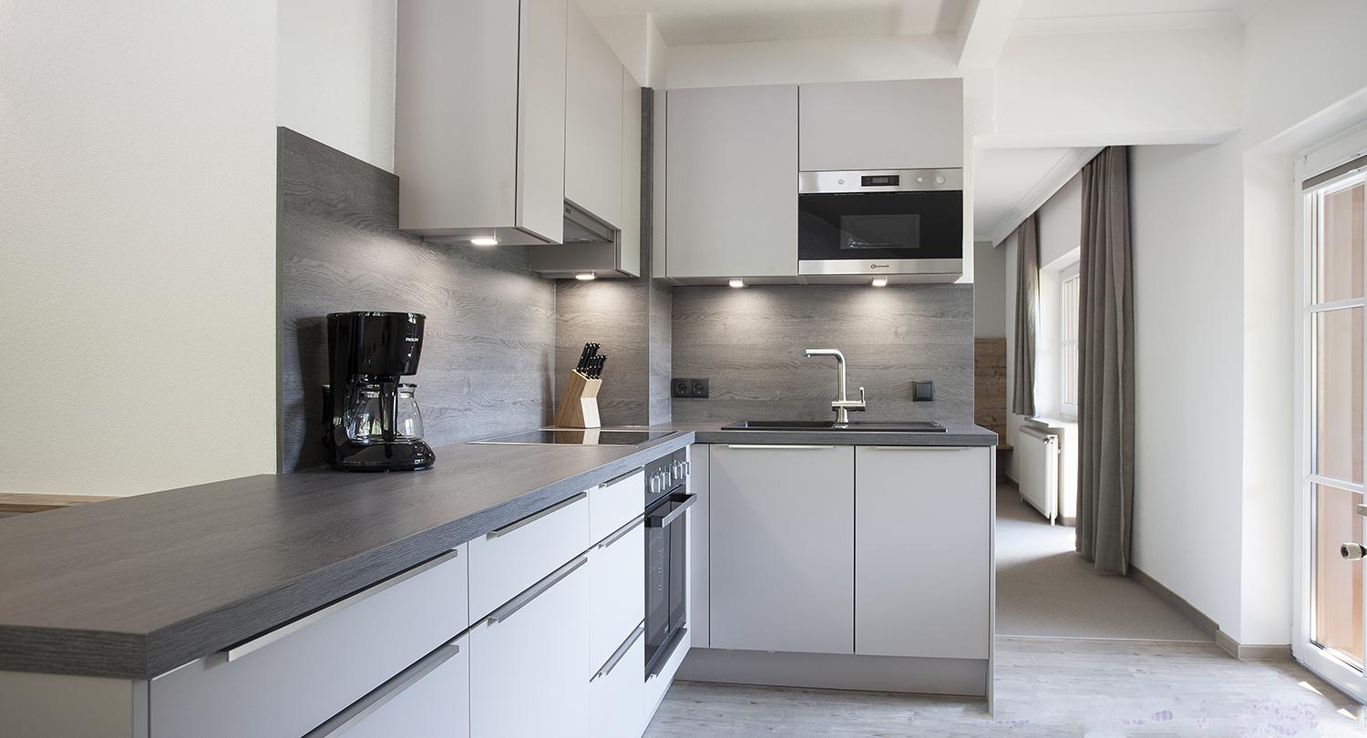 Die Wohnung TOP 6 besteht aus einem Wohnraum mit einem Doppelbett, einer vollausgestatteten Küchenecke mit Essbereich (Kühlschrank mit Tiefkühlfach, Geschirrspülmaschine, Elektroherd, Mikrowellenherd, Kaffeemaschine, Toaster, Wasserkocher sowie Koch- und Essgeschirr uvm.). Die Wohnung verfügt des Weiteren über ein Badezimmer mit Dusche und separaten WC sowie einen Balkon. Kostenloses WLAN Internet.