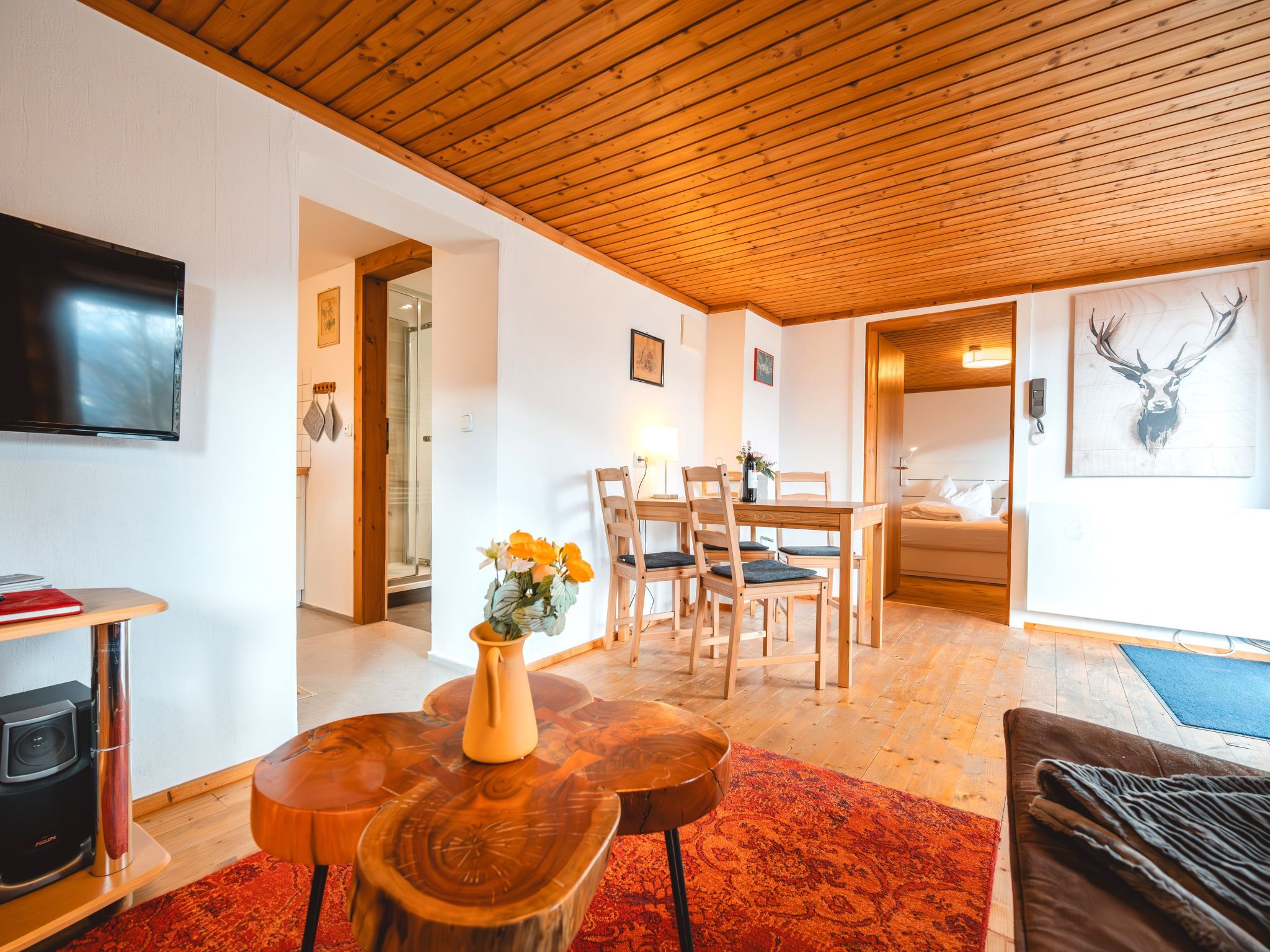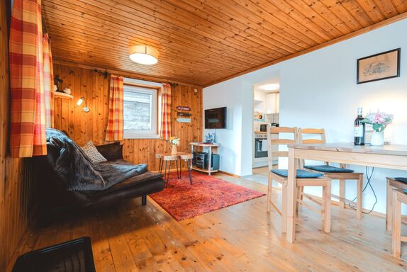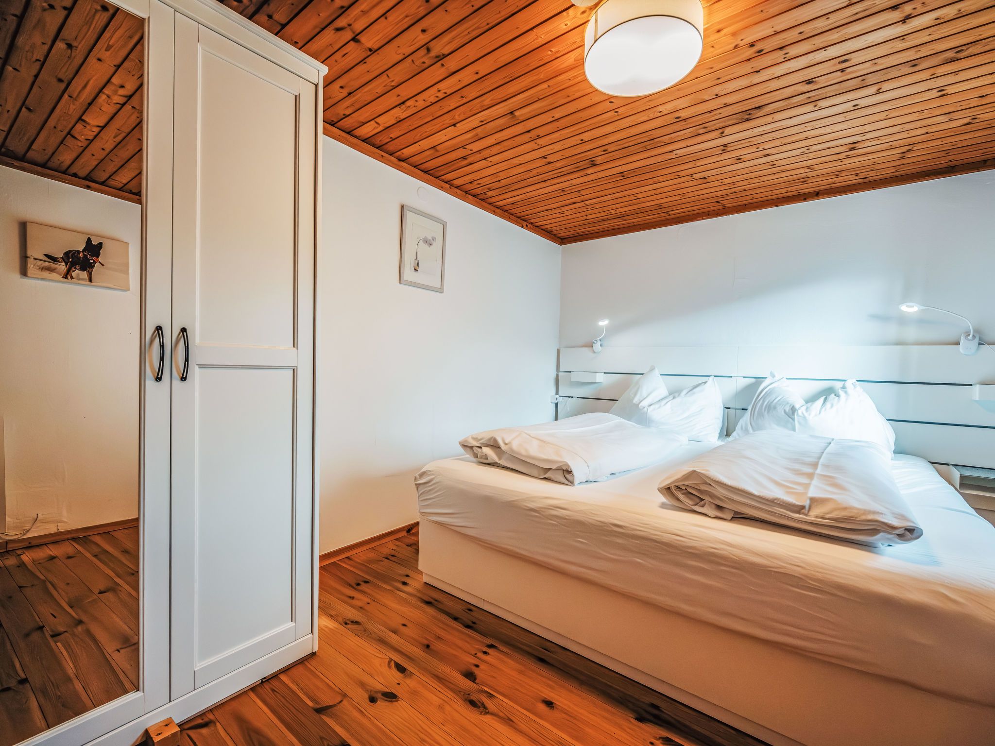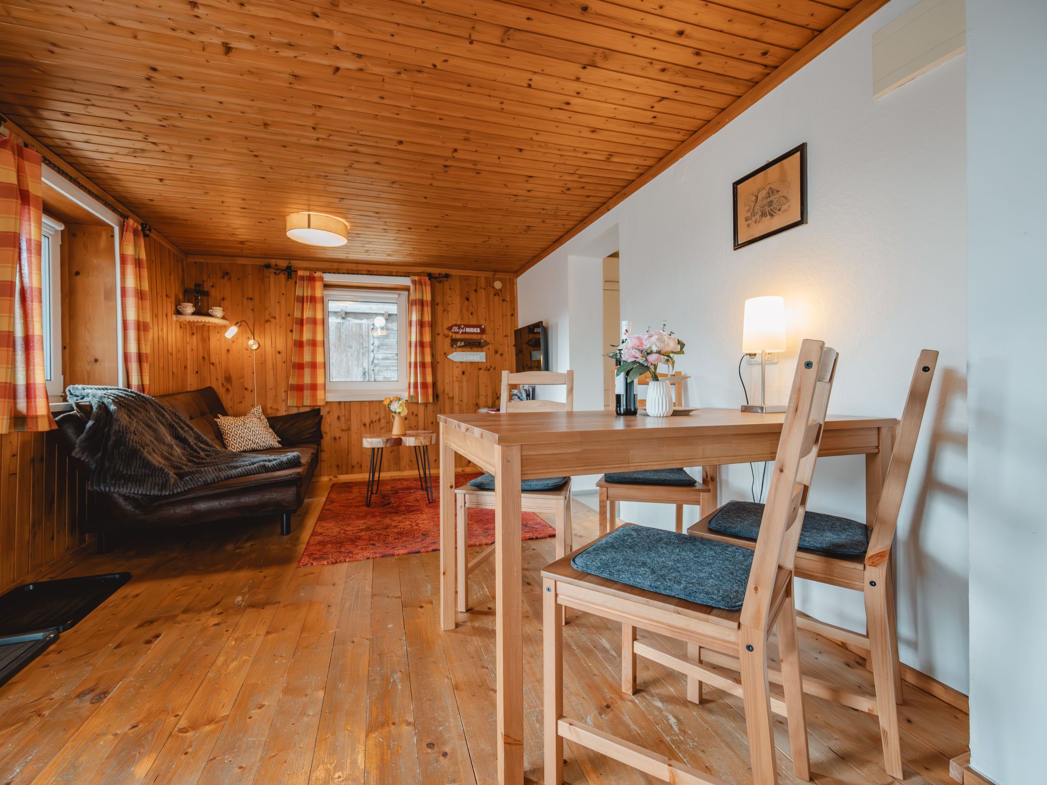 2-Zimmer-Wohnung 35 m2. Komfortabel und mit viel Holz eingerichtet: Wohn-/Schlafzimmer, Deckenhöhe 190 - 200 cm mit 1 Diwanbett, Esstisch und TV (Flachbildschirm), E-Heizung. 1 Doppelzimmer. Küche (4 Kochplatten, Backofen, Toaster, Wasserkocher, Mikrowelle, elektrische Kaffeemaschine). Dusche/WC. E-Heizung. Holzdielenboden. Kleine Terrasse, Garten. Terrassenmöbel. Sehr schöne Panoramasicht auf den See und die Landschaft. Zur Verfügung: Internet (Wireless LAN, gratis). Bitte beachten: geeignet für Familien. Rauchmelder. 50628-001671-2025