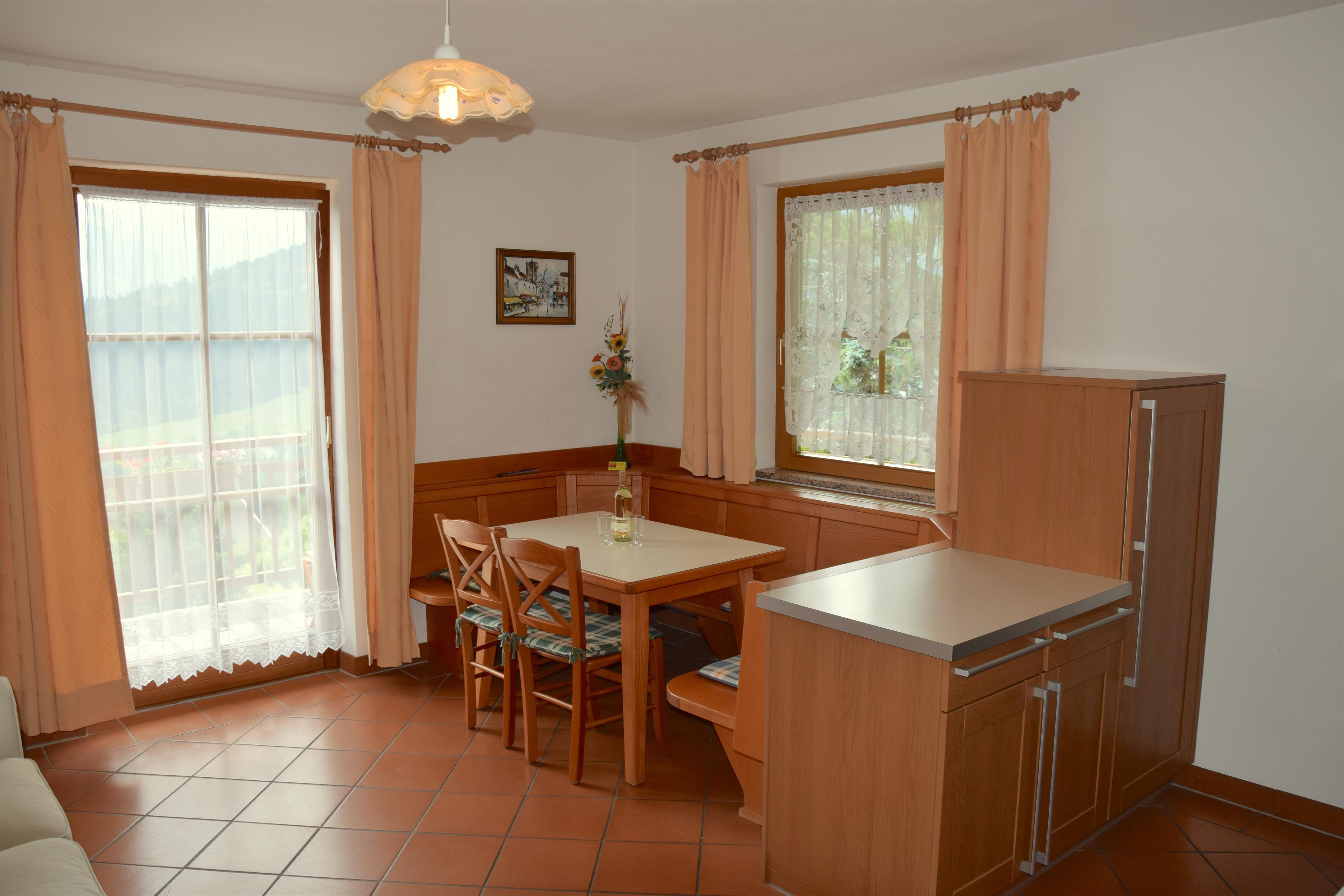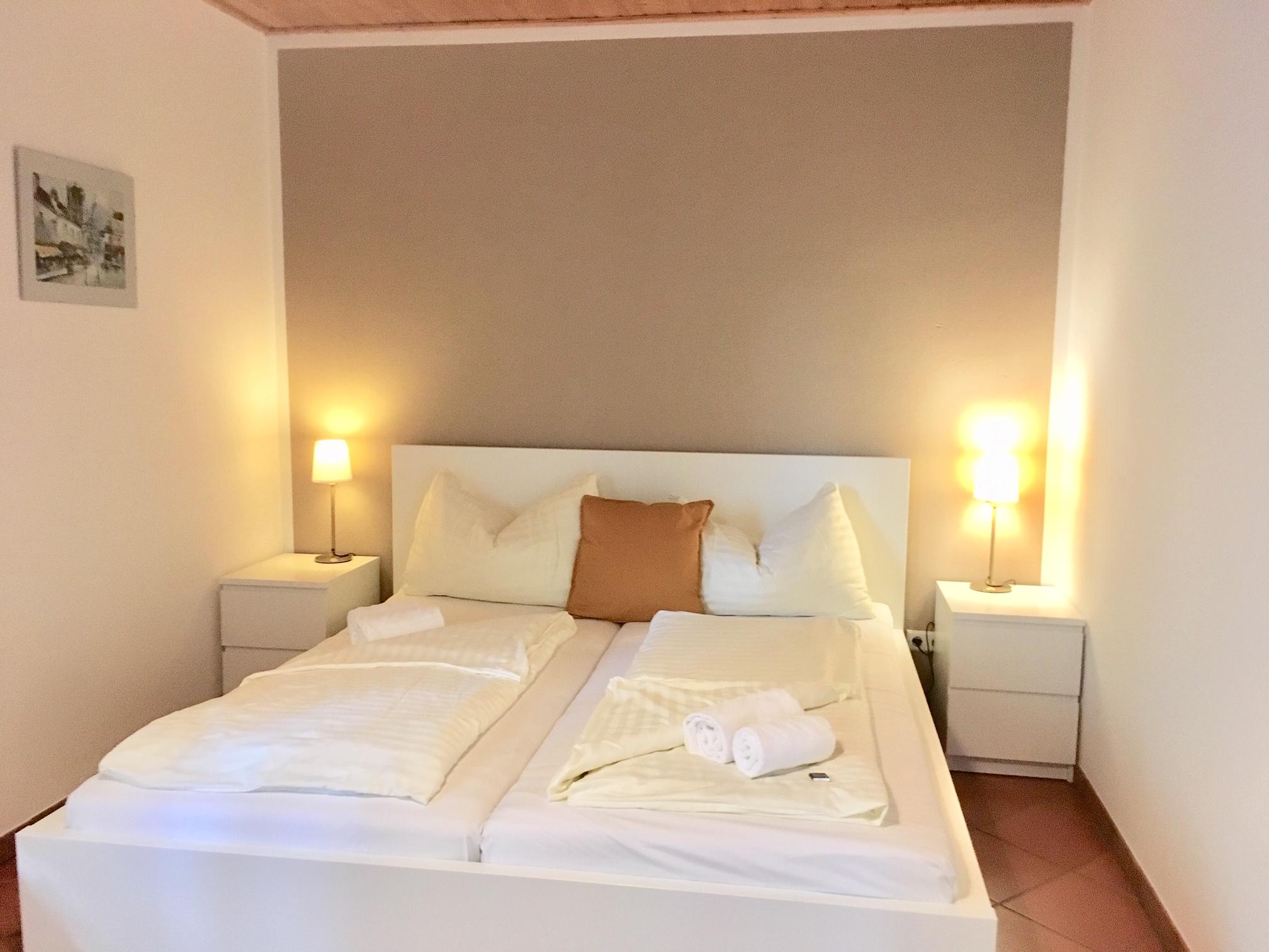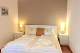 Gemütliche südwestlich gelegene Ferienwohnung für bis zu 7 Personen 84 m2: moderne Wohnküche mit Geschirrspüler und Ausgang auf Balkon,Sofa, Essecke und SAT-TV, 1 Doppelbettzimmer, 1 Zimmer mit 2 Einzelbetten, 1 Dreibettzimmer mit Doppelbett und Einzelbett mit Ausgang auf Balkon, Bad mit Dusche 2 Waschbecken und WC, 1 WC extra, sehr großer Balkon mit Tischen und Stühlen