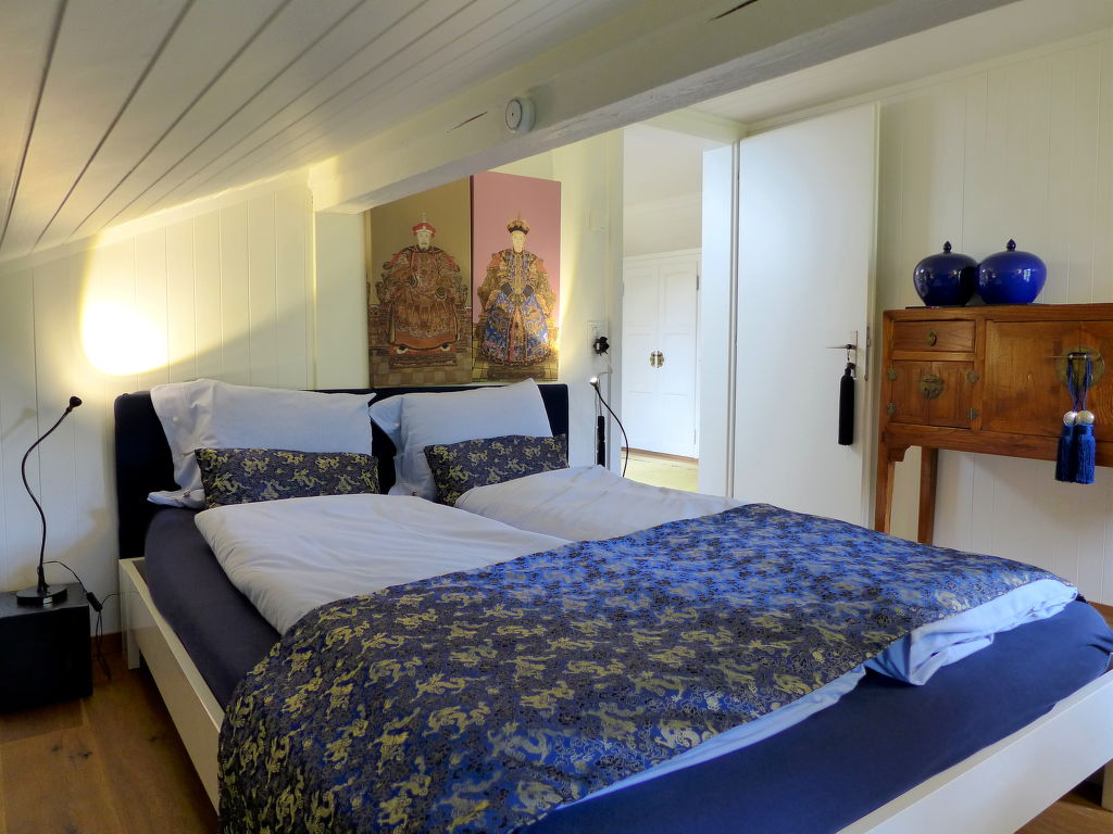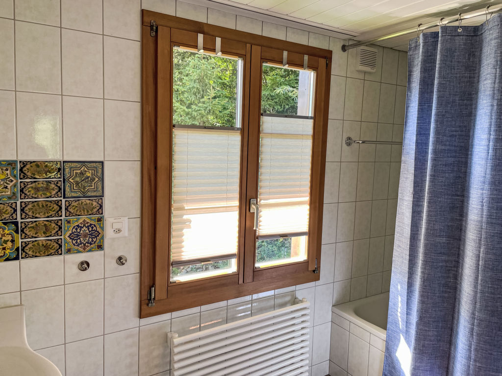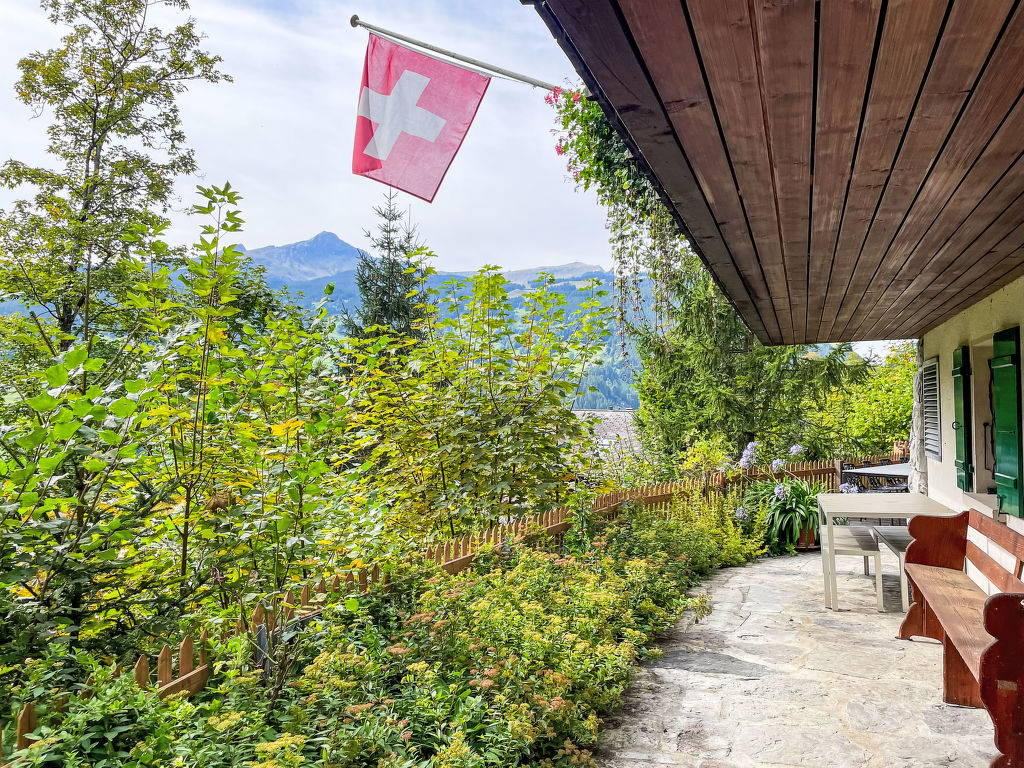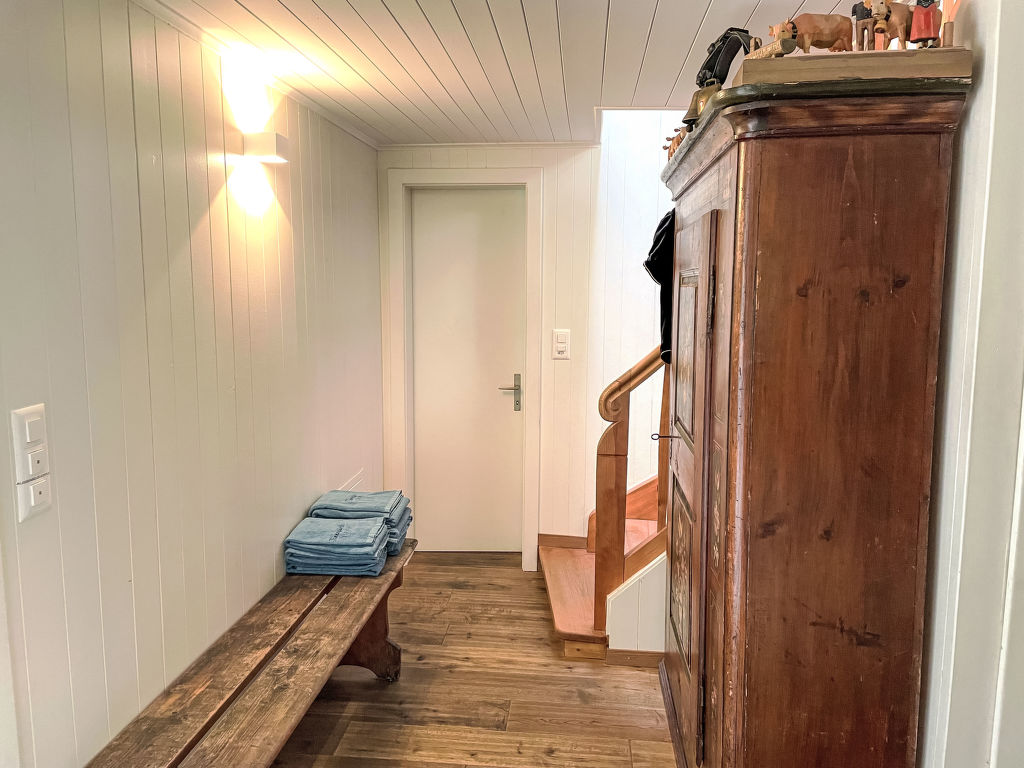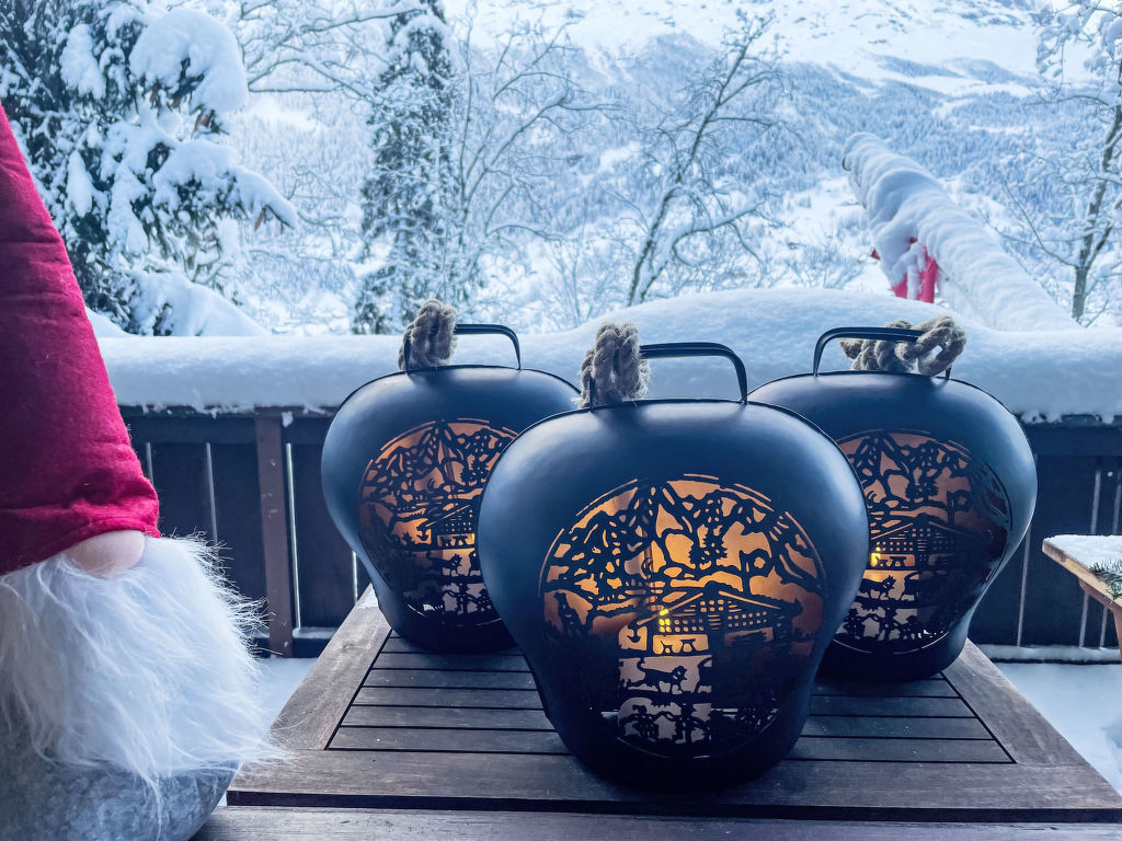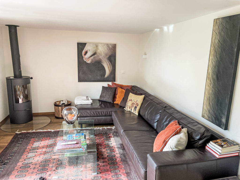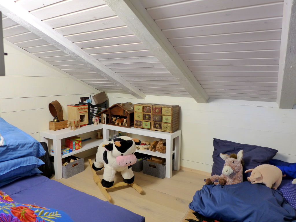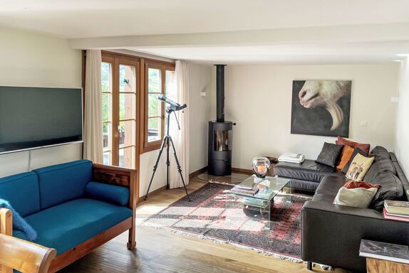 3-Zimmer-Chalet 130 m2 auf 3 Stockwerken. Hell, teilweise abgeschrägt, sehr komfortabel und geschmackvoll eingerichtet: offenes grosses Wohn-/Esszimmer mit Panoramafenster Richtung Süden mit Schwedenofen, Esstisch und Digital-TV. Ausgang zum Balkon. Wohnküche (Backofen, Geschirrspüler, 4 Glaskeramikplatten, Toaster, Wasserkocher, Mikrowelle, elektrische Kaffeemaschine, Kapseln für die Kaffeemaschine (Nespresso) extra, Racletteofen, Fondue Set (Käse)) mit Essecke. Bad/WC. Unteres Geschoss: Dusche/WC. Dachgeschoss: 1 abgeschrägtes Zimmer mit 1 franz. Bett (160 cm, Länge 200 cm). 1 abgeschrägtes Zimmer mit 3 Betten (90 cm, Länge 200 cm). Offene Galerie. Offenes kleines Spielzimmer. Grosser Balkon, Südlage, grosse Terrasse. Terrassenmöbel, Gartengrill. Herrliche Panoramasicht auf die Berge und die Landschaft. Zur Verfügung: Waschmaschine, Wäschetrockner, Bügeleisen, Babybett bis 2 Jahre, Haartrockner, Holz (gratis). Internet (WLAN, gratis). Parkplatz, Garage beim Haus. Bitte beachten: Nichtraucher-Haus. Maximal 2 Haustiere/Hunde erlaubt. Rauchmelder, Feuerlöscher.
