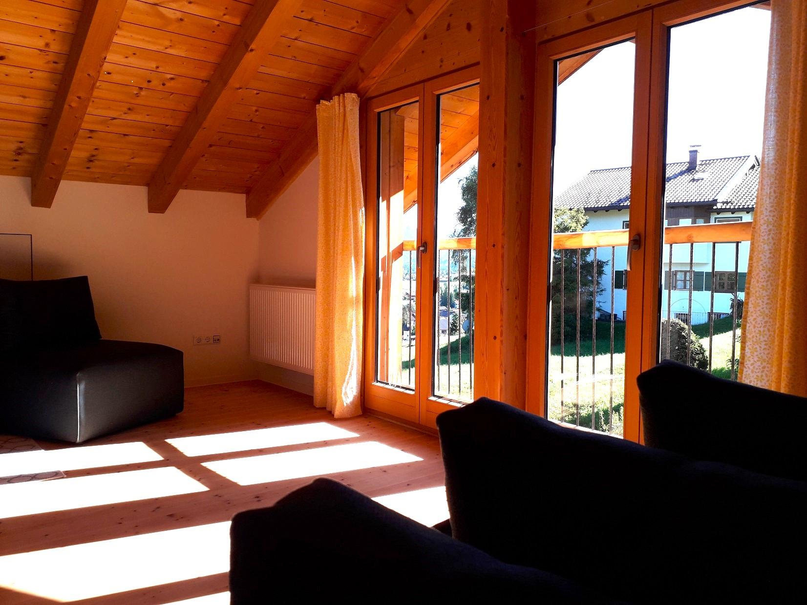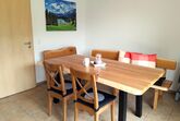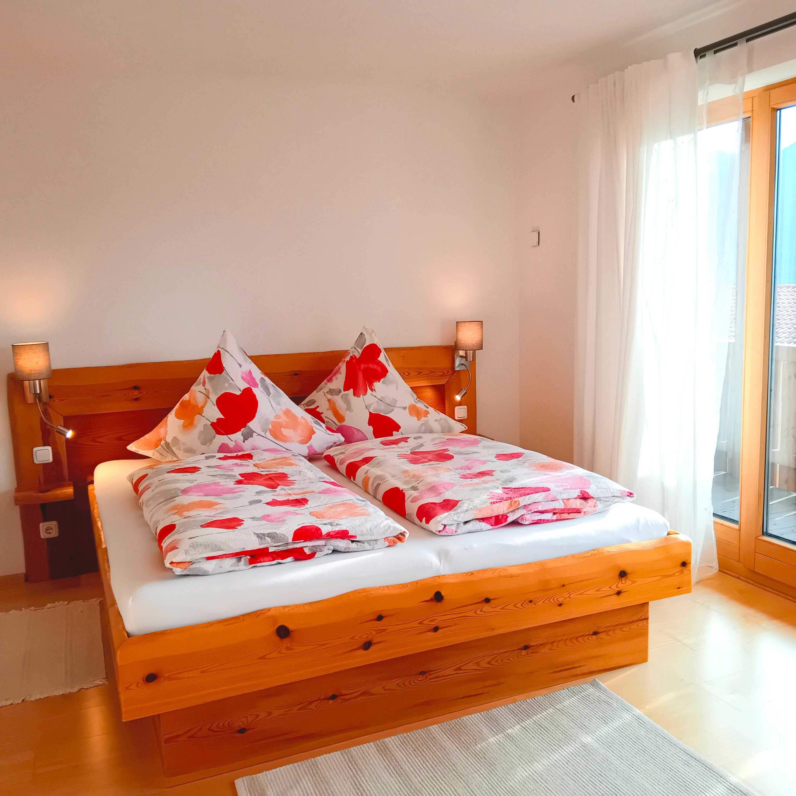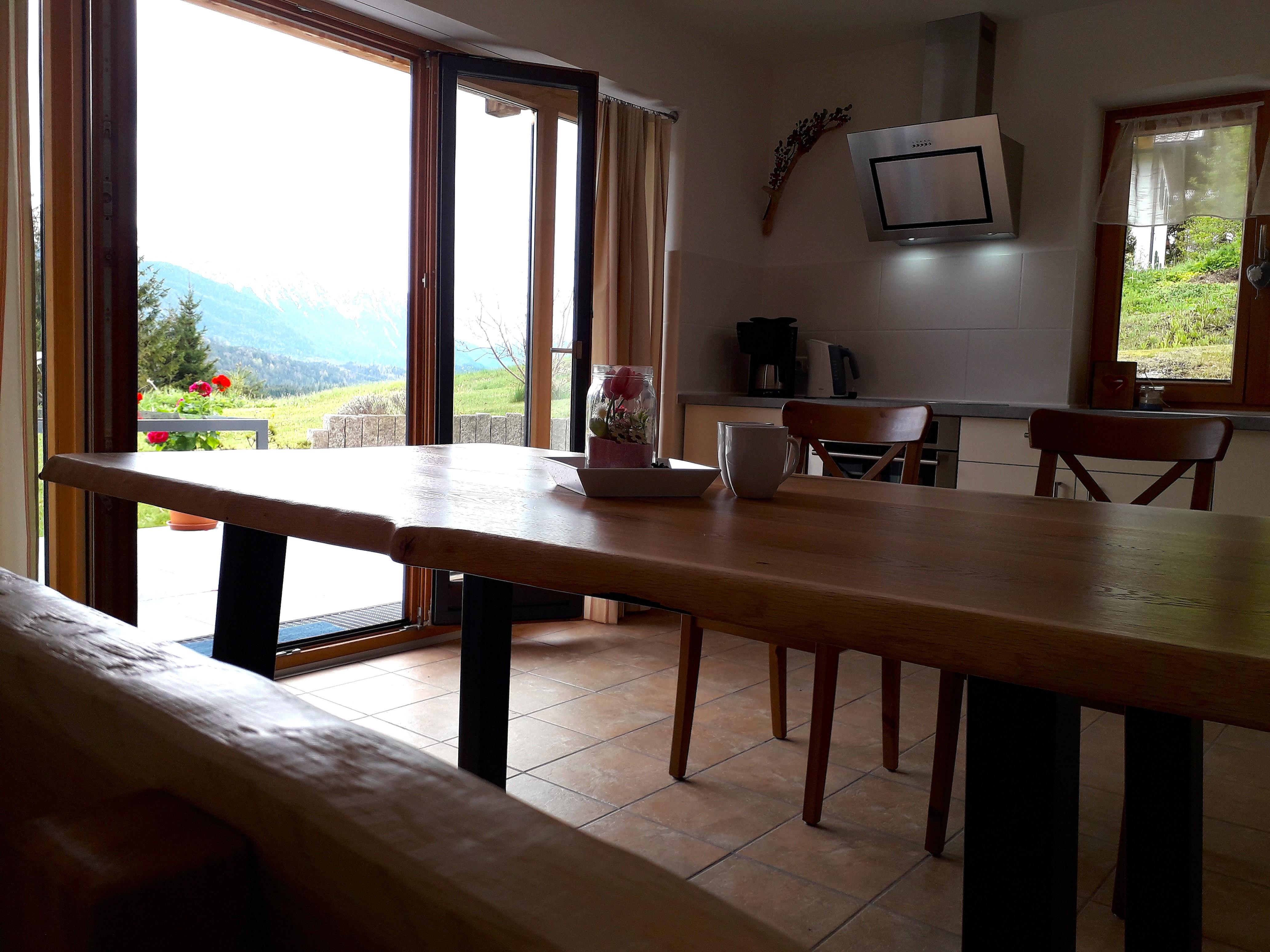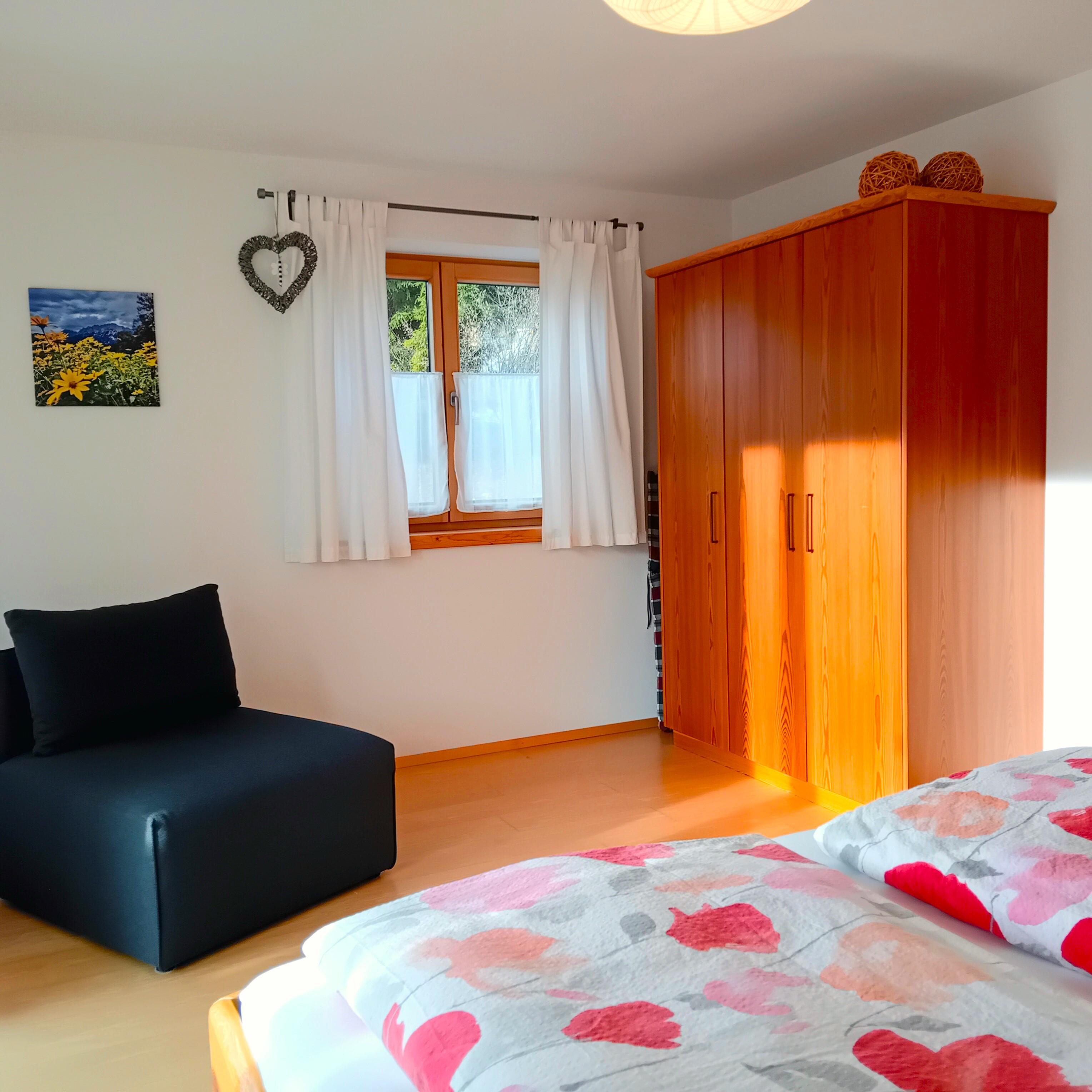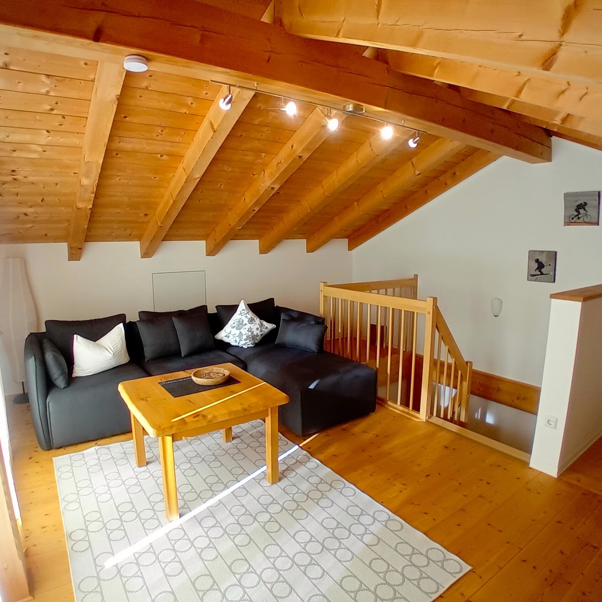 Unsere gemütliche Ferienwohnung mit 100qm bietet Platz für bis zu 4 Personen. Die Ferienwohnung erstreckt sich über 2 Stockwerke und verfügt über 2 separate Schlafzimmer, eine Küche/Esszimmer, ein Galerie-Wohnzimmer, ein Bad/WC sowie einen eigenen Waschkeller und eine eigene Terrasse sowie einen Balkon. Die Küche im Erdgeschoss ist voll ausgestattet mit einem Backofen, Ceran-Kochfeld, Geschirrspüler, Kühlschrank mit Gefrierfach, Toaster, Wasser-, Eierkocher und einer Kaffeemaschine. In der großen Essecke steht ein massiver Holztisch mit Bänken und Stühlen. Von dort haben Sie Zugang zur Terrasse, hier laden gemütliche Gartenmöbel zum Verweilen ein. Im 1. Stock befinden sich 2 separate Schlafzimmer mit jeweils einem Doppelbett und einem Schrank. Auch hier gibt es einen Balkon mit gemütlichen Gartenmöbeln. Das Bad verfügt über eine Dusche sowie ein WC und ein Waschbecken. Im 2. Stock ist ein gemütliches Galerie-Wohnzimmer mit 50-Flachbild-TV sowie einer gemütlichen, großen Couchlandschaft. Im Waschkeller befindet sich eine Waschmaschine sowie ein Trockenraum. Bettwäsche, Handtücher, Badetücher sowie Geschirrtücher sind vorhanden. Ein Kinderbett sowie ein Kinderhochstuhl können wir auf Anfrage gerne zur Verfügung stellen. Es gibt einen überdachten Auto-Stellplatz, sowie einen abschließbaren Garagenstellplatz auf Anfrage (gegen Gebühr). Zudem können Sie Ihre Fahrräder in einer Fahrradgarage abschließen. Gerne können Sie auch den Garten mit Liegewiese und Alpenpanorama-Blick nutzen.