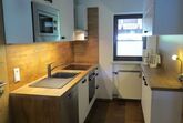 • Offene Kochküche mit Backofen, Mikrowelle, Cerankochfeld mit Abzug, Kühlschrank mit Gefrierfach, Kaffeemaschine, Wasserkocher und Spülmaschine.