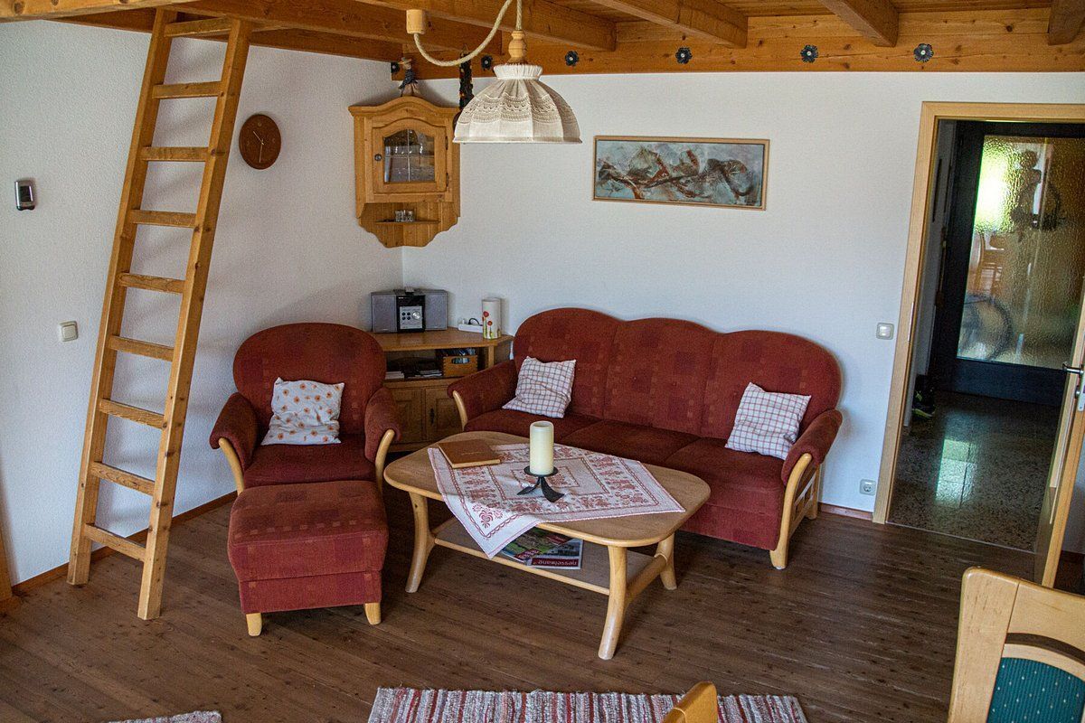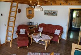 Das Wohnzimmer verfügt außerdem über eine offene Galerie (Benutzung auf eigene Gefahr), die bei Kindern und jung gebliebenen Erwachsenen gleichermaßen beliebt ist. Eine bequeme Sitzgruppe mit Couchtisch und Essecke vervollständigen die Gemütlichkeit des Raumes.