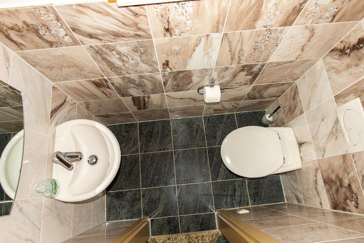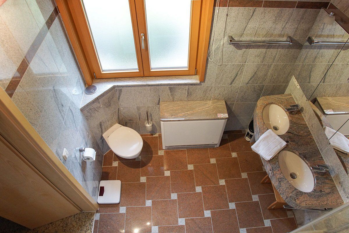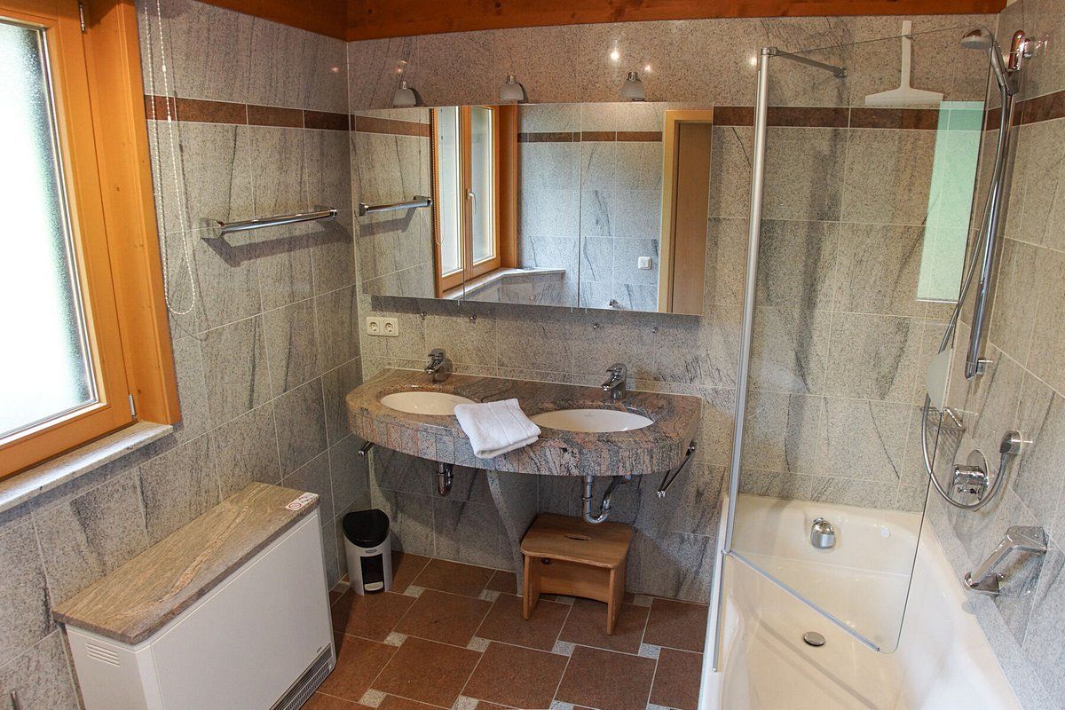 Das ebenfalls in Naturstein gestaltete Bad ist ein weiteres Glanzstück. Ausgestattet ist es mit Badewanne und integrierter Dusche, WC und Waschmaschine.
