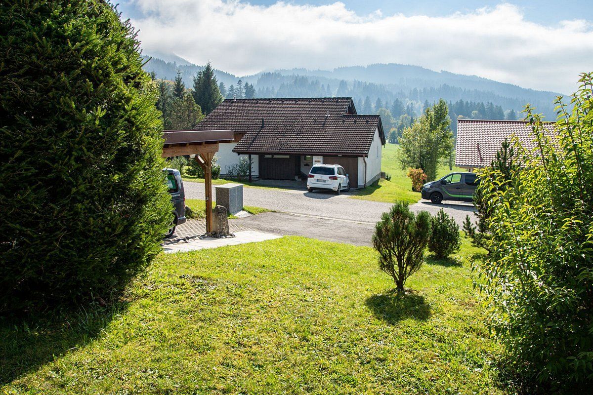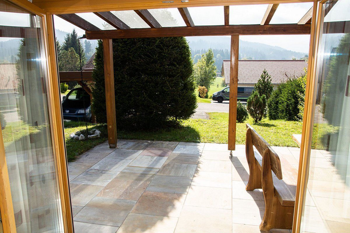 Die große, mit Naturstein gestaltete Südterrasse ist vom Nachbarhaus aus nicht einsehbar und bietet eine gute Sicht auf die Nesselwanger Hausberge und sorgt für Sonnengenuss bis zum Abend. Für sonnige Morgenstunden befindet sich hinter dem Haus eine Sitzgelegenheit für Frühstücksgenießer.