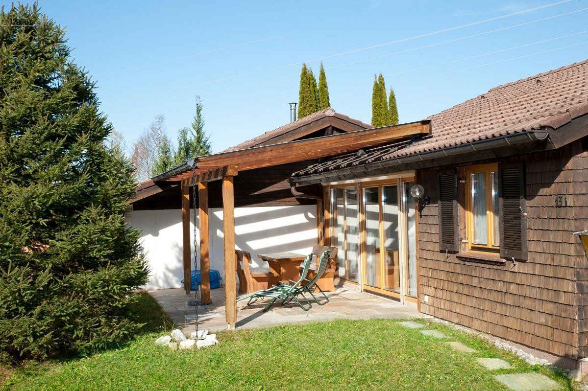 Die komplett renovierte Doppelhaushälfte mit Carport, glasüberdachter großer Sonnenterrasse und einem großen an der Nordseite gelegenen Windfang mit Unterstellmöglichkeit für Kinderwagen, Fahrräder und Ski, liegt im ansteigenden Bereich des Feriendorfes.
