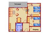 Der Eingangsbereich und das Bad sind gefliest, der Wohnbereich hat einen Linoleumfußboden, in den beiden Schlafzimmern sind hochwertige Teppichböden. Die Räume werden beheizt durch Nachtspeicheröfen. Das Bad wird beheizt über eine Fußbodenheizung und einen Decken-Infrarot-Flächenheizer. Die Küche ist mit Spülmaschine, Cerankochfeld mit Backofen, Mikrowelle und den üblichen Küchengeräten vollständig ausgestattet. Ein Fernseher mit Kabelanschluss, ein DVD-Player und eine Stereoanlage sind ebenfalls vorhanden, genauso wie eine Waschmaschine.