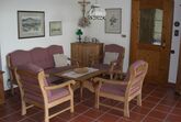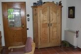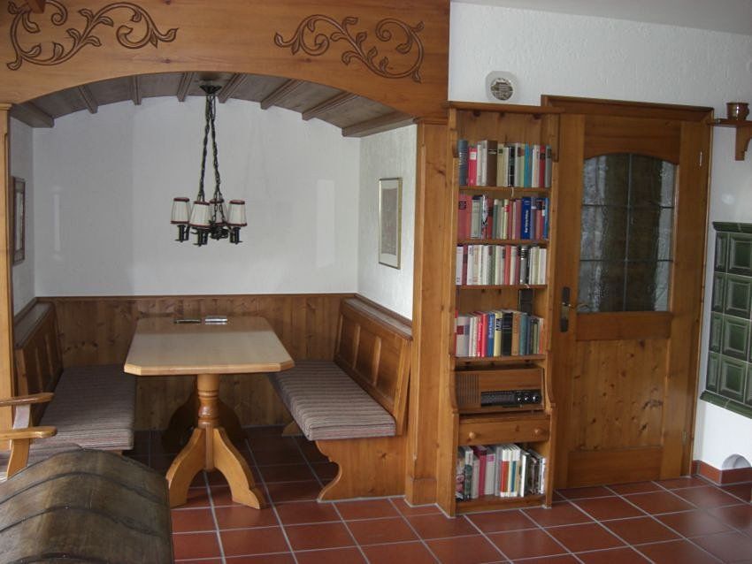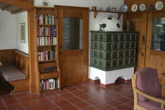 Wenn Sie die Haustür öffnen, finden Sie eine Garderobe und gelangen durch eine Fichtentür in ein 28 qm grosses Wohnzimmer mit gemütlicher Sitzecke, einem alten Allgäuer Bauernschrank, einem kleinen Bücherregal und einem wärmenden Kachelofen. Unter einer bayerischen Holzgewölbe Decke liegt die Essecke für 5-6 Personen.