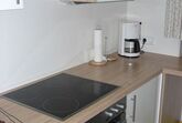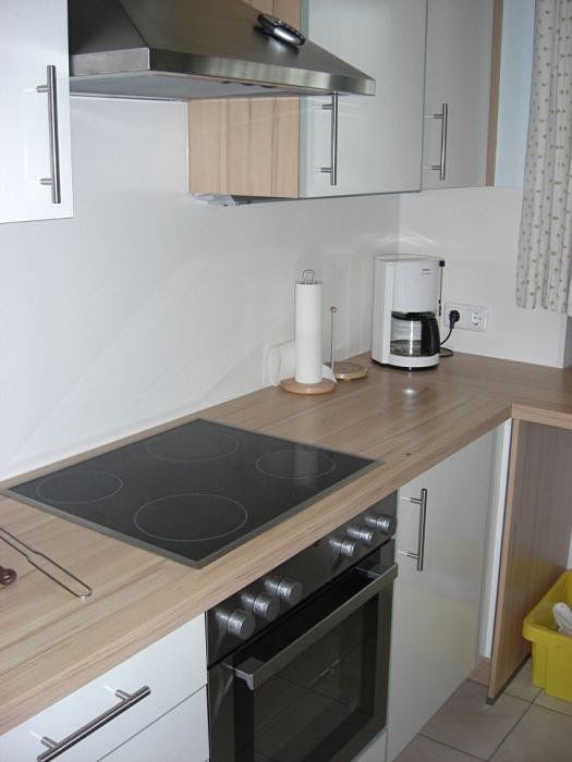 Eine Schiebetür führt in die Küche mit allen modernen Annehmlichkeiten und schönem Essgeschirr.