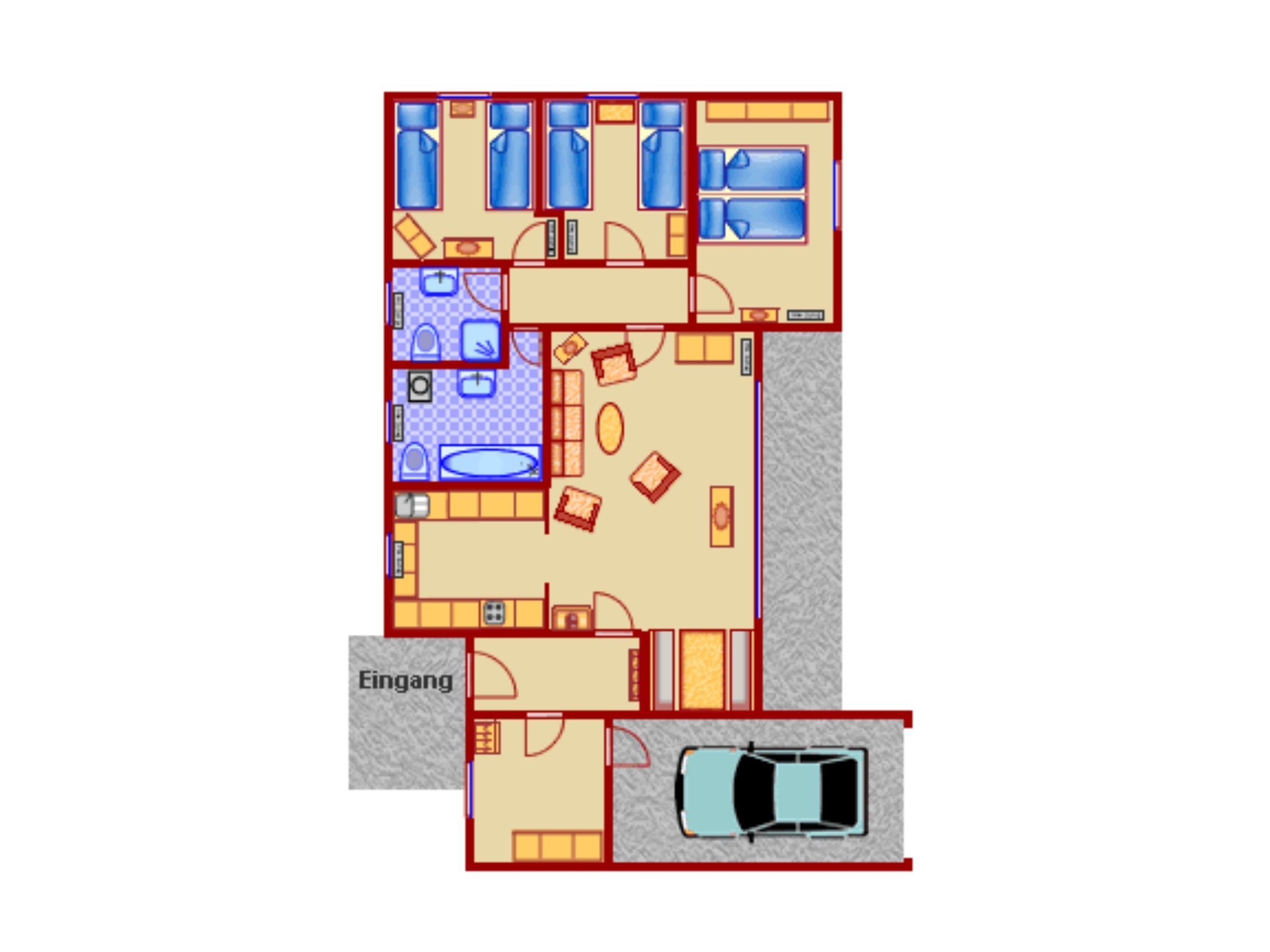 Im hinteren Teil des Hauses befinden sich abgetrennt vom Wohnbereich drei individuell eingerichtete Schlafzimmer mit 6 Betten.
