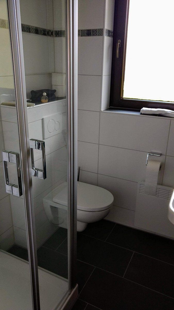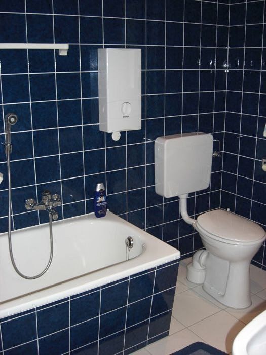 Das Badezimmer in weiss-blau hat Wanne und Waschmaschine, Spiegel und genügend Ablagemöglichkeiten. Die neugestaltete Dusche hat wie das Badzimmer eine Toilette und eine eine Duschkabine.