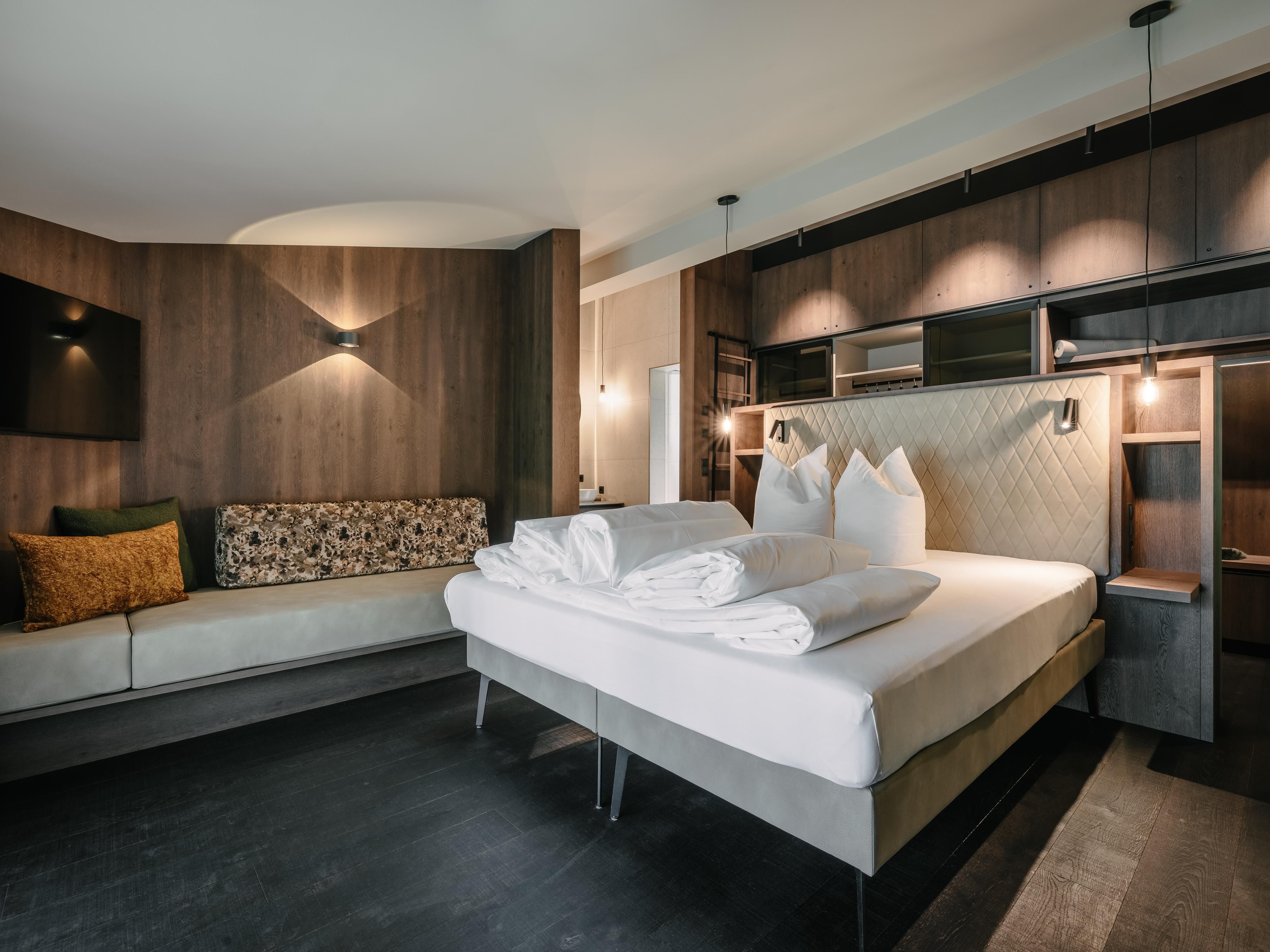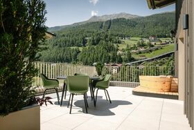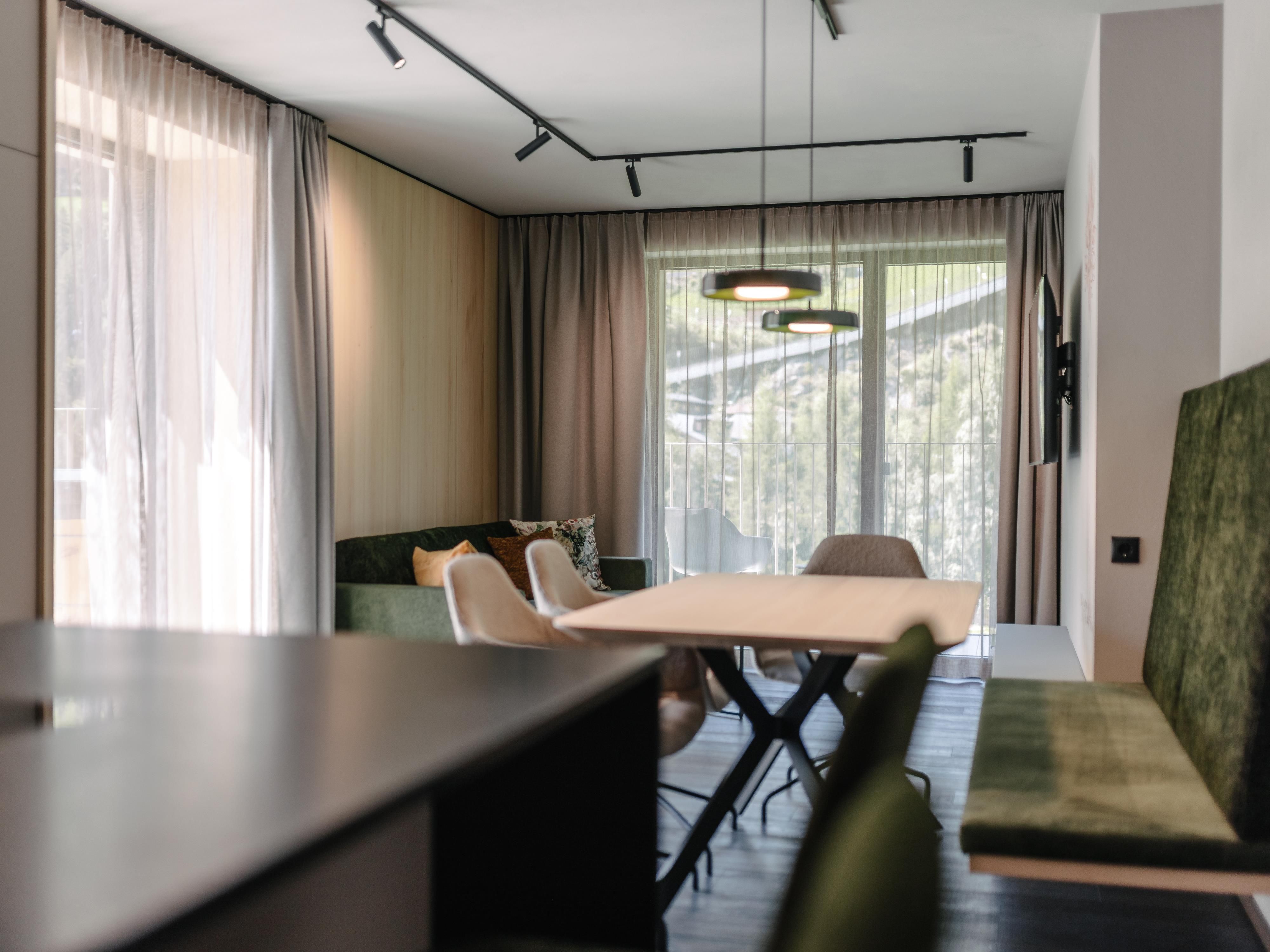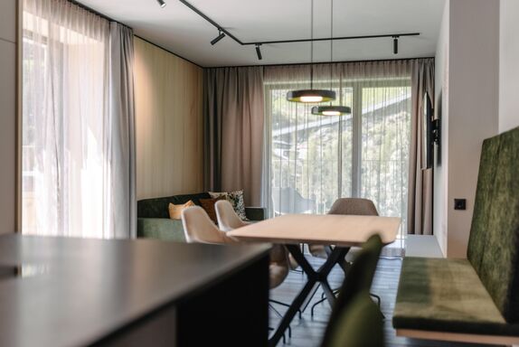 Appartement mit ca. 75 m² und einem großzügigen Balkon oder Terrasse mit Outdoorbadewanne und Bergblick. Weitere Ausstattung: 2 Doppelzimmer mit je eigenem Badezimmer mit Dusche und separatem WC, 1 vollausgestattete Wohnküche (Induktionsherd, Backofen, Kühlschrank, Gefrierfach, Mikrowelle, Nespresso Kaffeemaschine, Geschirrspüler uvm.) mit Essbereich und Sofa, Sprossenwand und Yogamatte.