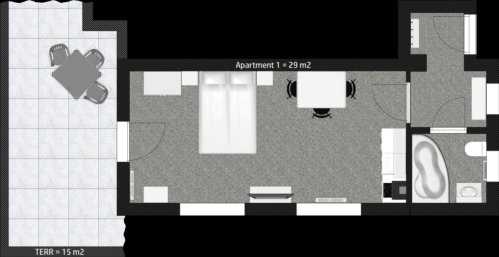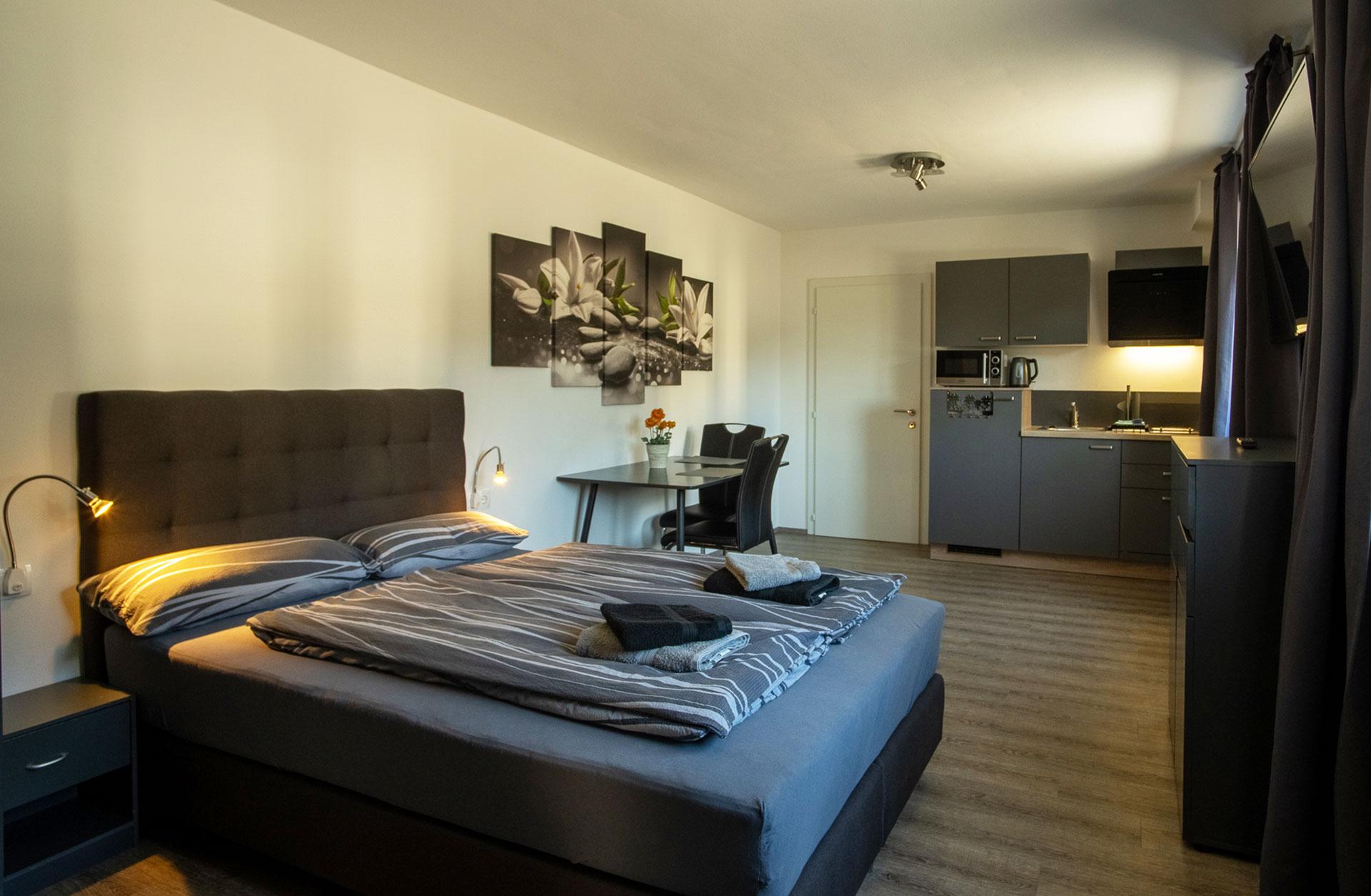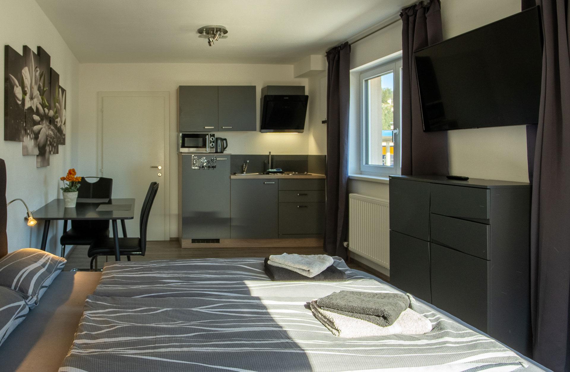 Unser 29m² großes Studio-Apartment ist perfekt für Singles oder Pärchen, die eine komfortable Auszeit genießen möchten. Die moderne Ausstattung umfasst eine voll ausgestattete Küche, ein stilvolles Badezimmer und einen offenen Wohn-Schlafbereich. Entspannen Sie auf der privaten Terrasse und genießen Sie die idyllische Umgebung. Ideal für einen erholsamen Aufenthalt in gemütlicher Atmosphäre!