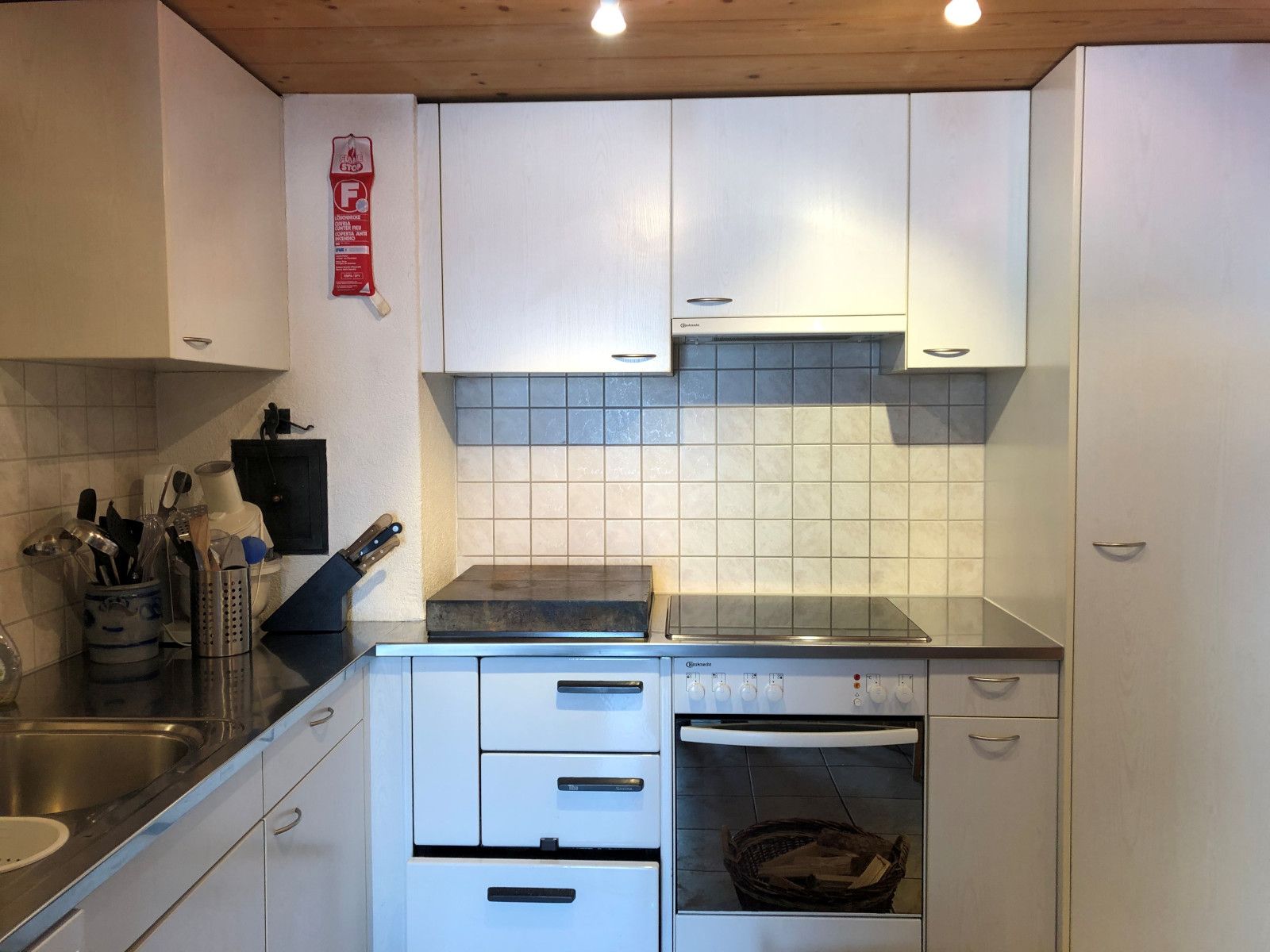 Küche ist komplett eingerichtet. Glaskeramikkochherd plus Holzherd mit Specksteinplatte zum Heizen. Filter Kaffeemaschine, Kühlschrank und Gefrierschrank mit 3 Fächern. Geschirrspüler, Racletteofen, Fondue-Set. Küchenwäsche vorhanden und inklusive.Badezimmer: