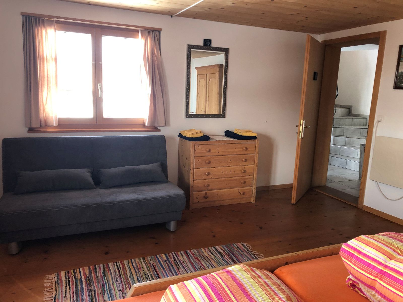 1 Badezimmer mit Badewanne und Dusche, Lavabo und WC. Ein separates WC im Parterre. Waschmaschine und Tumbler im Untergeschoss in der Waschküche zur Mitbenützung gegen Gebühr (CHF 3.50 pro Waschgang).