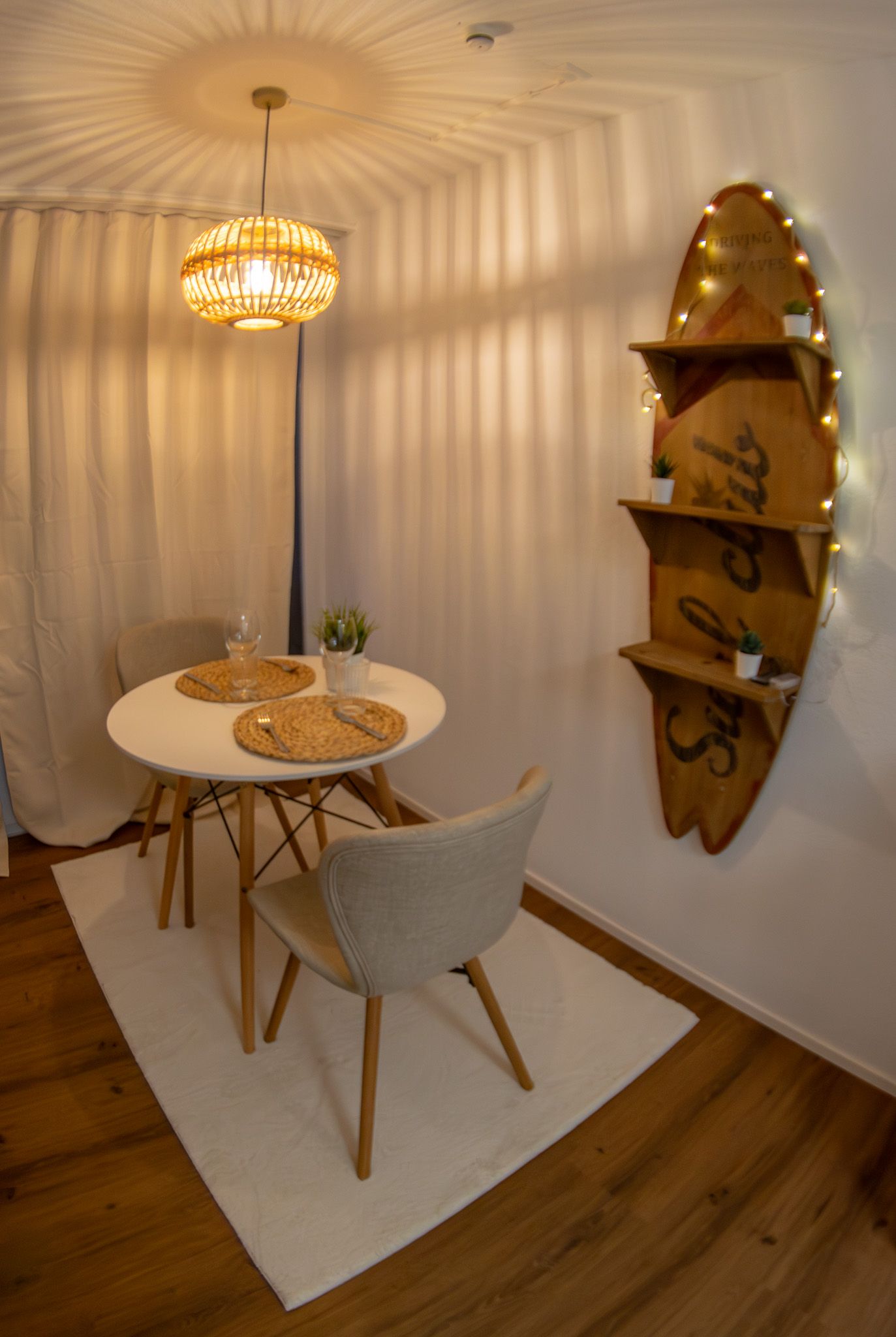 Das Interieur des Studios besticht durch seine durchdachte Einrichtung, die sowohl funktionell als auch einladend ist. Dank der integrierten Fußbodenheizung herrscht in jedem Winkel ein angenehm warmes Klima. Für kulinarische Eigenkreationen ist die Küchenzeile mit einem 2-Platten-Induktionsherd, einer Kapsel-Kaffeemaschine und einem Wasserkocher hervorragend ausgestattet. Der essbereich bietet eine behagliche Ecke, um Ihre Mahlzeiten in aller Ruhe zu genießen.