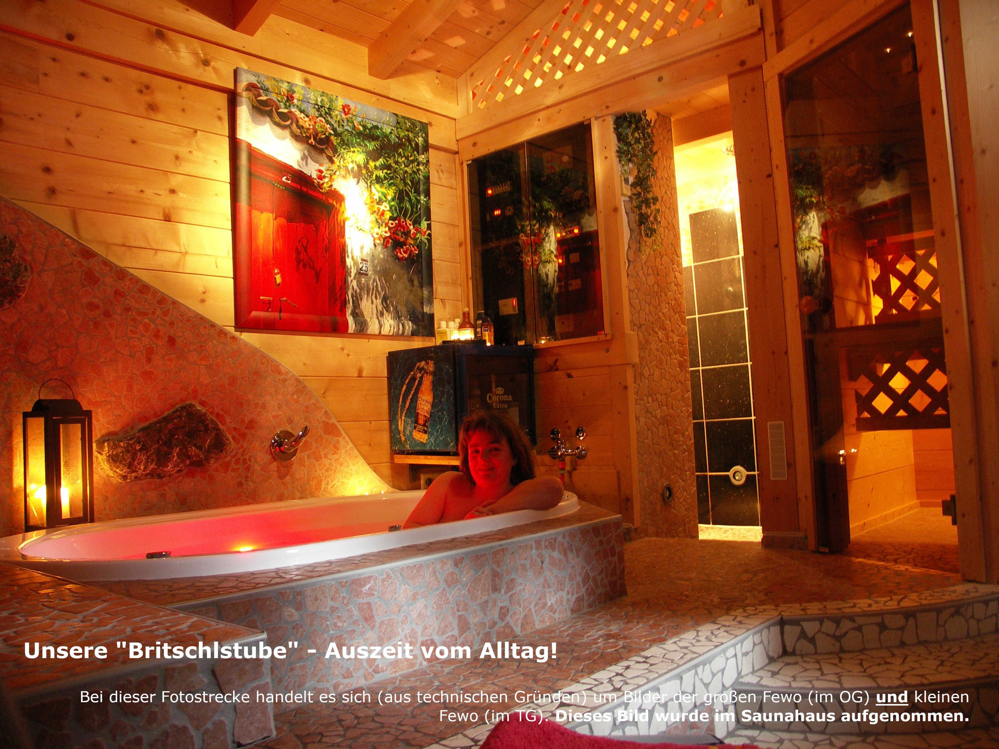 Übrigens: Unsere „Britsch'l-Stube“ (Holzblockhaus mit Sauna, Whirlpool, Lichttherapie etc.) wird separat für Sie angeheizt. Was gibt es schöneres, als 3-4 Std. zu zweit, bei stimmungsvoller Musik,  in eine andere Sphäre zu gleiten.