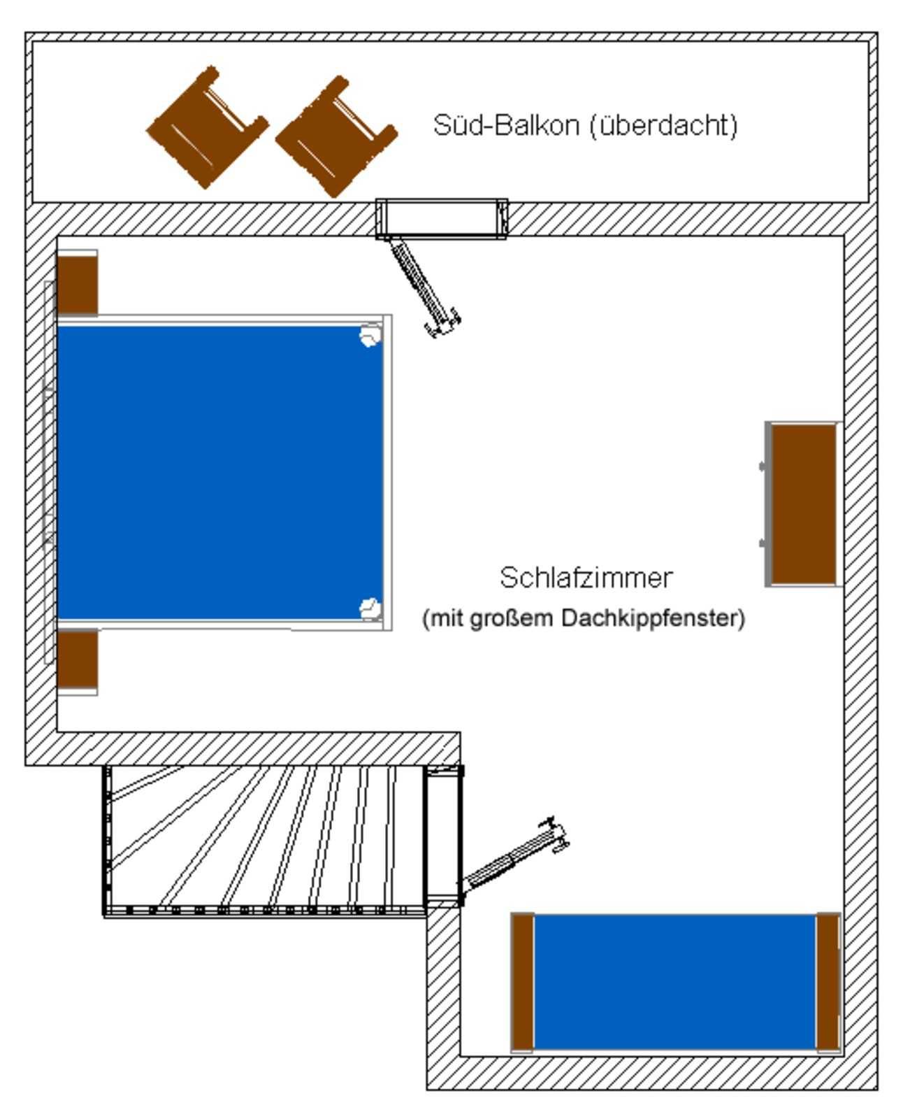 Telefon, SAT-TV (im Schlafzimmer und Wohnzimmer), Internetzugang im Apartment. Großer Freisitz, beide Balkone im Schlaf- und Wohnzimmer sind nach Süden ausgerichtet. Doppelbett  im 2. Stock unter dem Dach.