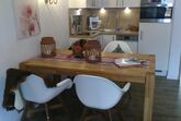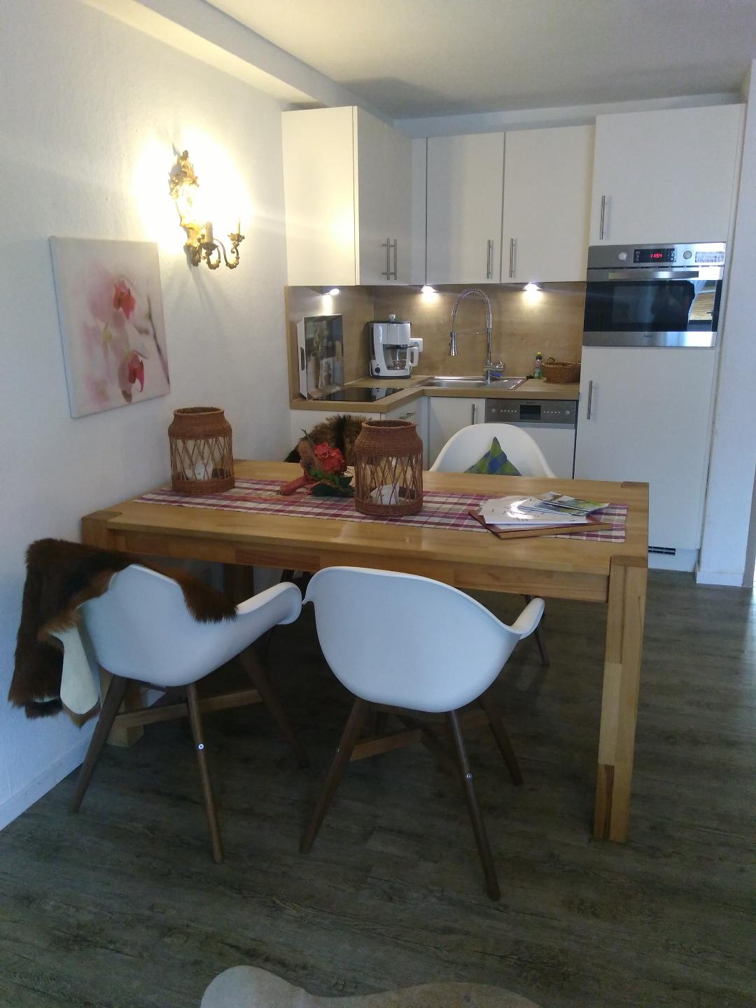 Schöne 2-Zimmer-Ferienwohnung Alpenglühen für 2-4 Personen mit Boxspringbett im Schlafzimmer Wohn/Schlafzimmer mit neuer Küche in Magnolie Back/Mikro, Spülmaschine, Eßgruppe, Wohngruppe, Süd/Westbalkon mit Blickrichtung Walsertal, Du/WC, Balkon