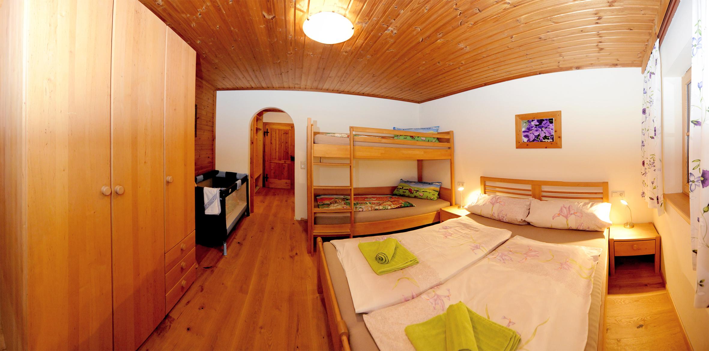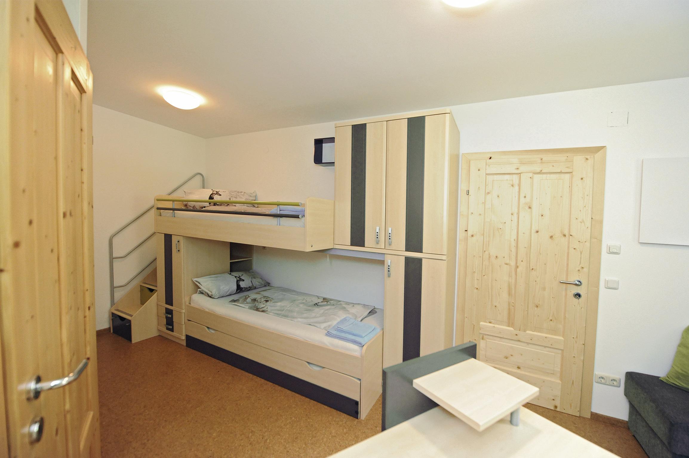 Wohn-Küche, 1 Zimmer mit Doppelbett und Stockbett, 1 Zimmer mit 1 Stockbett und Zusatzbett, Babybett in jedem Zimmer zustellbar