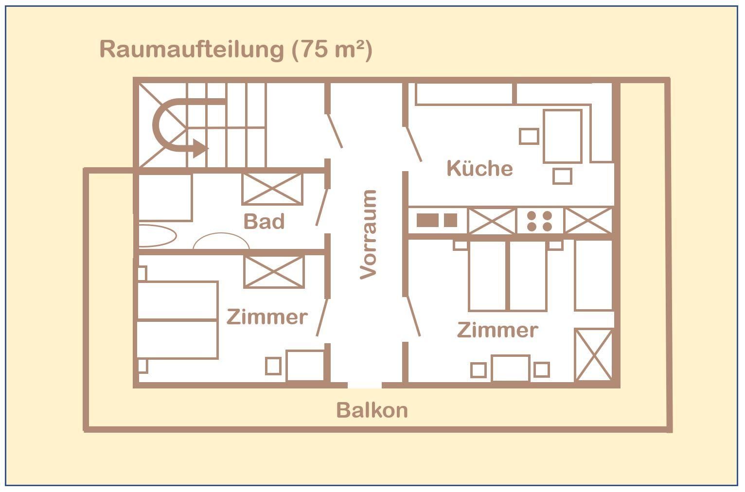 Die Ferienwohnung ist mit 75 m² äußerst geräumig. Es stehen zwei Schlafzimmer, eine große Wohnküche, ein Badezimmer sowie ein Vorraum zur Verfügung. Die Küche ist großzügig ausgestattet und verfügt über einen Kochherd, Kühlschrank, Mikrowelle, Kaffeeautomat, Geschirrspülmaschine und ausreichend Ess- und Kochgeschirr. Im Badezimmer liegen neben Dusche, WC und Waschmöglichkeit auch Handtücher sowie ein Haartrockner bereit. Die Schlafzimmer haben jeweils zwei große Doppelbetten.