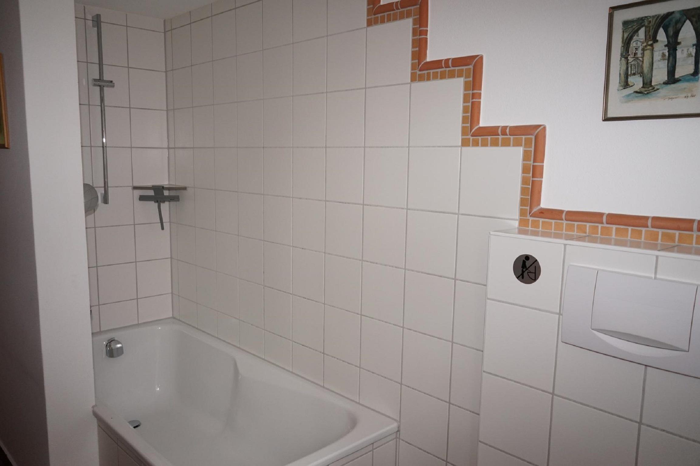 Das Schlafzimmer ist mit einem Zirbenholz-Doppelbett, Schreibtisch und Kleiderschrank modern eingerichtet. Das Badezimmer verfügt über eine Badewanne, Spiegel, Regale und Handtuchtrockner runden das Gesamtbild ab.