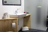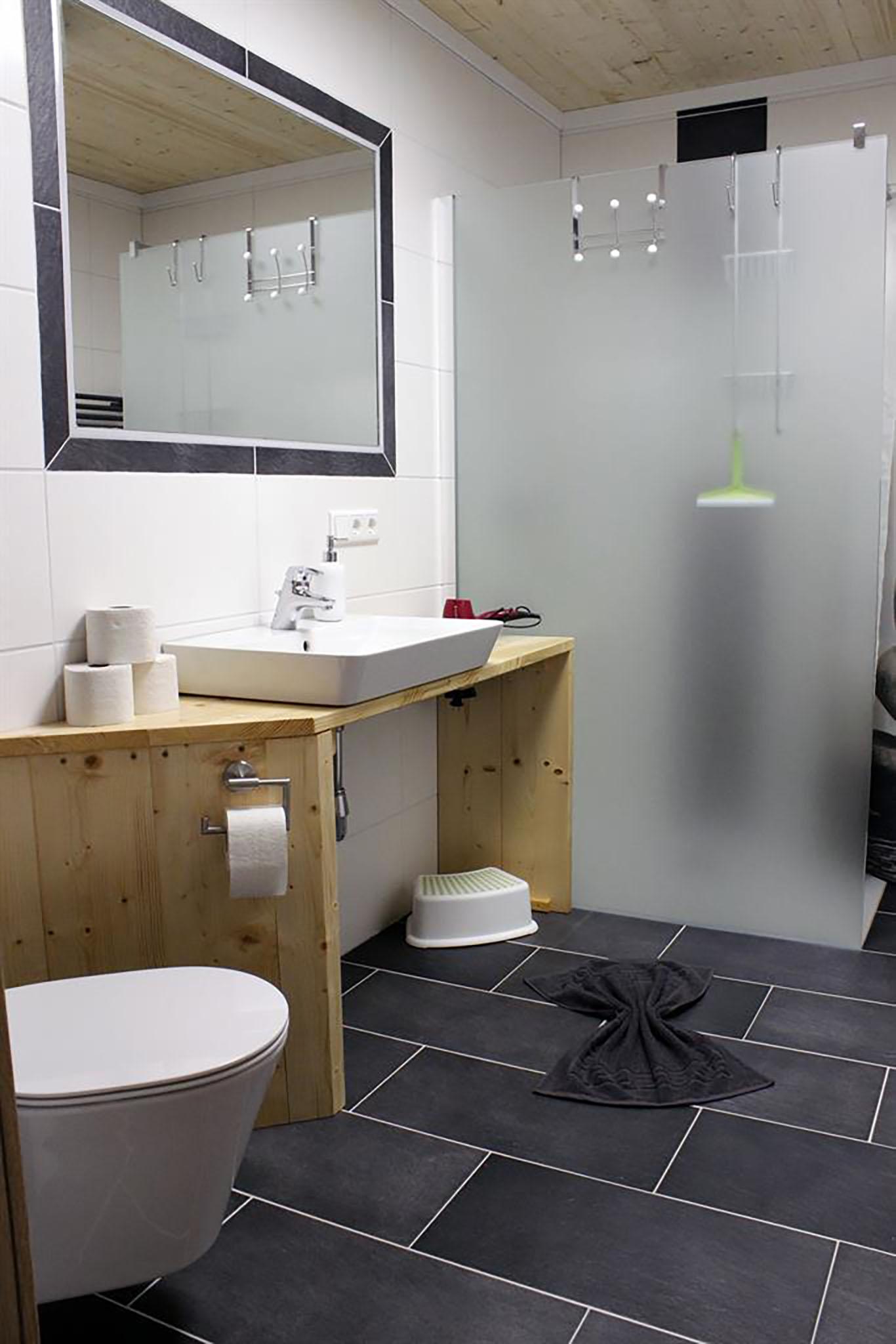 Das Bad hat eine geräumige Dusche, einen Waschtisch und WC. Ein Fön, Seifenspender und Hand-/Badetücher sind ebenfalls vorhanden.