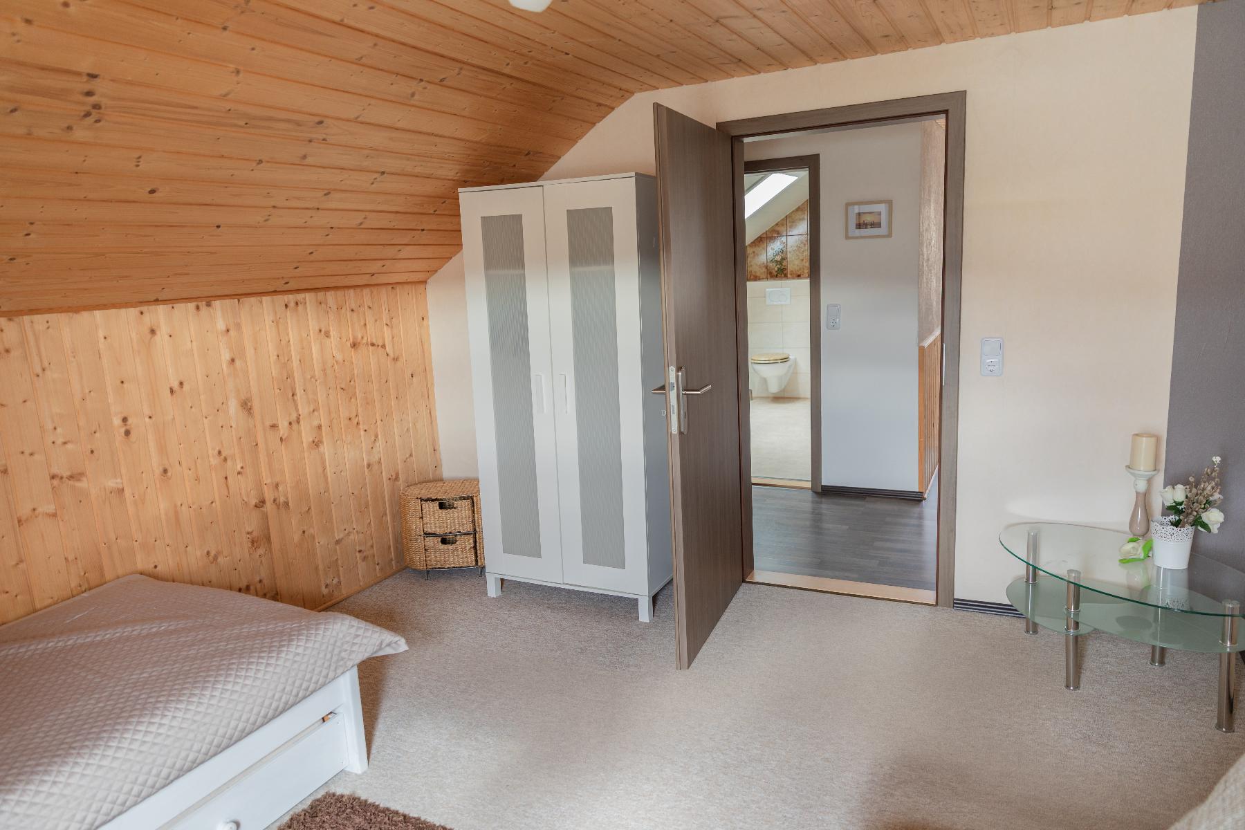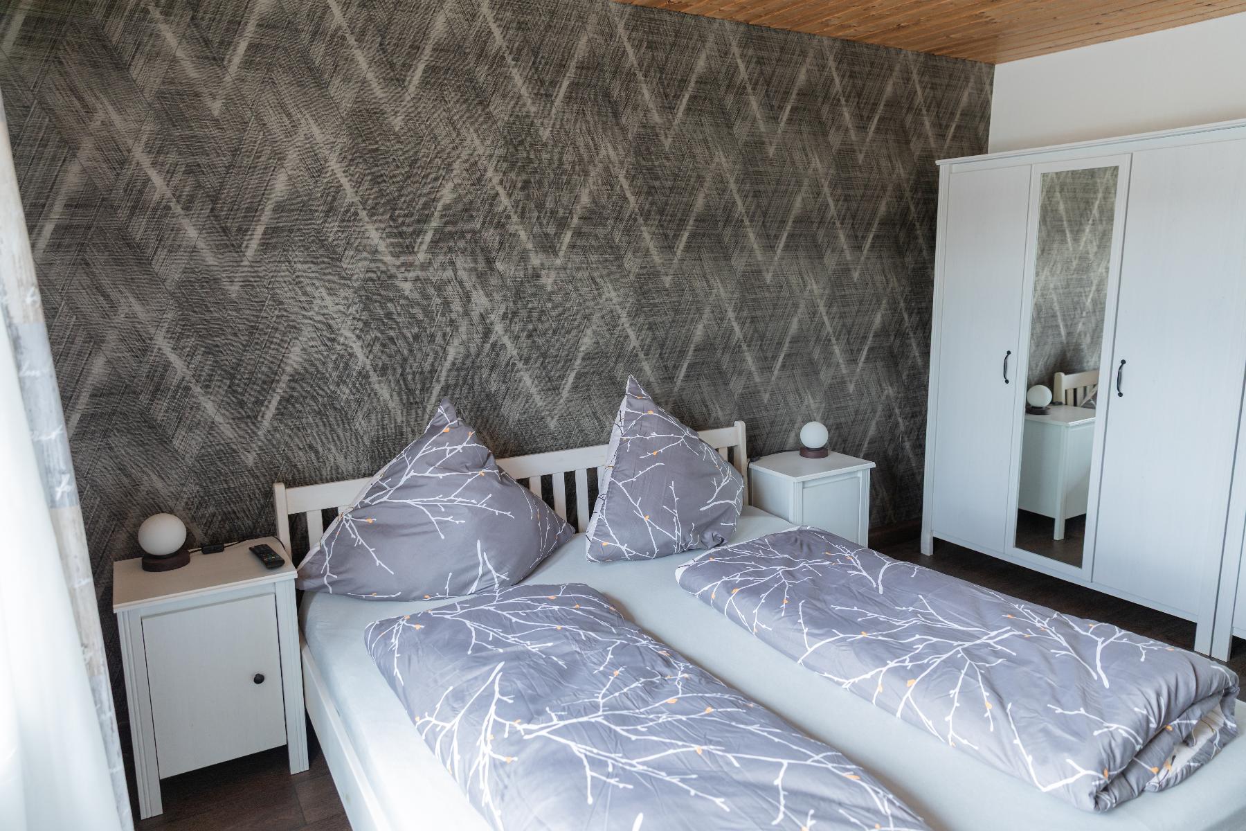 Im erstem Stock befinden sich zwei weitere Schlafzimmer auf 45 qm mit einem Doppelbett und einem einfachem Bett als Schlafmöglichkeit. Für zusätzlichem Stauraum gibt es einen Kleiderschrank und Nachttische mit Leselampen. Ebenfalls in der oberen Etage befindet sich ein Badezimmer mit Waschtisch, WC und einer Dusche.